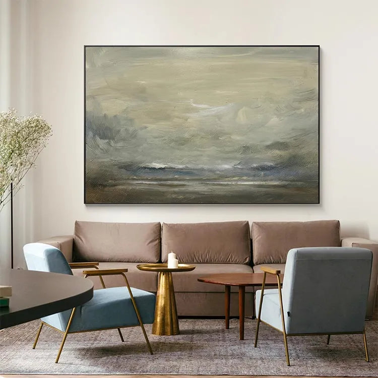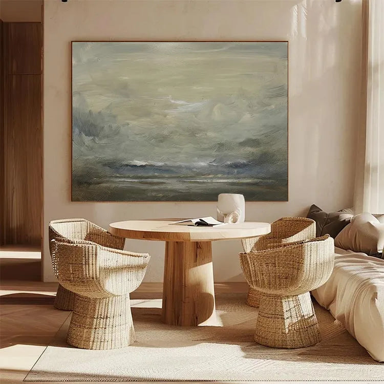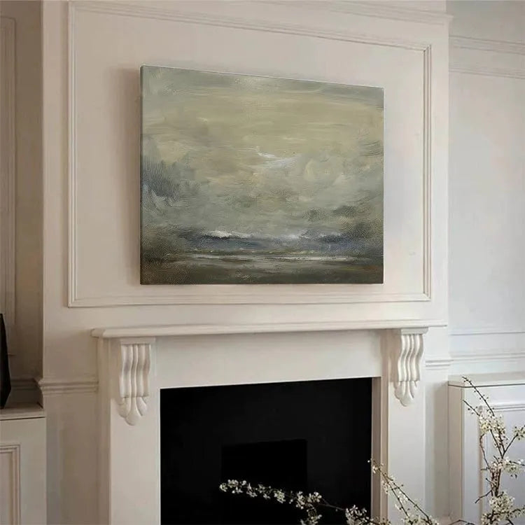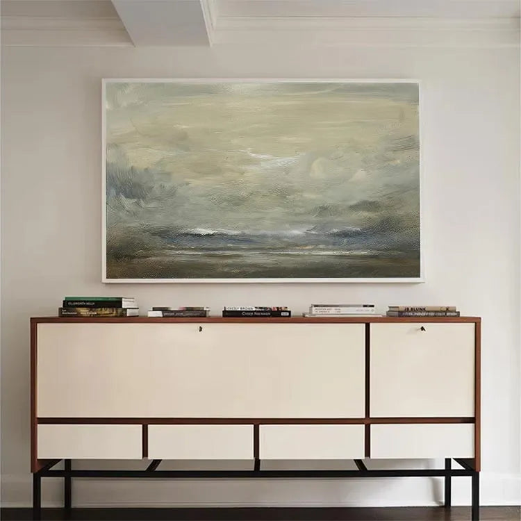 This oil painting features a minimalist, abstract landscape with a focus on atmospheric effects. The composition employs a restrained color palette dominated by muted greens, grays, and whites, creating a somber, contemplative mood. The brushstrokes are broad and textured, with visible, sweeping motions that suggest the movement of clouds and water. The use of light is subtle, with a diffuse, overcast quality that permeates the entire piece, enhancing the ethereal, almost melancholic atmosphere. The painting's style aligns with the Abstract Expressionism movement, emphasizing emotional response over representational accuracy. The textured brushwork and restrained color choices convey a sense of depth and complexity, inviting viewers to interpret the scene through their own experiences and emotions.