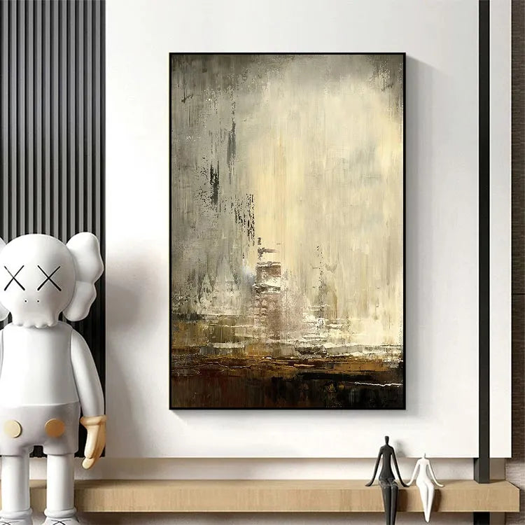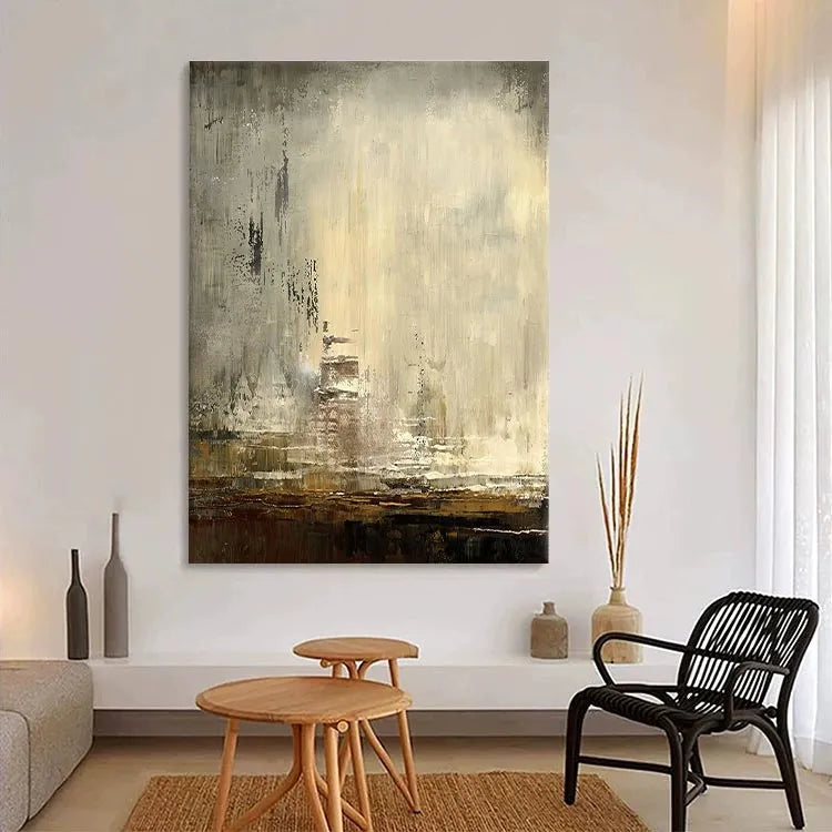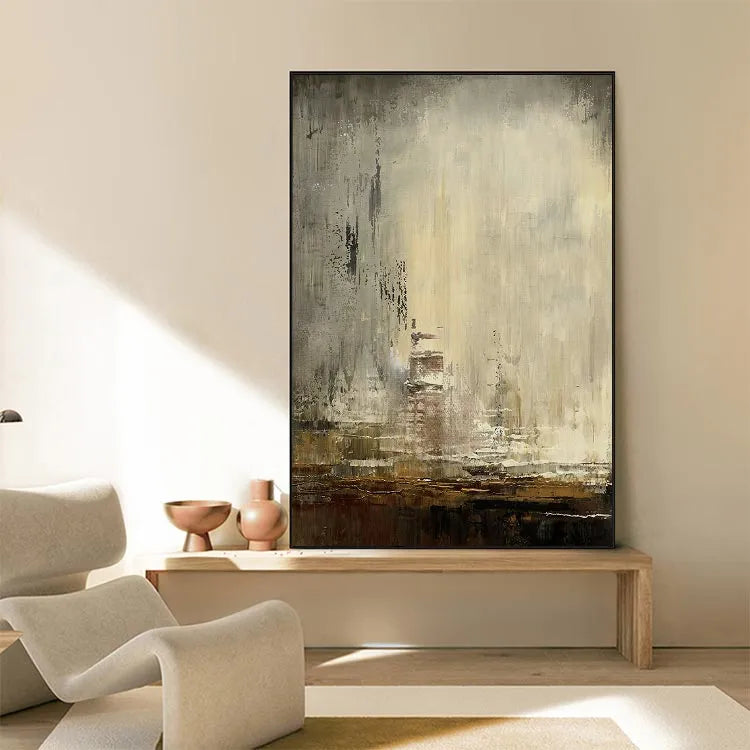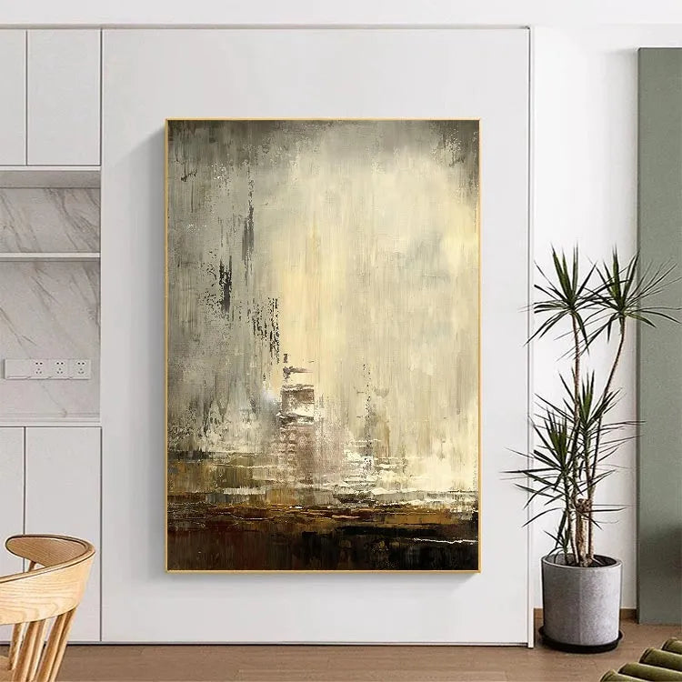 This painting exhibits a minimalist, abstract style with a focus on texture and subtle color variations. The composition features a weathered, almost industrial-looking wall, with visible brushstrokes and layers of paint that create a textured, worn surface. The color palette is muted, with shades of beige, gray, and brown, suggesting a sense of age and decay. The use of light is subtle, with a soft gradient that adds depth without drawing attention away from the texture. The brushstrokes are varied, from thick, almost impasto applications to finer, more delicate strokes, adding a sense of movement and history. This work could be associated with the Abstract Expressionism movement, emphasizing emotional and tactile qualities over representational forms. The overall effect is one of quiet, introspective contemplation, inviting the viewer to explore its textured, layered surfaces.