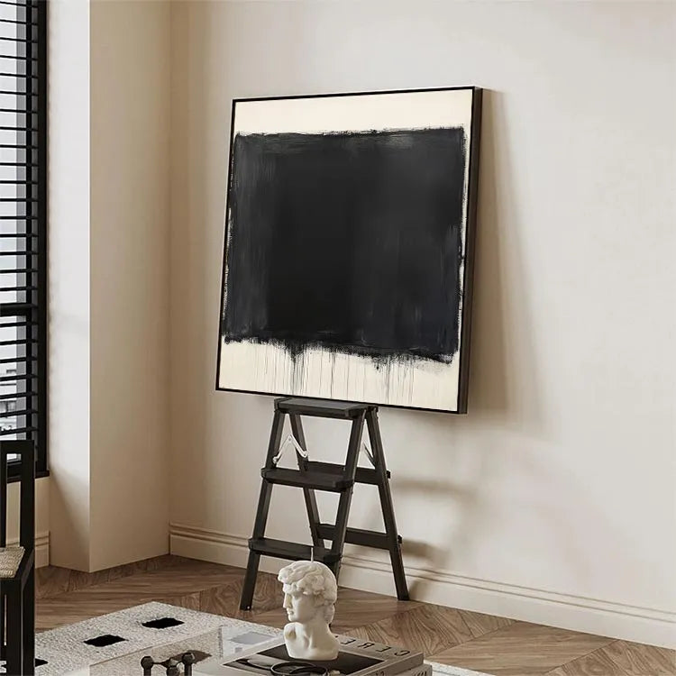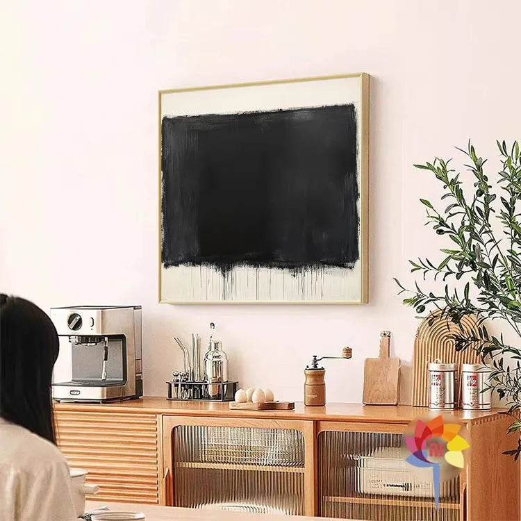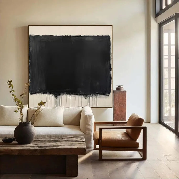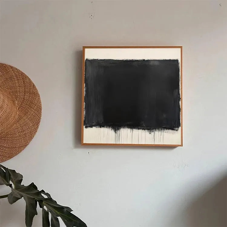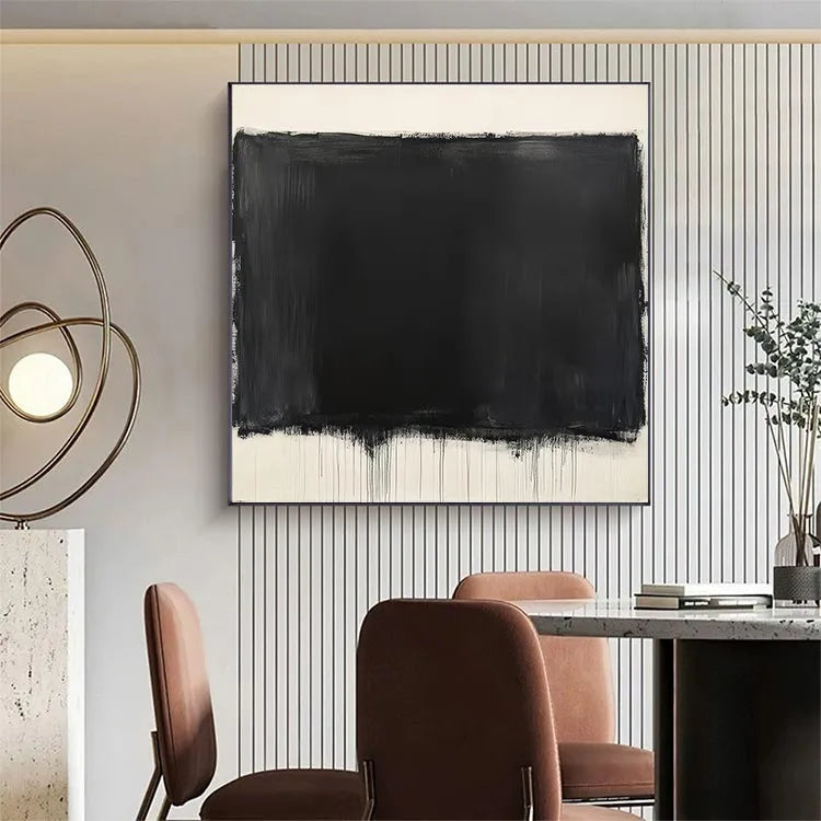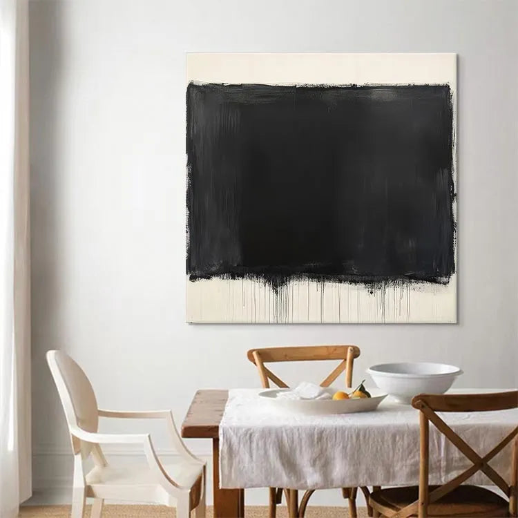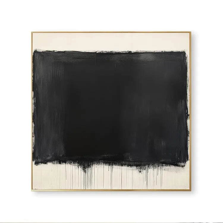 This painting, characterized by its minimalist and abstract style, employs a monochromatic palette dominated by deep black and subtle white accents. The rectangular black field, with its rough, textured edges, creates a stark contrast against the pristine white background. The black area's central density gradually transitions to lighter shades towards the edges, suggesting a subtle gradient. The dripping white lines at the bottom add a dynamic, almost ephemeral quality, enhancing the painting's sense of movement and fragility. The overall composition is reminiscent of the Abstract Expressionism movement, with its emphasis on emotional expression and spontaneous technique. The interplay between light and dark, texture and space, evokes a sense of introspection and mystery.