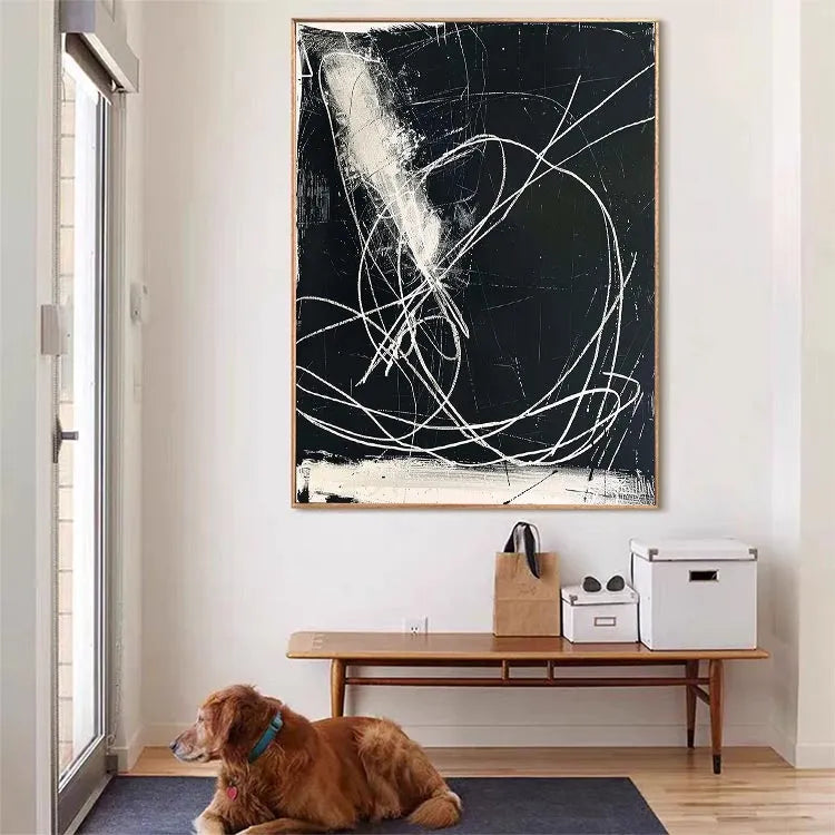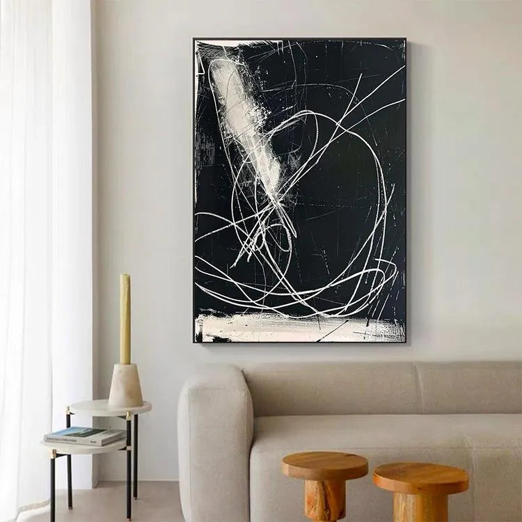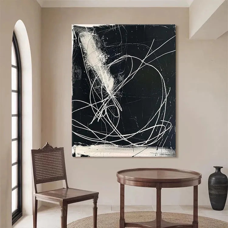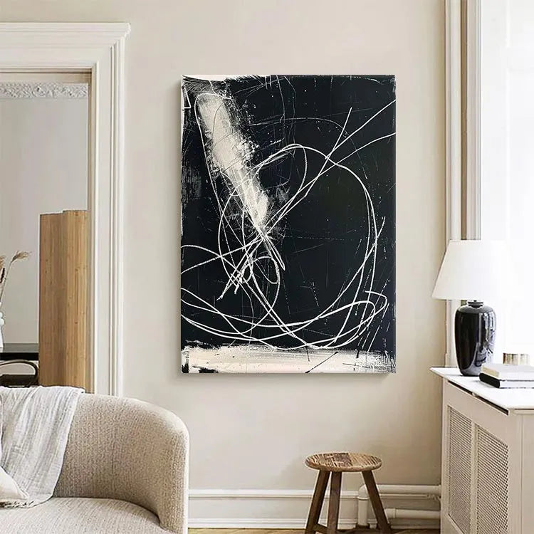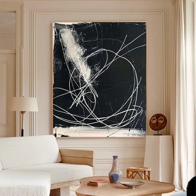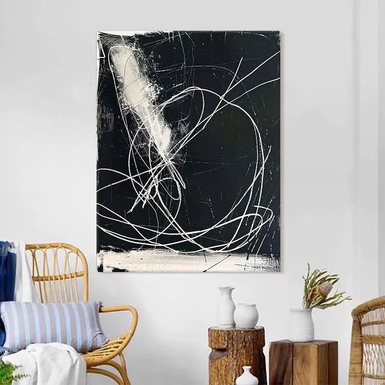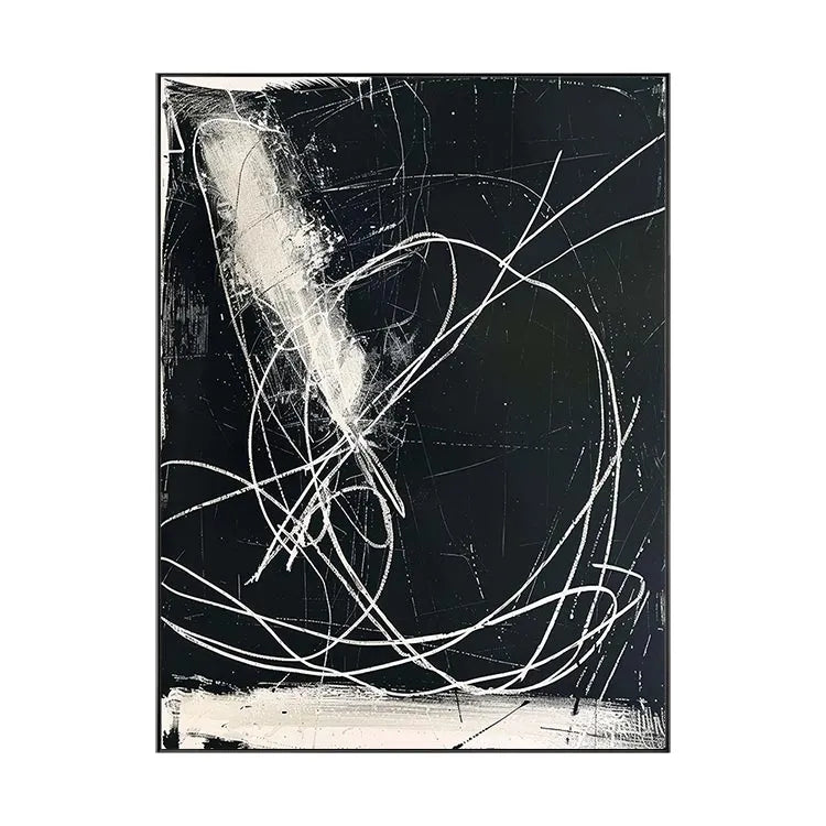 This abstract painting features a dynamic interplay of white, scratched lines against a deep black background. The composition is characterized by its chaotic yet deliberate arrangement, with intersecting and overlapping lines creating a sense of movement and tension. The texture of the white lines, which appear to be both scratched and drawn, adds a tactile quality to the piece. The use of color is minimalistic, relying on the stark contrast between white and black to evoke a sense of depth and space. This work belongs to the Abstract Expressionist movement, with its emphasis on spontaneous creation and emotional expression. The rough, almost chaotic texture of the lines suggests a struggle between order and disorder, symbolizing the complexity of human experience.