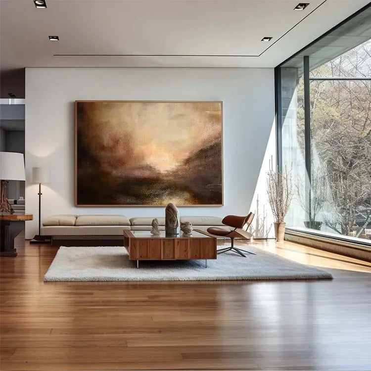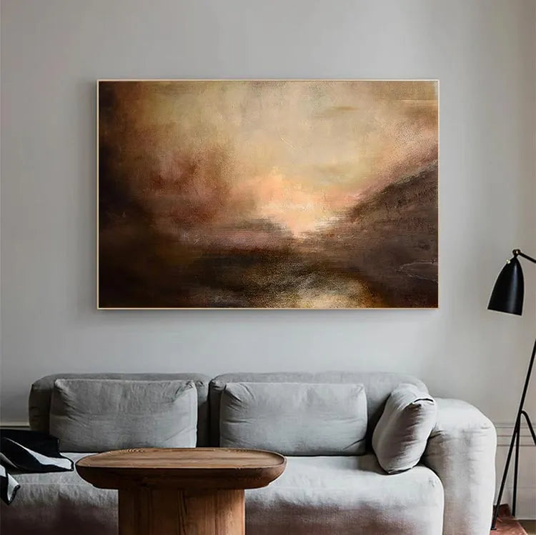 This oil painting exemplifies a minimalist and abstract style, with a focus on atmospheric and emotional effect rather than detailed representation. The composition is dominated by a subtle, gradient transition from dark, earthy browns on the left and right to a softer, warmer light in the center. The use of color is restrained yet effective, with muted reds, browns, and golds creating a sense of depth and warmth. The texture is rough and impasto, adding a tactile quality to the surface. The light source, located centrally, suggests a sunrise or sunset, invoking a sense of tranquility and introspection. The painting's style aligns with the Abstract Expressionism movement, emphasizing emotional expression and the subconscious. The brushstrokes are diffuse and layered, contributing to the overall sense of ambiguity and mystery.