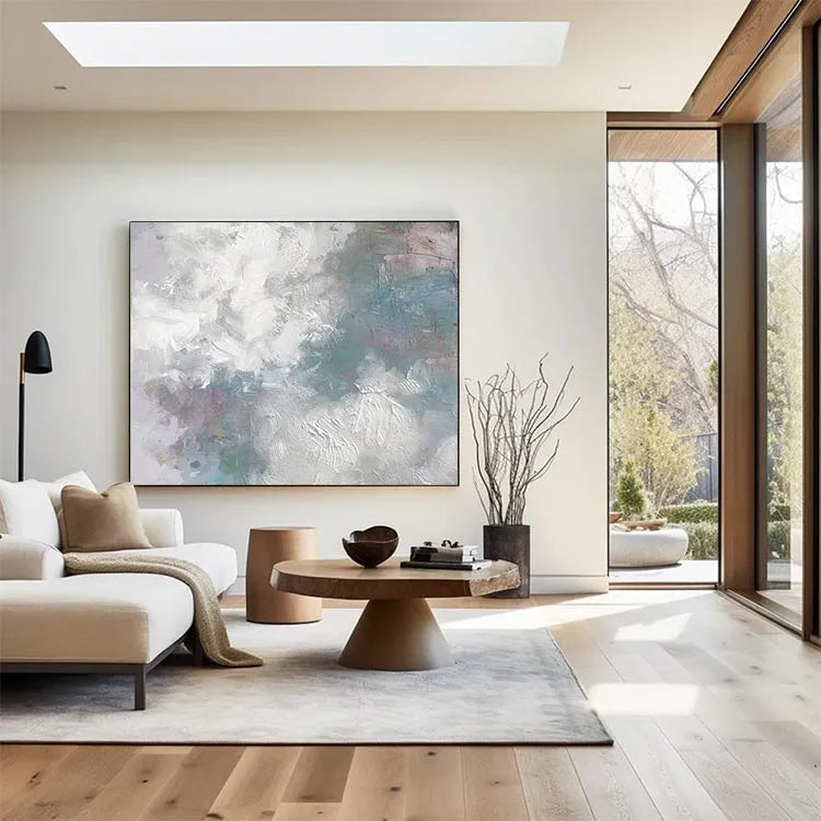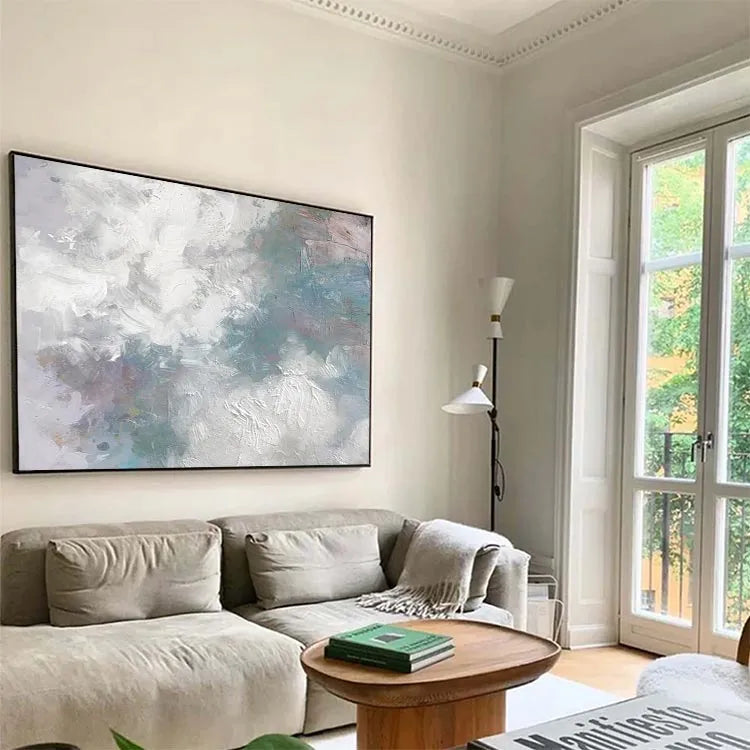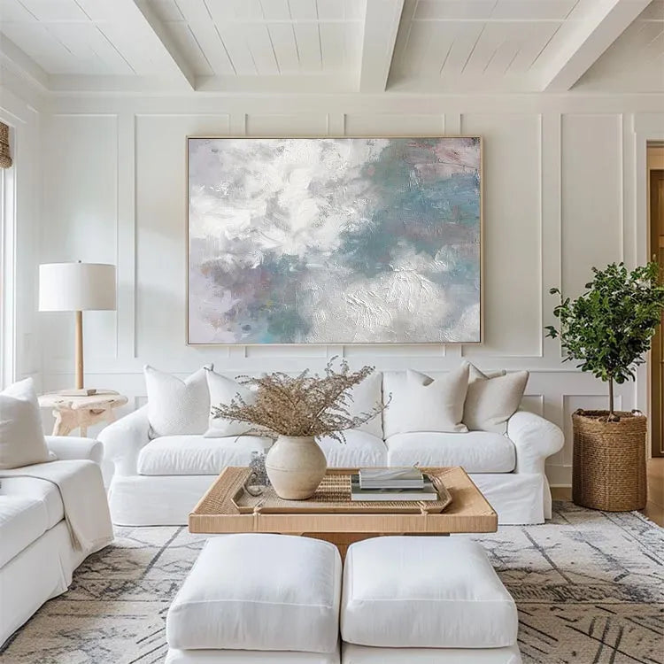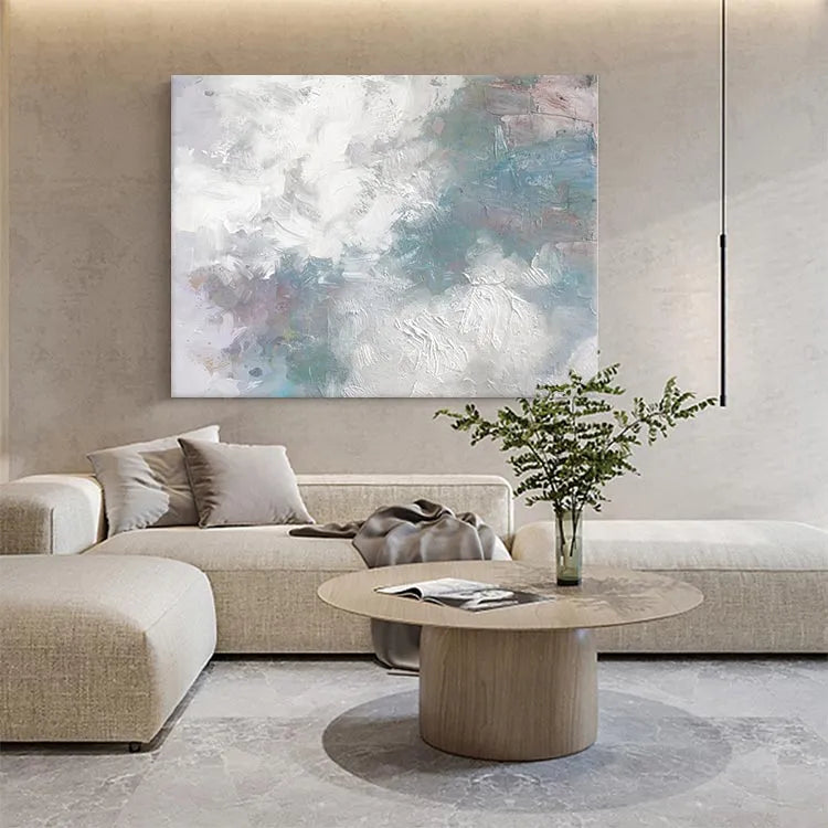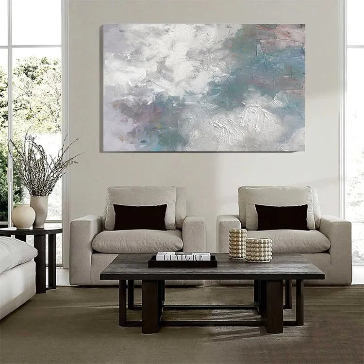 This oil painting showcases a textured, abstract composition characterized by its dynamic brushstrokes and subtle color palette. The dominant use of white and light gray creates a sense of movement and depth, while patches of blue, green, and pink introduce a delicate, almost ethereal quality. The thick, textured application of paint suggests a tactile, almost three-dimensional surface. The interplay between light and dark areas, as well as the varied brushstrokes, evokes a sense of fluidity and spontaneity, reminiscent of the Abstract Expressionist movement. The painting's restrained yet evocative use of color and texture invites the viewer to ponder its symbolic potential, potentially exploring themes of nature or the subconscious.