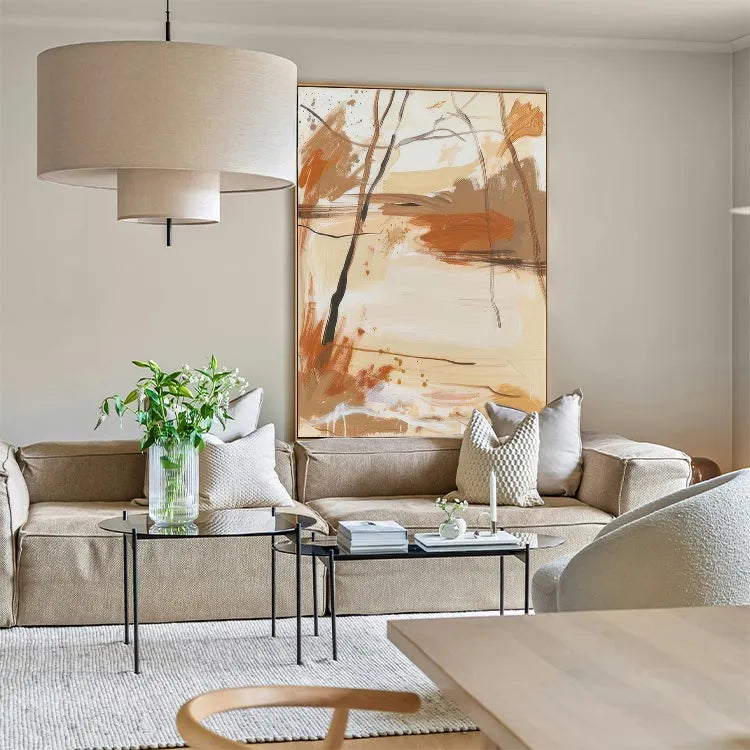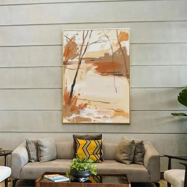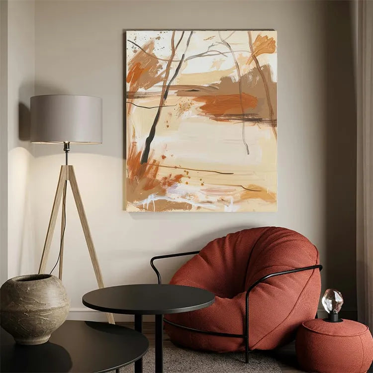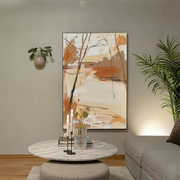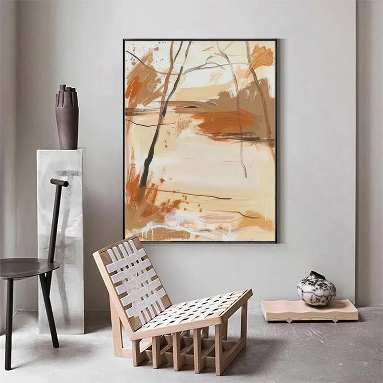 This abstract painting employs a restrained yet expressive color palette dominated by warm browns, rusts, and creamy whites. The composition features delicate, almost skeletal black lines intersecting with broad, textured brushstrokes, creating a sense of fragile, barren trees against a softly lit landscape. The use of color and texture evokes a minimalist, almost impressionistic style, reminiscent of the early 20th-century movements. The brushstrokes are varied, with some areas showing smooth, linear applications and others featuring rough, textured applications, adding depth and movement. The interplay of light and dark areas suggests a quiet, introspective mood, while the subtle, organic forms suggest a subtle symbolism of nature's quiet resilience.