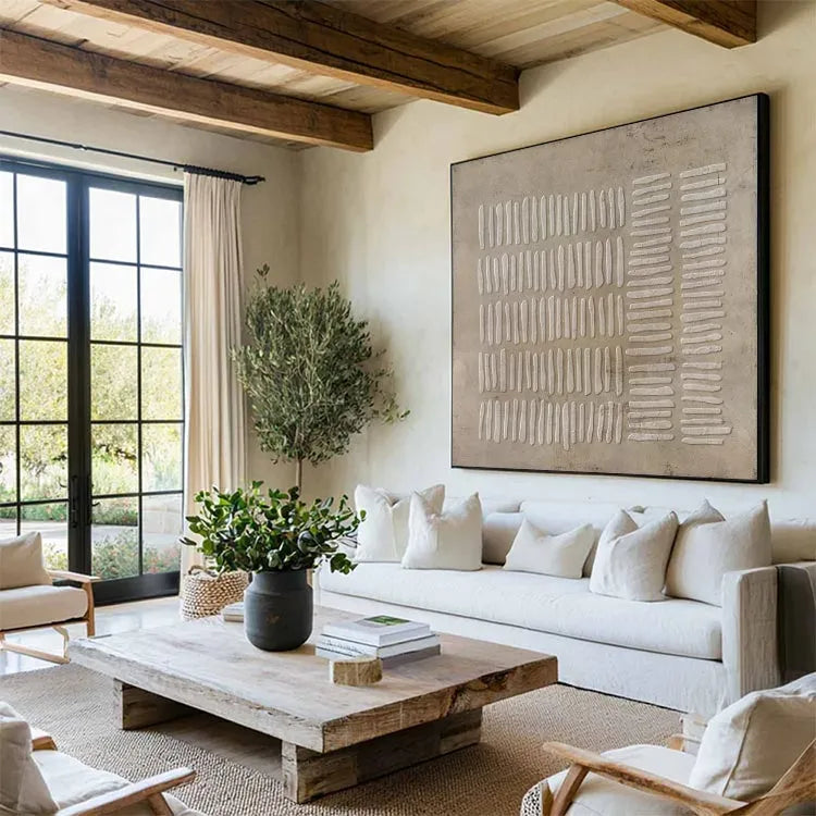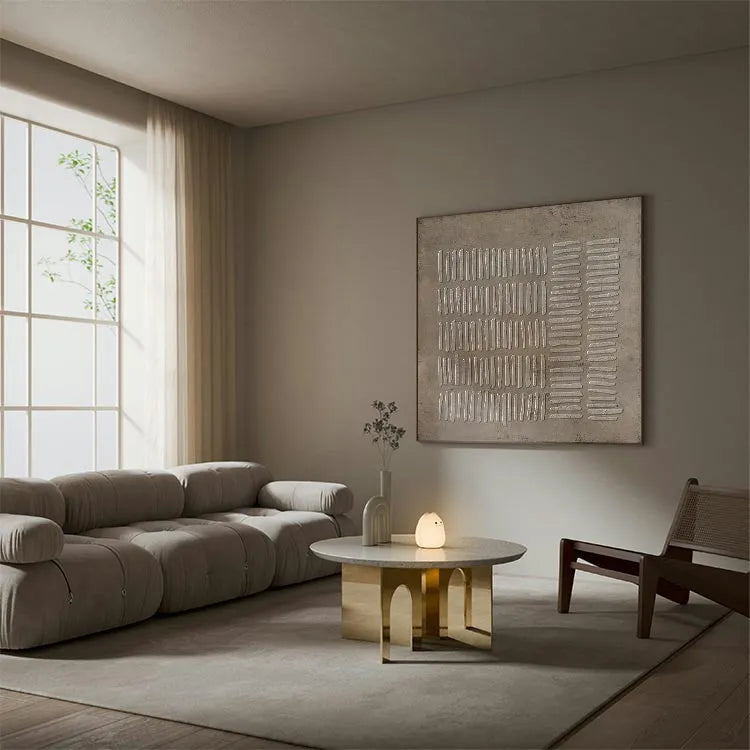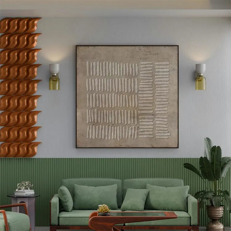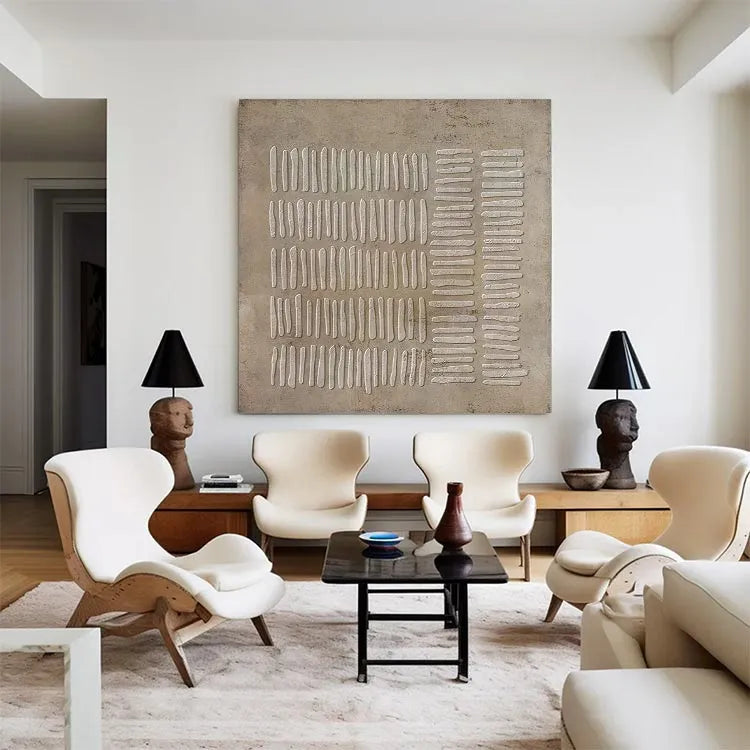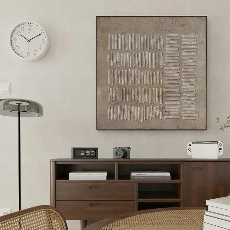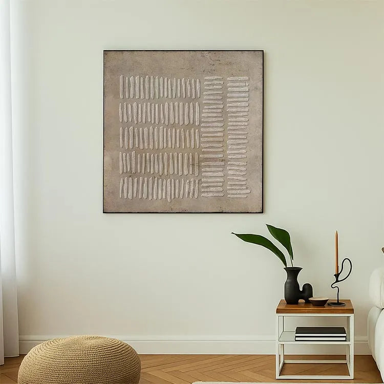 This artwork presents a minimalist, grid-like composition featuring elongated, textured, white shapes arranged in rows and columns against a muted, earthy brown background. The repetitive, uniform shapes evoke a sense of order and rhythm, reminiscent of modernist and abstract movements. The texture of the shapes suggests a carved or etched quality, adding depth and tactile interest. The use of a limited color palette enhances the focus on form and texture. The subtle, uneven background adds a natural, organic feel, contrasting with the geometric precision of the shapes. The overall style is contemporary, with a nod to minimalist and abstract expressionism, emphasizing simplicity, repetition, and texture.