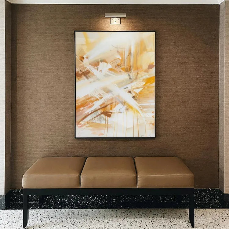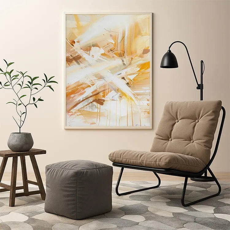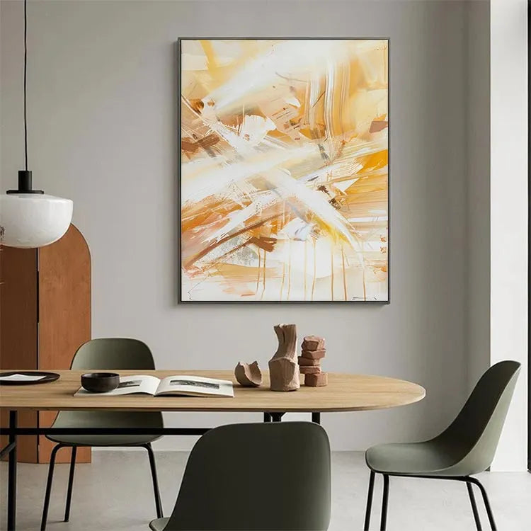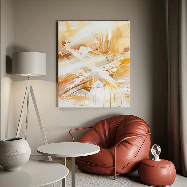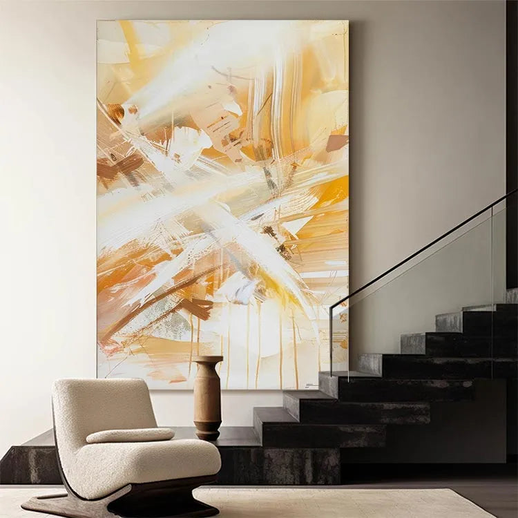 This abstract painting employs a dynamic interplay of color and texture, evoking a sense of movement and energy. The composition is characterized by bold, sweeping brushstrokes in warm hues of yellow, orange, and white, interspersed with subtle brown and beige accents. The use of light, transparent layers creates a sense of depth and layering, while the thick, textured brushstrokes introduce a tactile quality. The diagonal and radial patterns suggest an underlying structure, yet the overall effect remains fluid and spontaneous. This work aligns with the Abstract Expressionist movement, emphasizing emotional expression over representational accuracy. The interplay of color and texture, combined with the spontaneous application of paint, conveys a vibrant, almost chaotic energy.