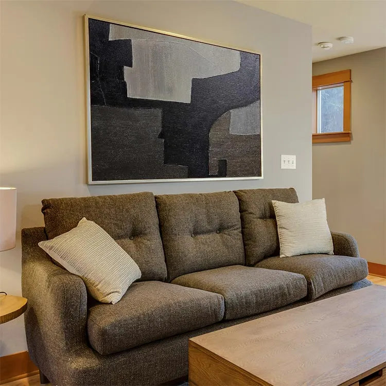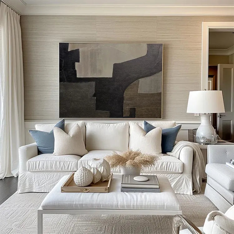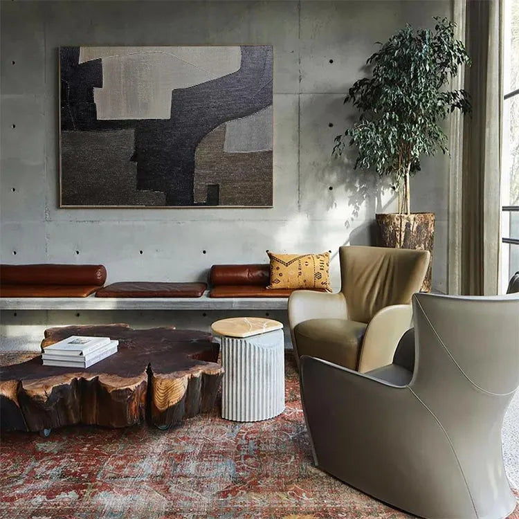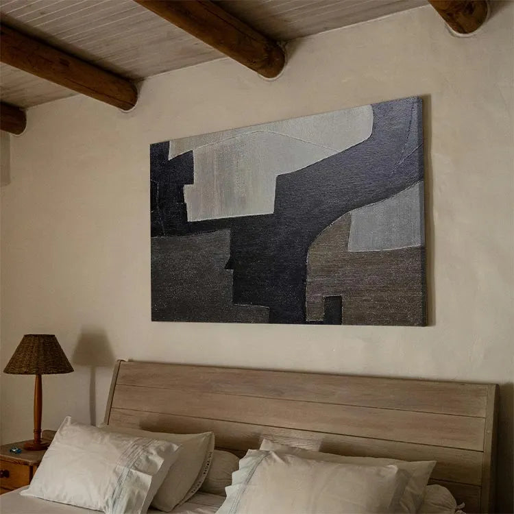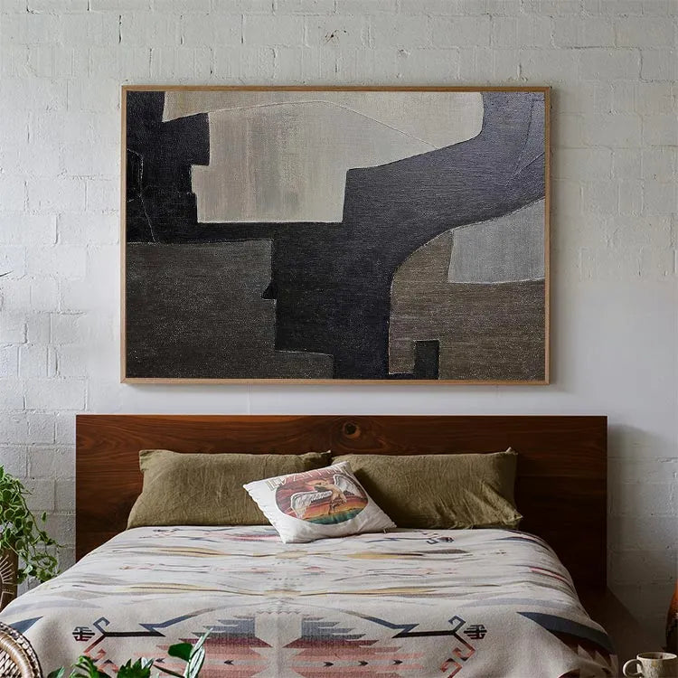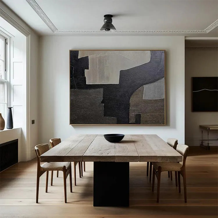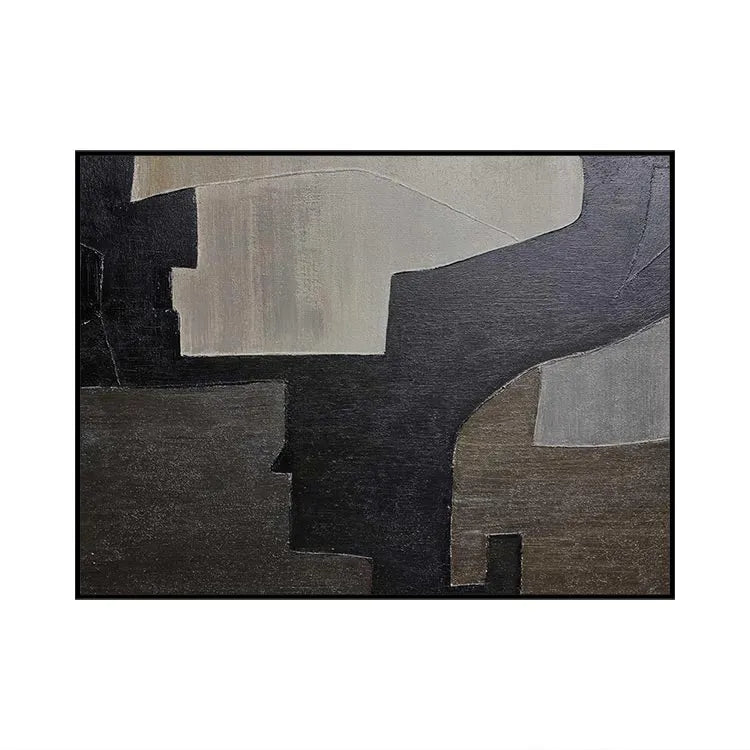 This oil painting employs a geometric abstraction style, characterized by its use of sharp, angular shapes and a limited color palette. The composition features a series of intersecting rectangles and triangular forms, creating a sense of depth and complexity. The artist employs a restrained yet effective use of color, with shades of black, brown, beige, and gray dominating the palette, which evokes a muted, almost somber mood. The textures vary from smooth, flat areas to slightly rough, brush-applied regions, adding a tactile quality to the otherwise two-dimensional forms. The interplay of light and dark areas within the shapes suggests a subtle interplay between shadow and illumination. This work aligns with the principles of the Bauhaus movement, emphasizing form and function, simplicity, and the interplay between color and shape.