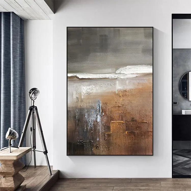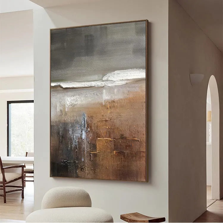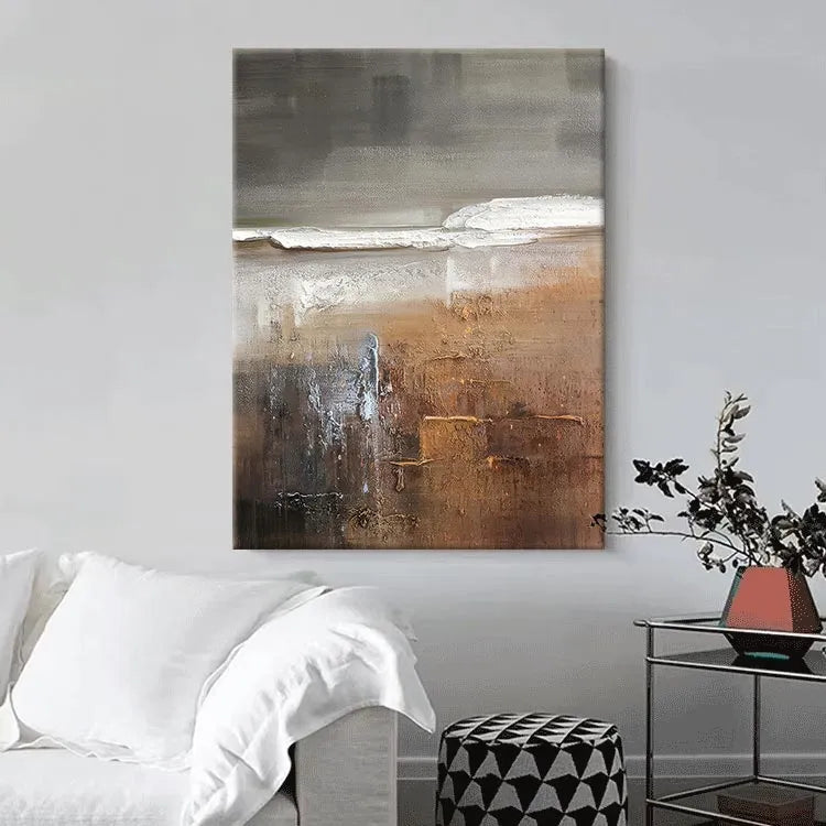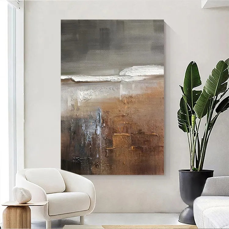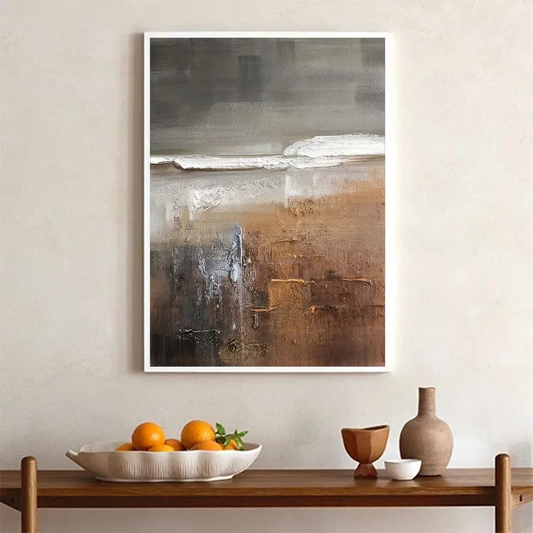 This oil painting employs a minimalist approach, focusing on abstract expressionism. The composition features a textured, layered surface with a horizontal division between a darker, upper section and a warmer, lower section. The upper part is characterized by muted, grayish tones, while the lower section transitions through rusty browns and whites, suggesting a desolate landscape or a shoreline. The textured brushstrokes and visible paint layers add a tactile quality, enhancing the sense of depth. The use of color contrasts subtly, creating a serene yet somber mood. The artist's technique, with its emphasis on texture and minimal color palette, aligns with the abstract expressionist movement, reminiscent of the works of artists like Jackson Pollock or Mark Rothko.