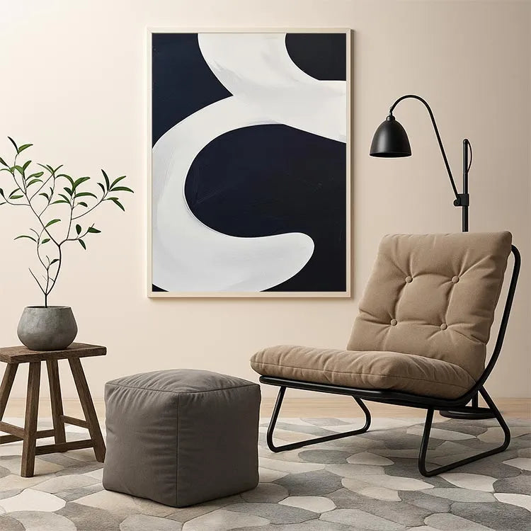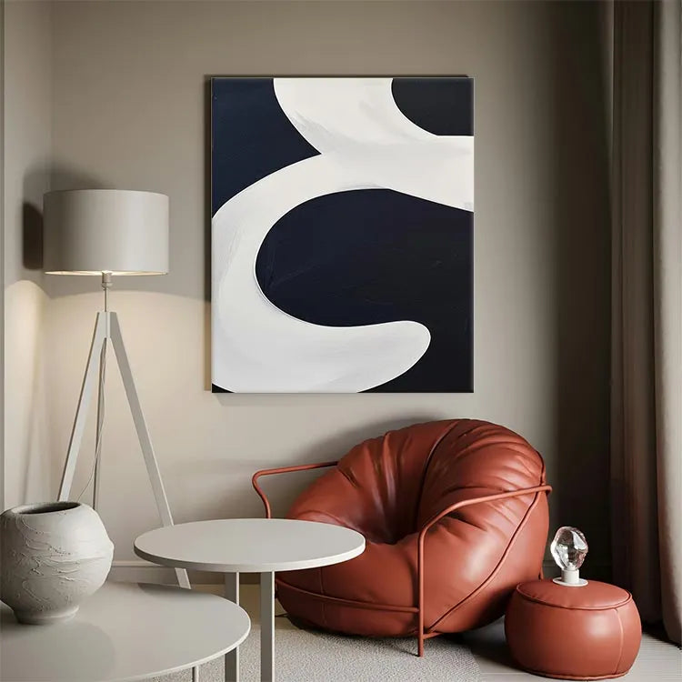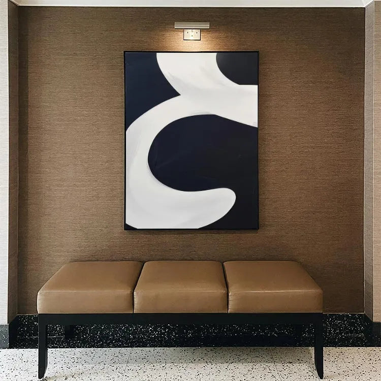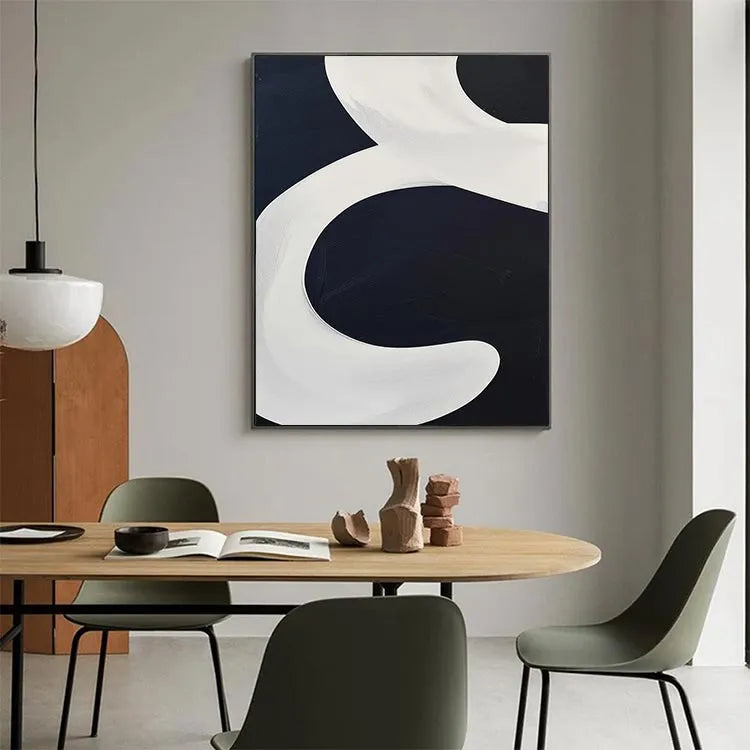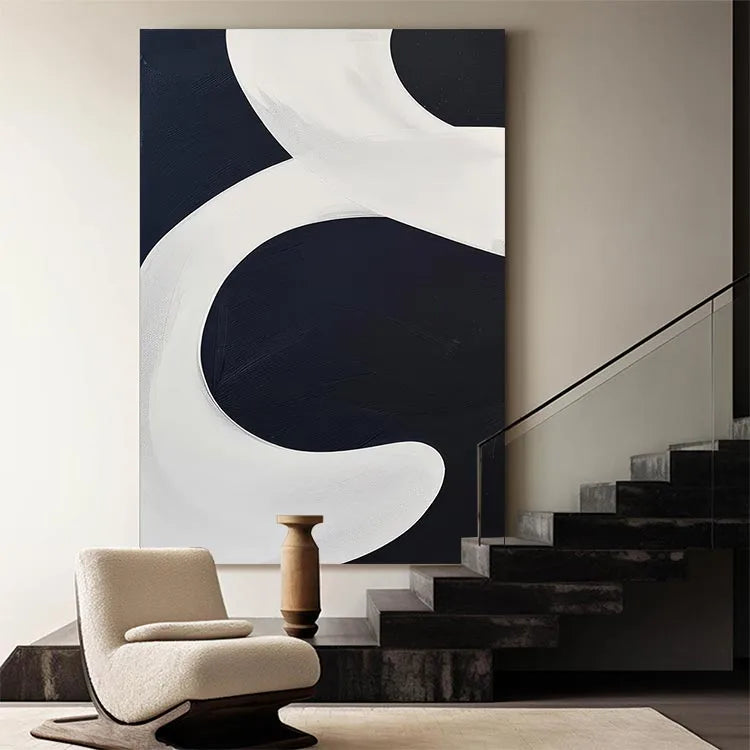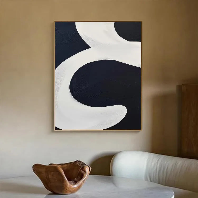 This painting exemplifies a minimalist style, characterized by its stark contrast between the black and white elements. The sweeping, curved forms suggest movement and fluidity, reminiscent of the Abstract Expressionism movement. The use of color is minimal yet effective, with the black background providing a stark, almost infinite space that enhances the prominence of the white curves. The texture appears smooth, with subtle variations in the brushstrokes adding depth. The composition is balanced yet dynamic, drawing the viewer's eye along the curves. The simplicity and elegance of the piece evoke a sense of calm and contemplation, while the bold contrast between the colors adds a layer of tension and intrigue.