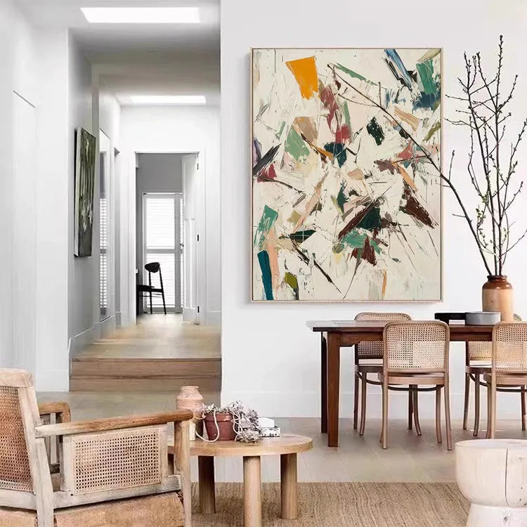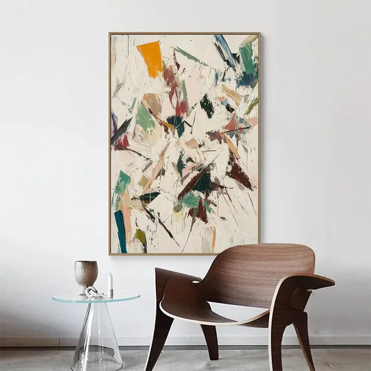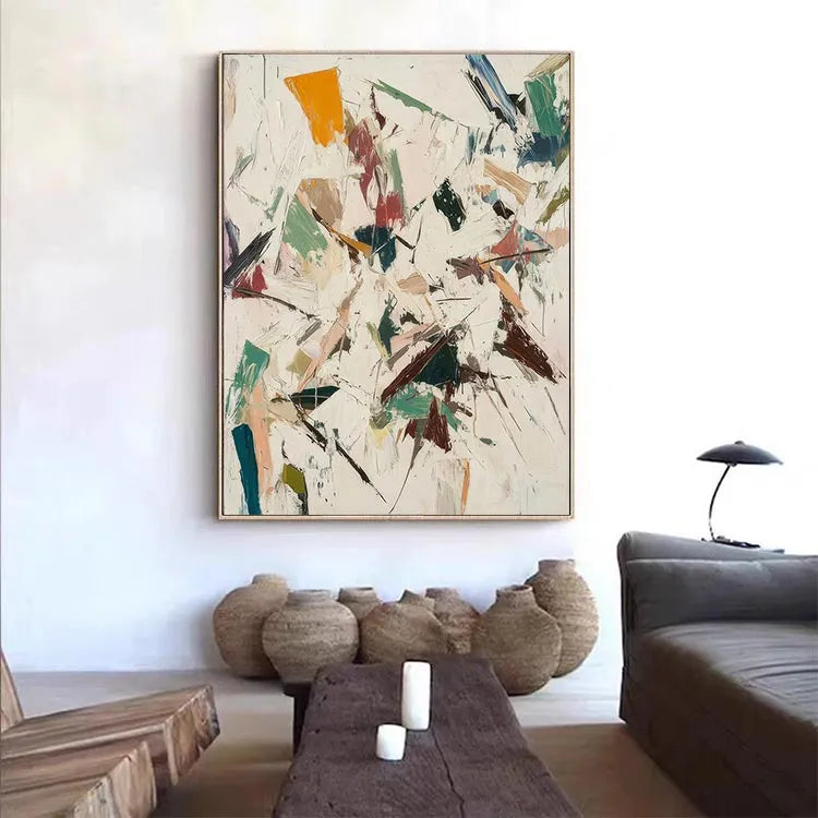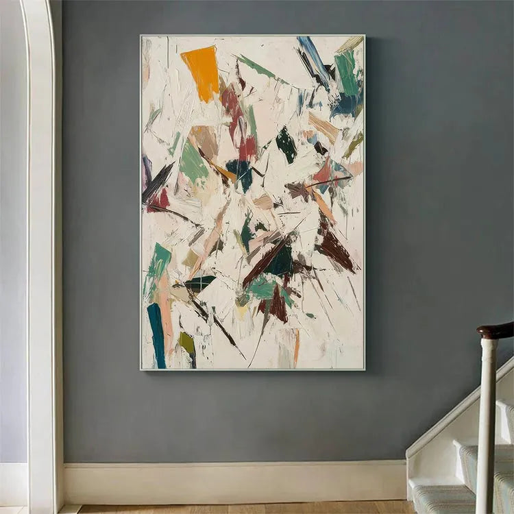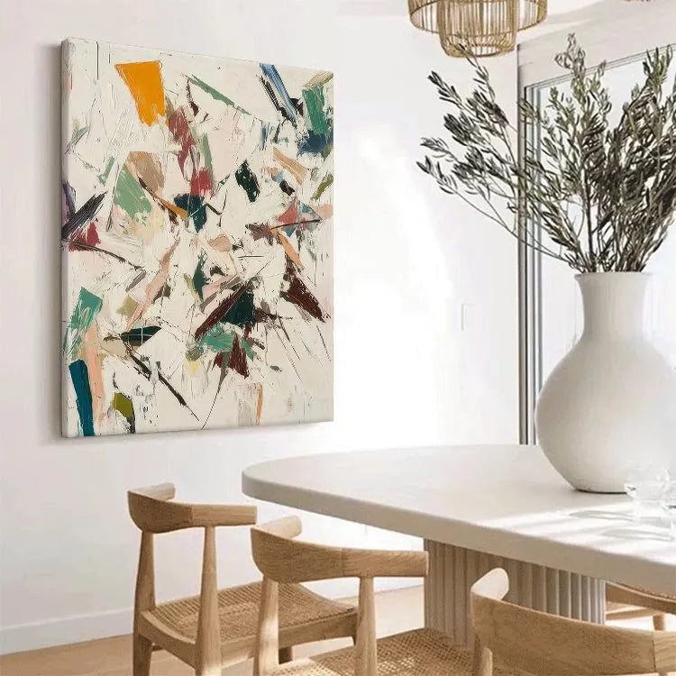 This abstract painting features a dynamic composition of fragmented geometric shapes and brushstrokes, creating a sense of chaotic energy. The use of color is restrained yet effective, with a palette of muted earth tones—green, brown, orange, and beige—interspersed with occasional deep blues and purples. The textured, layered application of paint suggests a sense of depth and movement, while the white background contrasts sharply with the vibrant shapes, drawing the viewer's eye. The brushstrokes are both deliberate and haphazard, adding a tactile quality to the piece. This work aligns with the Abstract Expressionism movement, characterized by its spontaneous creation and emphasis on emotional expression over representational accuracy. The interplay of color and texture evokes a sense of both order and disorder, inviting the viewer to interpret the scene subjectively.