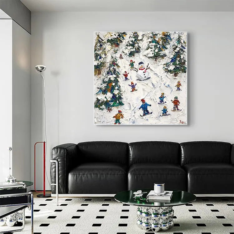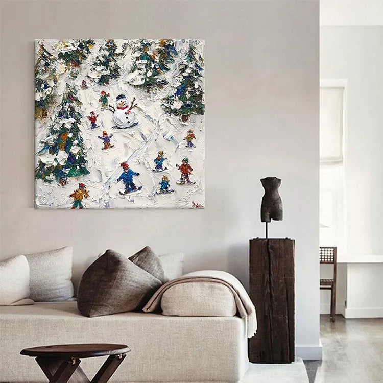 This oil painting depicts a winter scene with children and a snowman amidst snow-covered pine trees. The artist employs a vibrant, impressionistic style, characterized by thick, textured brushstrokes that create a sense of movement and depth. The use of color is dynamic, with the white snow contrasting against the green and brown tree trunks, and the children's colorful clothing adding a lively touch. The snowman, central to the composition, draws the eye with its cheerful presence. Light is suggested through the bright, reflective snow, and the overall composition evokes a sense of joy and playfulness. The texture of the brushstrokes adds a tactile quality, enhancing the winter atmosphere. This work likely belongs to the impressionist movement, emphasizing a spontaneous and emotional response to nature.