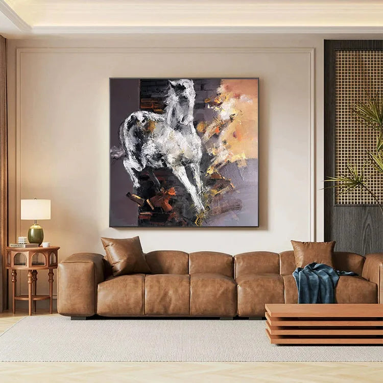 This oil painting features a dynamic, abstract representation of a white horse in mid-stride, set against a textured, multicolored background. The brushstrokes are vigorous and expressive, creating a sense of movement and energy. The artist employs a mix of thick, impasto textures and smoother, more delicate strokes, particularly in the horse's form. The use of color is bold, with white and black dominating the horse, contrasted by warm, orange and brown hues in the background. The interplay of light and dark areas suggests depth and dimension. This work aligns with the Abstract Expressionism movement, emphasizing emotion and spontaneity over realism. The abstract, almost chaotic background enhances the horse's dynamic presence, symbolizing freedom and power.