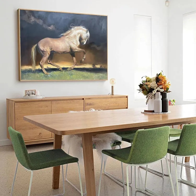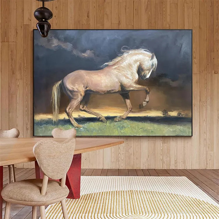 This oil painting portrays a white horse in mid-stride, its muscular form and flowing mane expertly captured. The composition emphasizes the horse's dynamic movement, with one leg raised and head slightly lowered, suggesting grace and power. The use of color is subtle yet effective, with a soft, almost pastel palette that contrasts the horse's pale, almost luminous white against a dark, stormy sky. The light source is ambiguous, creating a mysterious, almost ethereal atmosphere. The brushstrokes are smooth yet textured, adding depth and realism to the horse's musculature and fur. This work aligns with the Romantic movement, with its emphasis on nature's sublime beauty and the horse's majestic, almost mythical presence. The artist's attention to light and movement evokes a sense of freedom and timeless elegance.