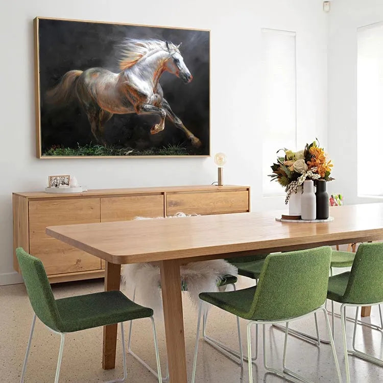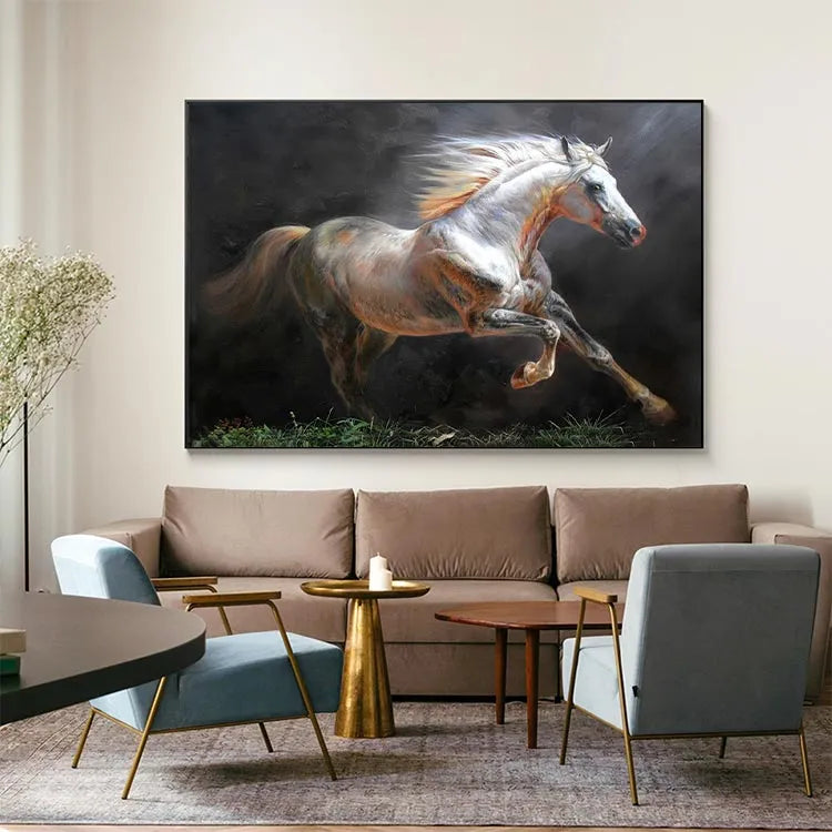 This oil painting depicts a dynamic, galloping white horse with subtle orange and gray undertones in its coat, set against a dark, blurred background. The composition highlights the horse's powerful motion, with its mane and tail flowing gracefully, creating a sense of movement and freedom. The artist employs a realistic style with a touch of Romanticism, evident in the dramatic lighting and emphasis on natural beauty. The use of light accentuates the horse's muscular form, while the dark background contrasts effectively, drawing focus to the subject. Textures are meticulously rendered, with visible brushstrokes adding depth to the horse's coat and mane. The subtle greenery at the bottom suggests a natural setting, enhancing the horse's majestic presence.