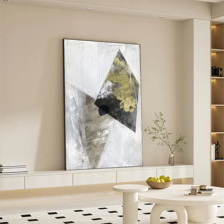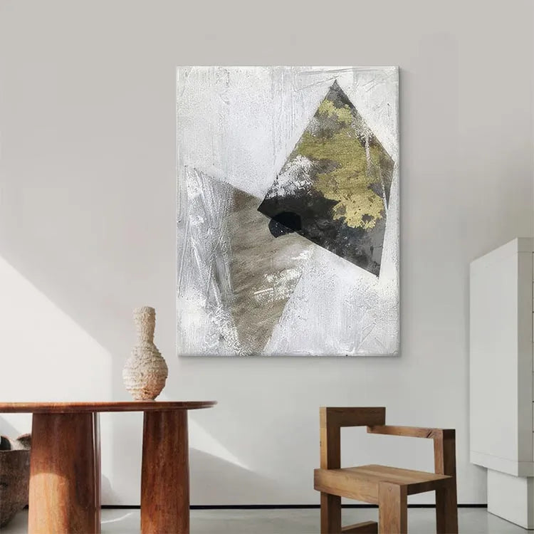 This oil painting employs a minimalist and abstract style, characterized by geometric forms and a restrained color palette. The composition features two overlapping triangular shapes, one with a golden-yellow, textured surface and the other in a muted gray, creating a dynamic yet subtle contrast. The use of white and gray background enhances the triangular forms, suggesting a sense of depth and layering. The textured brushwork adds a tactile quality, reminiscent of modernist movements like Cubism. The interplay of light and shadow, particularly in the golden triangle, evokes a sense of dimensionality. The overall effect is a balance between simplicity and complexity, inviting viewers to contemplate the interplay between form and texture.