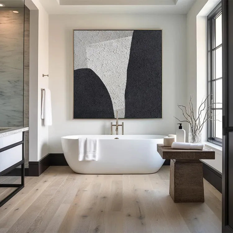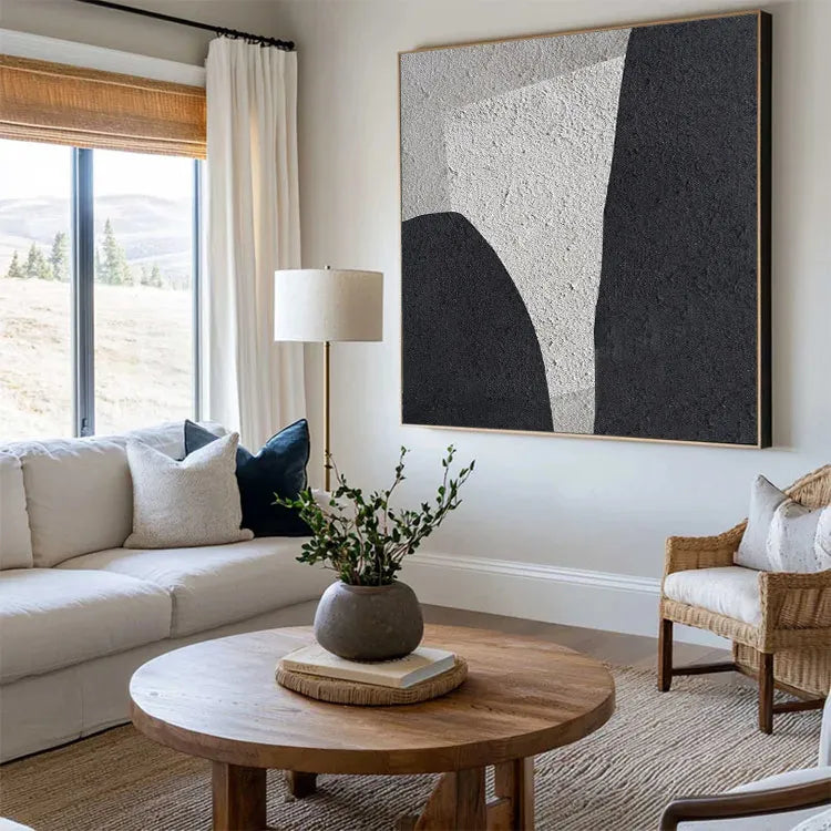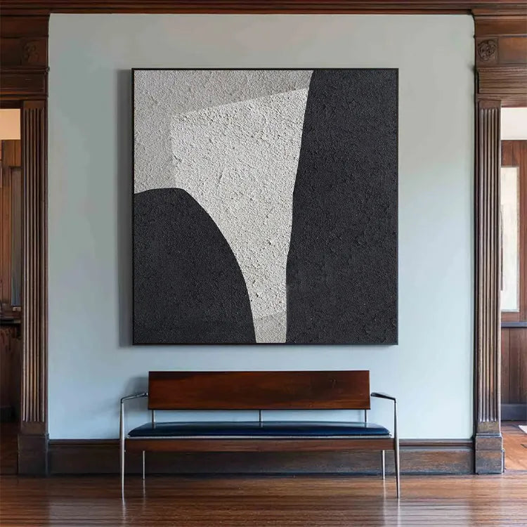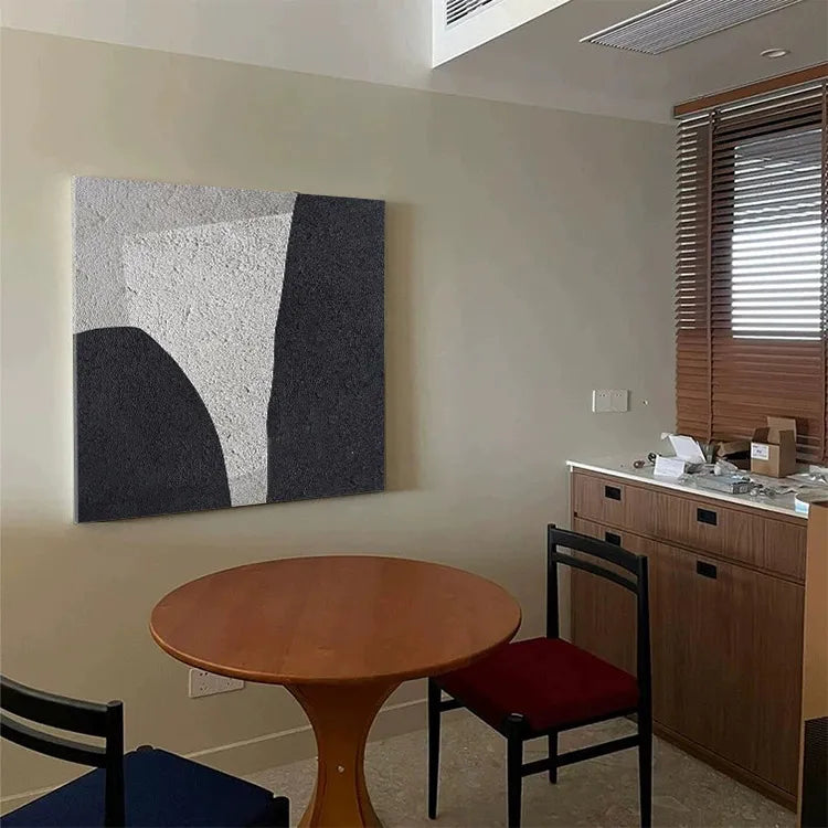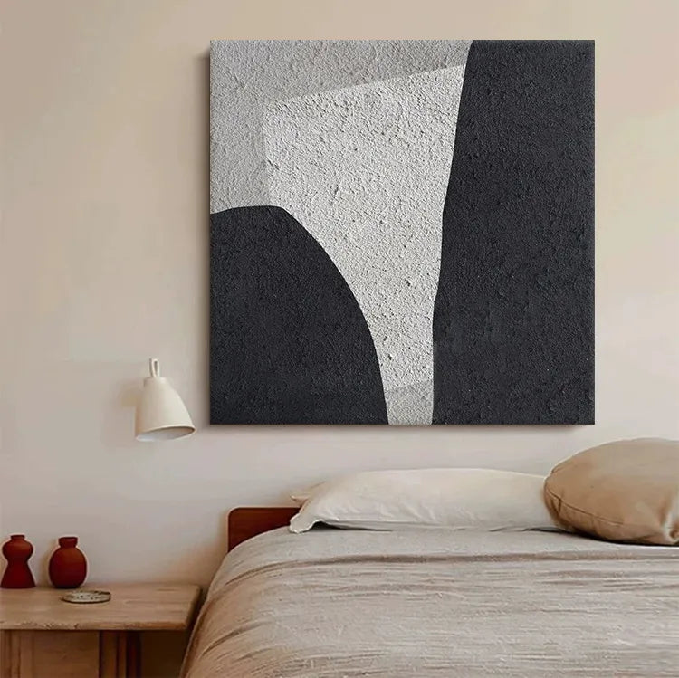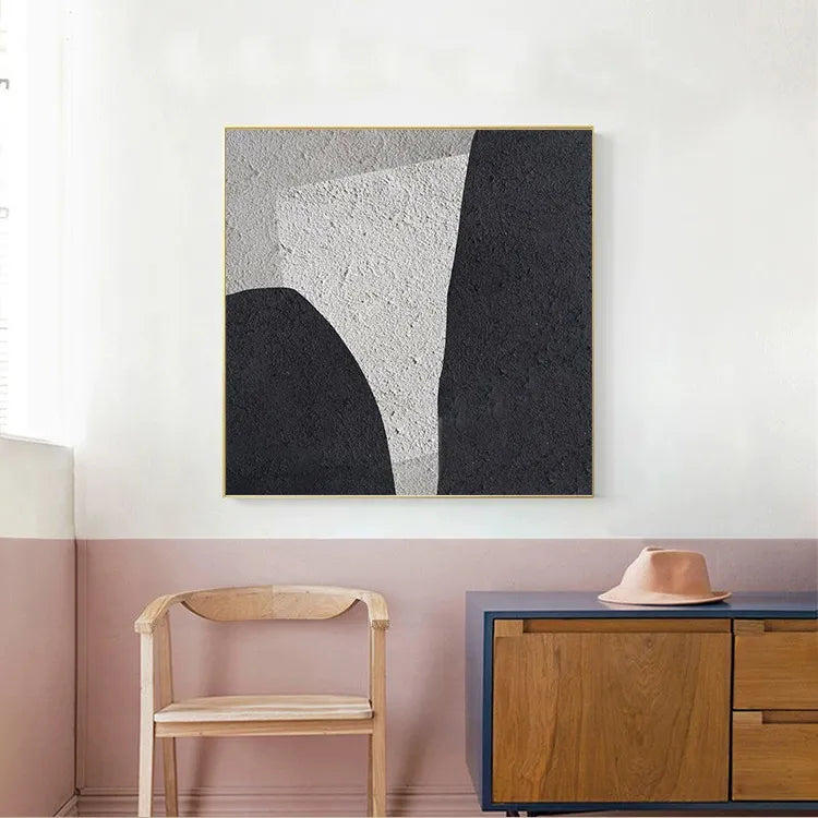 This oil painting employs a minimalist, abstract style characterized by its geometric forms and limited color palette. The composition features a central, textured, light gray area juxtaposed against larger, darker black and gray sections, creating a striking contrast. The rough texture of the central area suggests a tactile quality, while the smoother black sections provide a stark, almost shadowy counterpoint. The use of light gray as the central color symbolizes balance and neutrality, while the blacks suggest depth and mystery. The artist's choice of simple, yet bold, geometric shapes aligns with the principles of modernist and abstract movements, focusing on form and color rather than representation. The painting's texture and color interplay evoke a sense of simplicity and introspection.