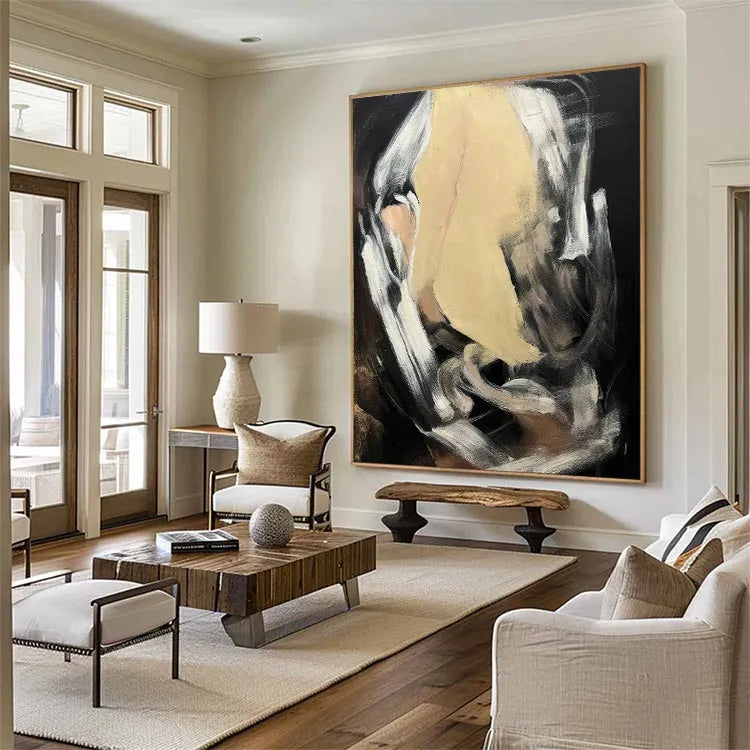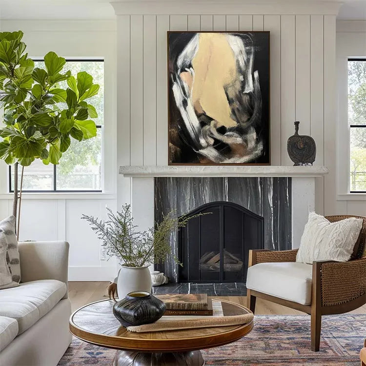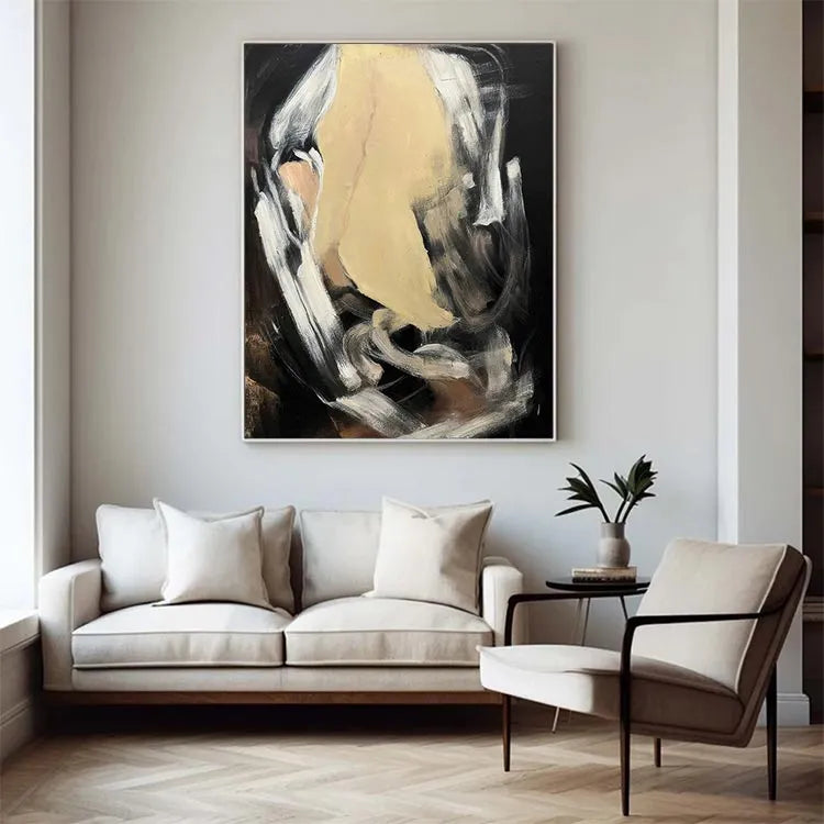 This abstract painting employs a bold, expressive style characterized by thick, dynamic brushstrokes and a limited color palette. The central, light beige shape contrasts sharply with the dark, almost black background, drawing the viewer's eye to its organic, amorphous form. The white, swirling brushstrokes around the beige shape create a sense of movement and energy, suggesting a dance between light and darkness. The texture is rich and tactile, with visible brushstrokes adding a sense of depth and dimension. This work appears to belong to the Abstract Expressionist movement, with its emphasis on emotional expression and spontaneity. The interplay of light and dark, coupled with the abstract forms, evokes a meditative, introspective mood.