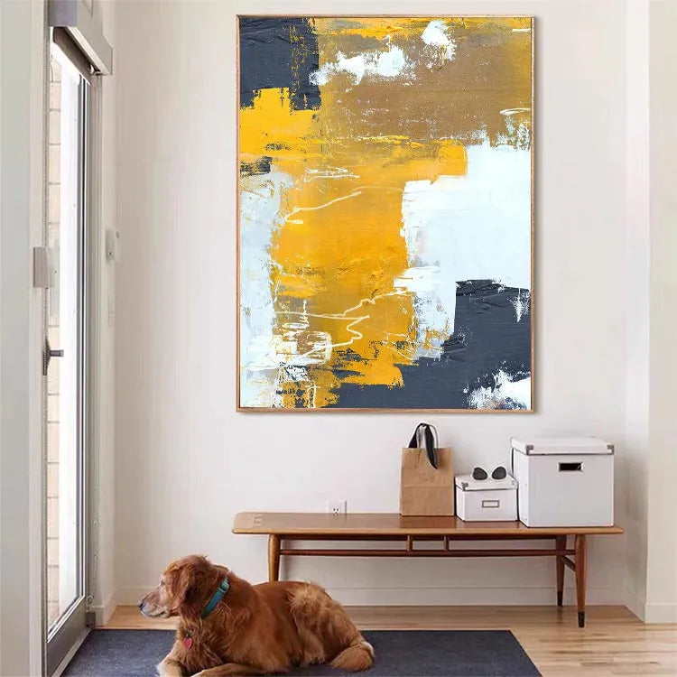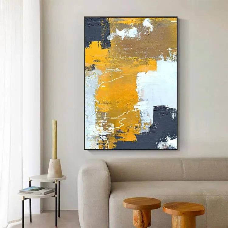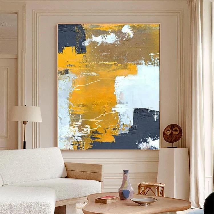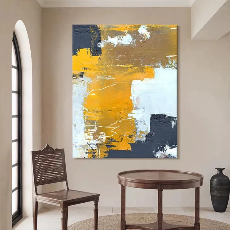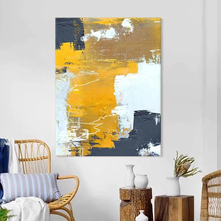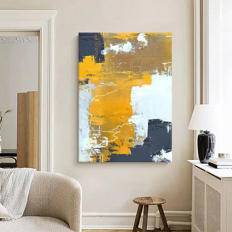 This abstract painting employs a rich palette of mustard yellow, black, and white, creating a dynamic contrast. The textured brushstrokes and visible layers suggest a deliberate, almost grungy application of paint, invoking a sense of depth and movement. The composition is non-representational, focusing on the interplay between color and texture. The rough, almost chaotic edges of the yellow and black areas juxtaposed against the stark white patches evoke a tension between order and disorder. This work may be associated with the Abstract Expressionist movement, characterized by its spontaneous application of paint and emphasis on the emotional content of the process. The interplay of light and dark areas enhances the visual interest, while the rough textures add a tactile quality to the piece.