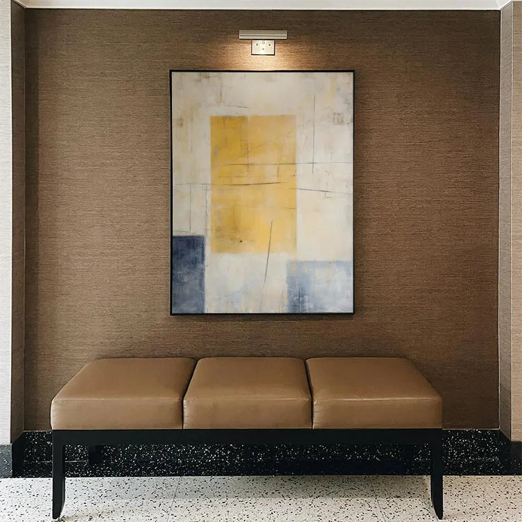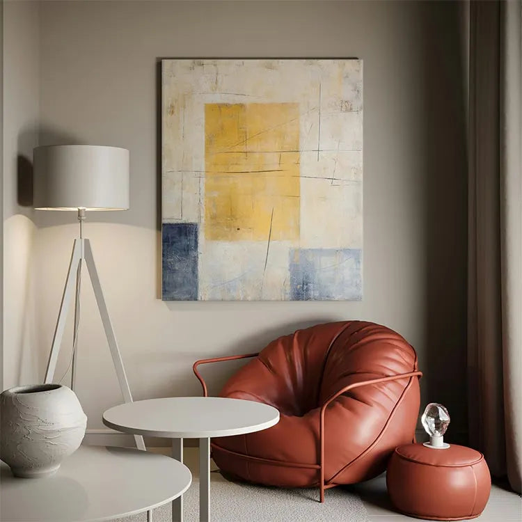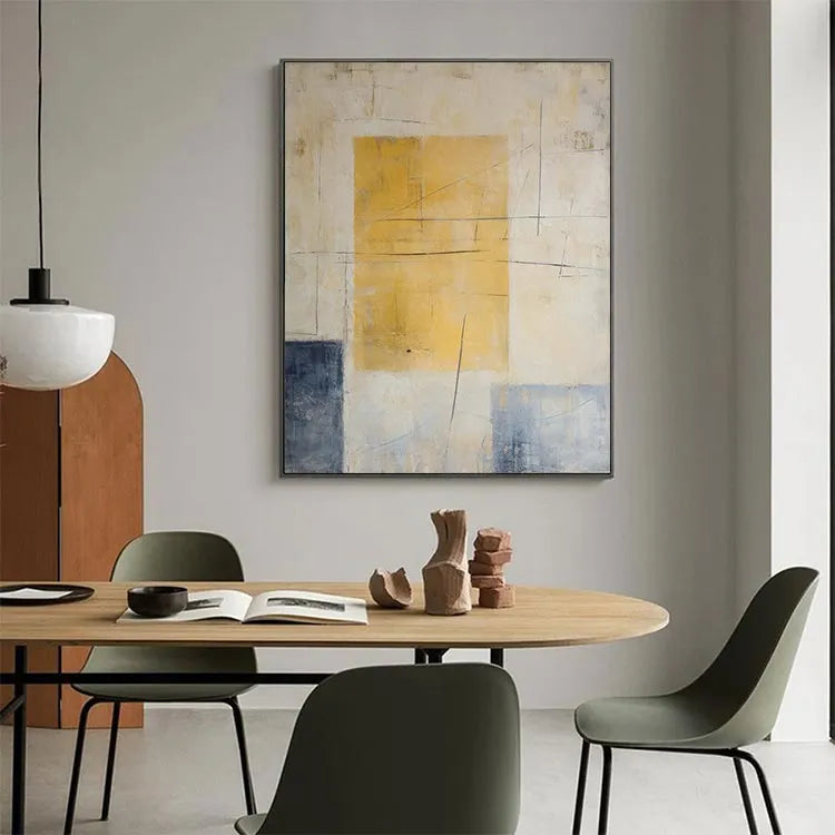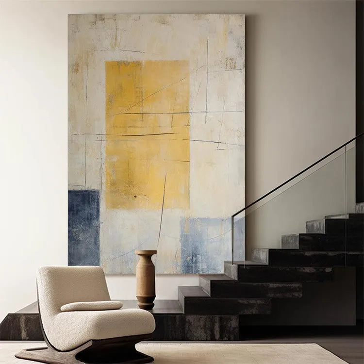 This painting exhibits a minimalist, abstract style, reminiscent of the Bauhaus movement. The composition features a central yellow square, which stands out against a muted, textured background of beige and gray. The square's rough, uneven edges and subtle layering suggest a sense of wear and age, adding a tactile quality to the piece. Thin, black lines intersect the square, introducing a geometric precision that contrasts with the square's organic texture. The use of color is restrained yet effective, with the yellow symbolizing optimism or warmth amidst the otherwise neutral palette. The texture of the background, achieved through visible brushstrokes and subtle graining, enhances the painting's depth and invites the viewer to contemplate the interplay between simplicity and complexity.