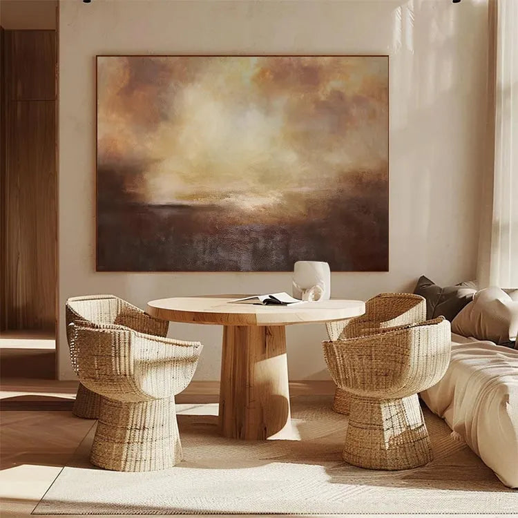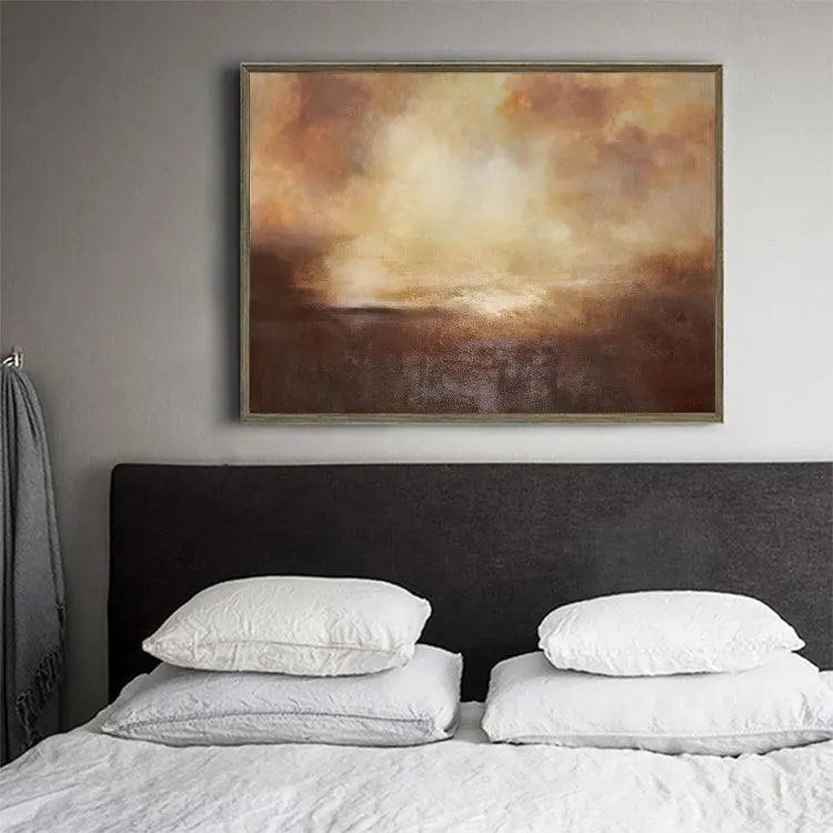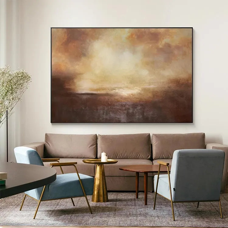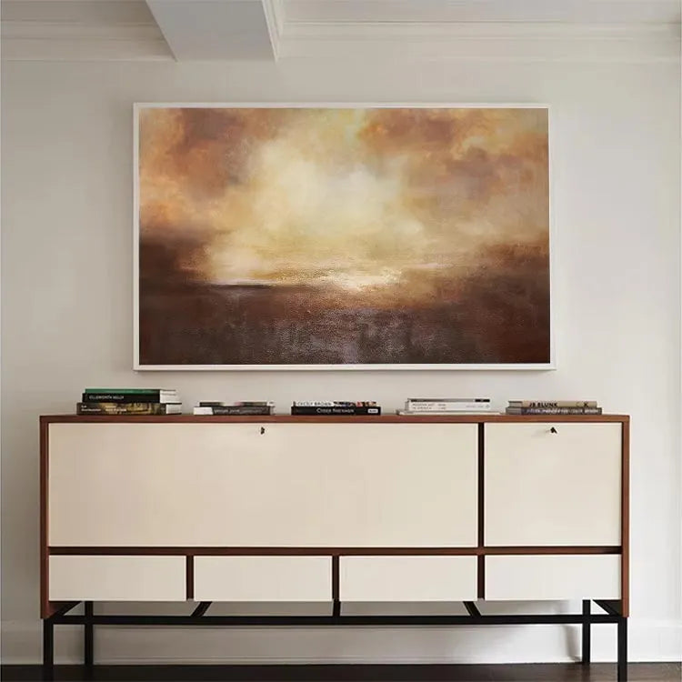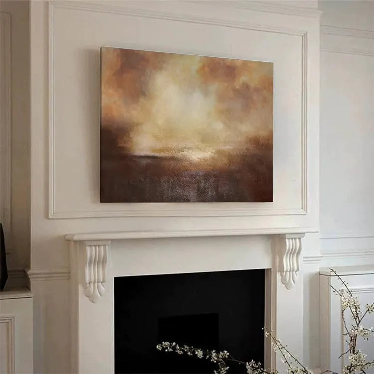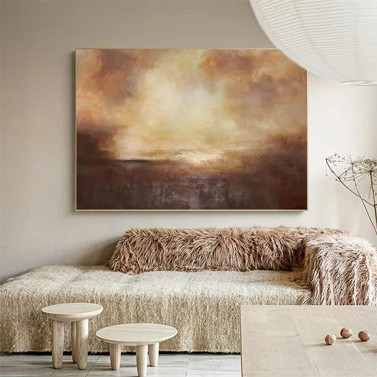 This oil painting presents a captivating abstract landscape, characterized by its use of warm, earthy tones—browns, oranges, and yellows. The composition employs a gradient effect, with the darker hues at the bottom gradually blending into lighter, more ethereal colors at the top. The texture is rich and layered, achieved through visible brushstrokes that add a tactile quality to the piece. The light source appears to be diffused, creating a soft, almost luminous effect in the upper section, which contrasts with the denser, more opaque lower part. The style is reminiscent of the Abstract Expressionism movement, with its emphasis on emotional expression and the subconscious. The interplay of color and texture evokes a sense of depth and atmospheric ambiguity, inviting the viewer to ponder the unseen elements of the landscape.