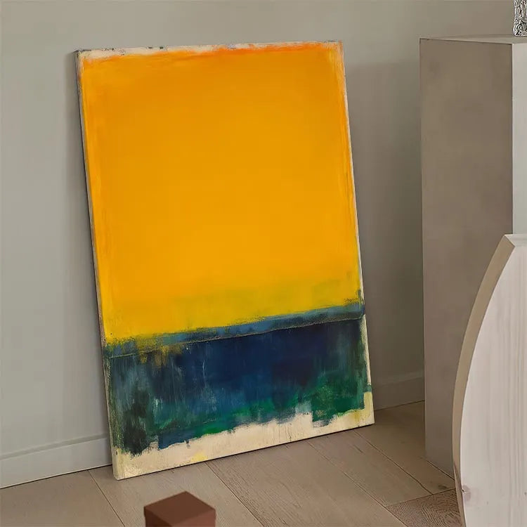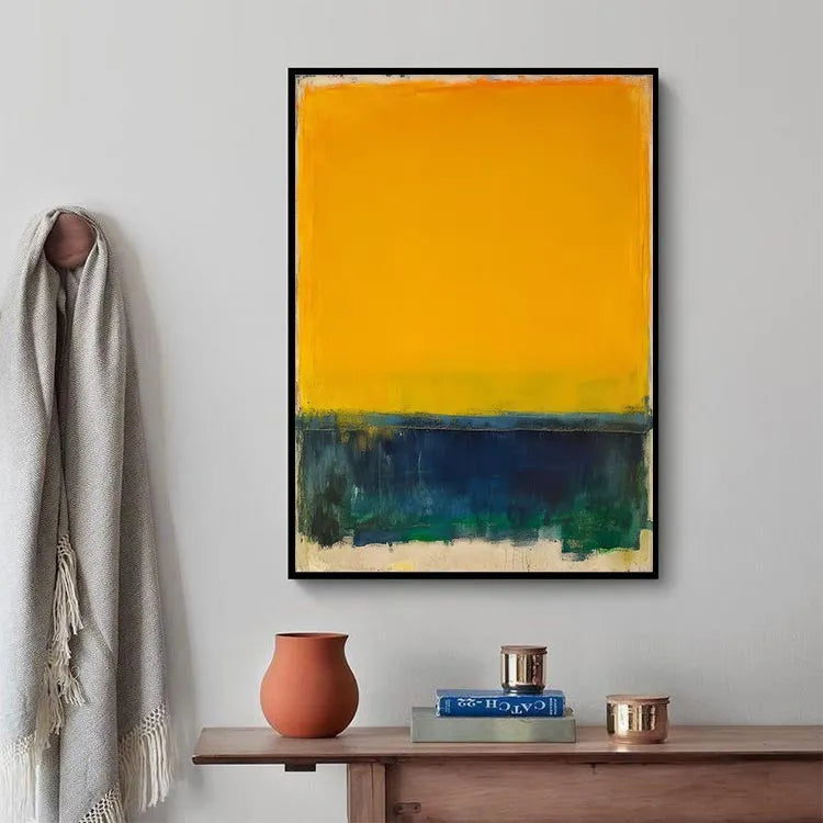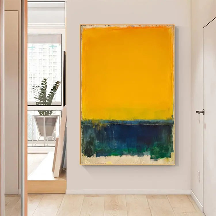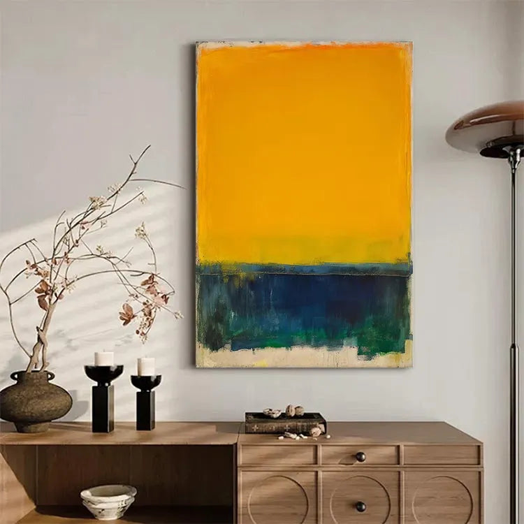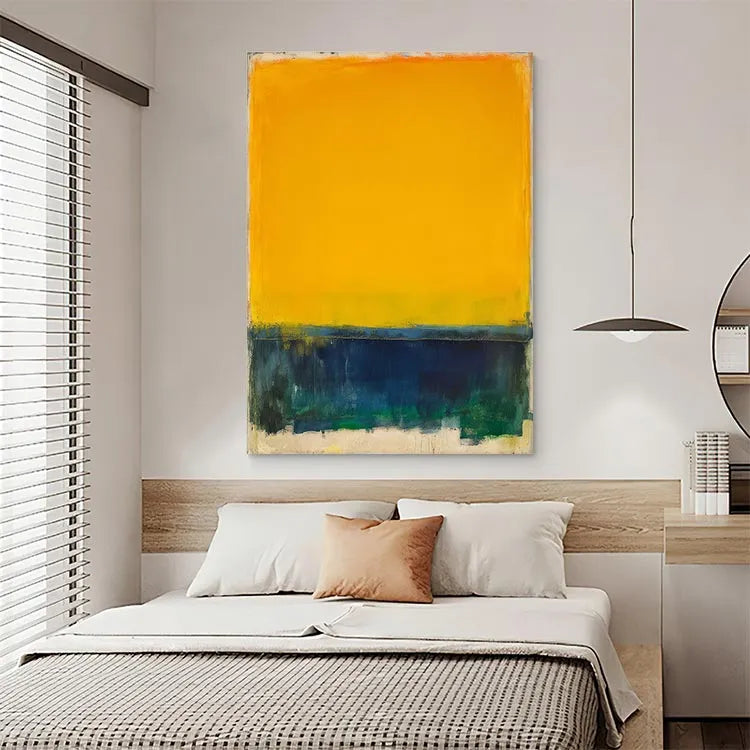 This painting, characterized by its bold and minimalist composition, employs a striking contrast between a vivid yellow sky and a dark, almost abstract sea. The yellow, occupying the upper two-thirds of the canvas, suggests warmth and optimism, while the deep blues and greens below evoke a sense of mystery and tranquility. The thick, textured brushstrokes at the bottom add a tactile quality, enhancing the painting's emotional depth. The use of color and light suggests influences from the Fauvist movement, with its emphasis on vivid, unmodulated color and emotional expression. The simplicity and focus on color contrast evoke a sense of calm and contemplation. The rough, uneven edges of the yellow and blue sections create a dynamic tension, drawing the viewer's eye across the canvas.