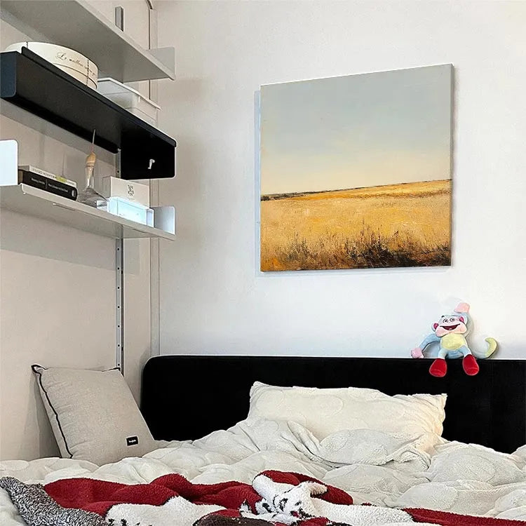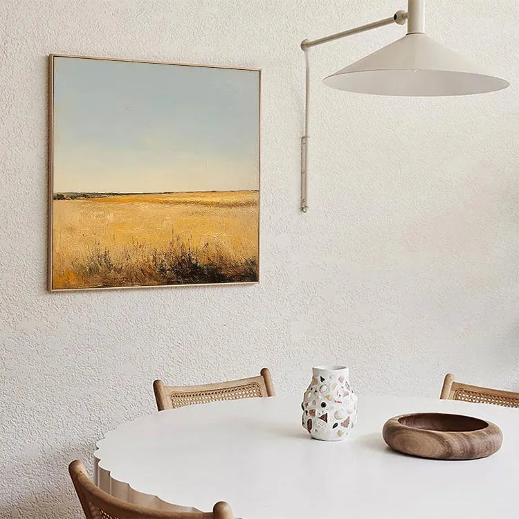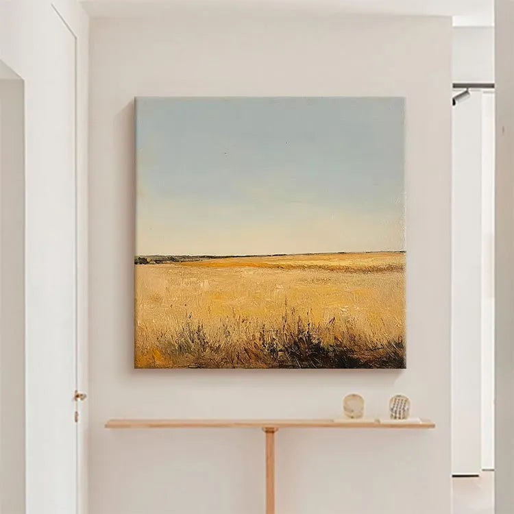 This oil painting captures a vast, golden field under a clear, pale blue sky, exemplifying the characteristics of the Impressionist movement. The composition employs a horizontal format, emphasizing the expansive nature of the landscape. The artist uses a restrained color palette, predominantly warm yellows and subtle blues, which creates a serene and tranquil atmosphere. The brushstrokes are visible yet controlled, adding texture to the grass and field, while the sky remains smooth. Light is subtly diffused, suggesting a gentle, late afternoon sun. The subtle gradation of color and light suggests a calm, almost meditative quality, characteristic of Impressionism's focus on light and natural beauty. The painting's simplicity and emphasis on natural scenery align with the Impressionist ethos.