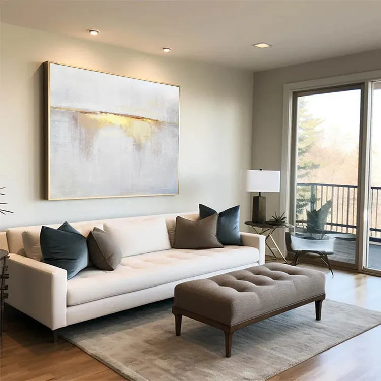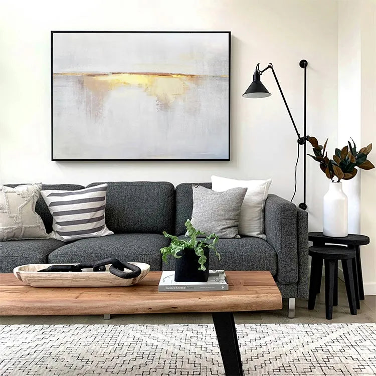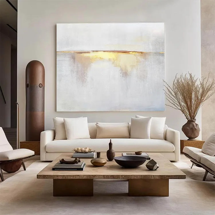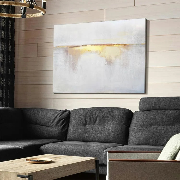 This abstract painting employs a minimalist approach, characterized by its restrained color palette and delicate brushstrokes. The composition features a horizontal band of warm, yellowish light, which subtly reflects onto a textured, grayish-white background, creating a sense of depth and tranquility. The artist's use of color is subtle yet effective, with the yellow light suggesting either dawn or dusk, invoking a serene, contemplative mood. The texture, achieved through visible brushstrokes, adds a tactile quality to the otherwise smooth surface. This piece aligns with the principles of Abstract Expressionism, emphasizing emotional resonance over representational accuracy. The simplicity and elegance of the work invite introspection and personal interpretation.