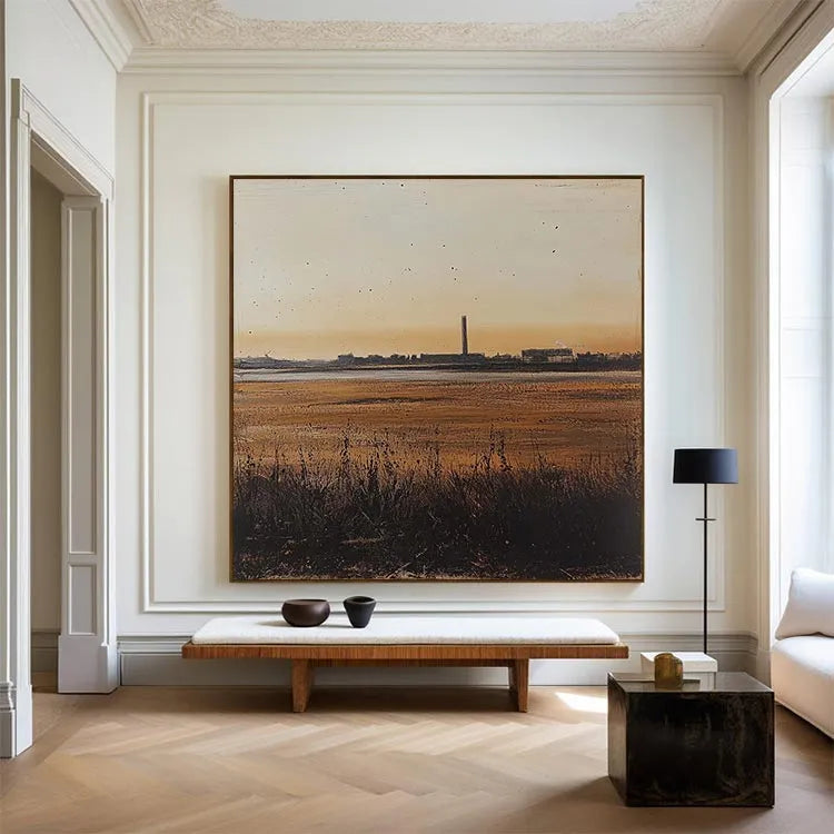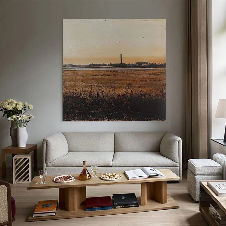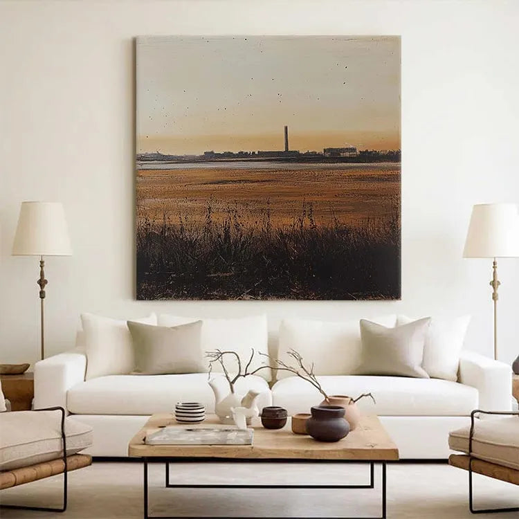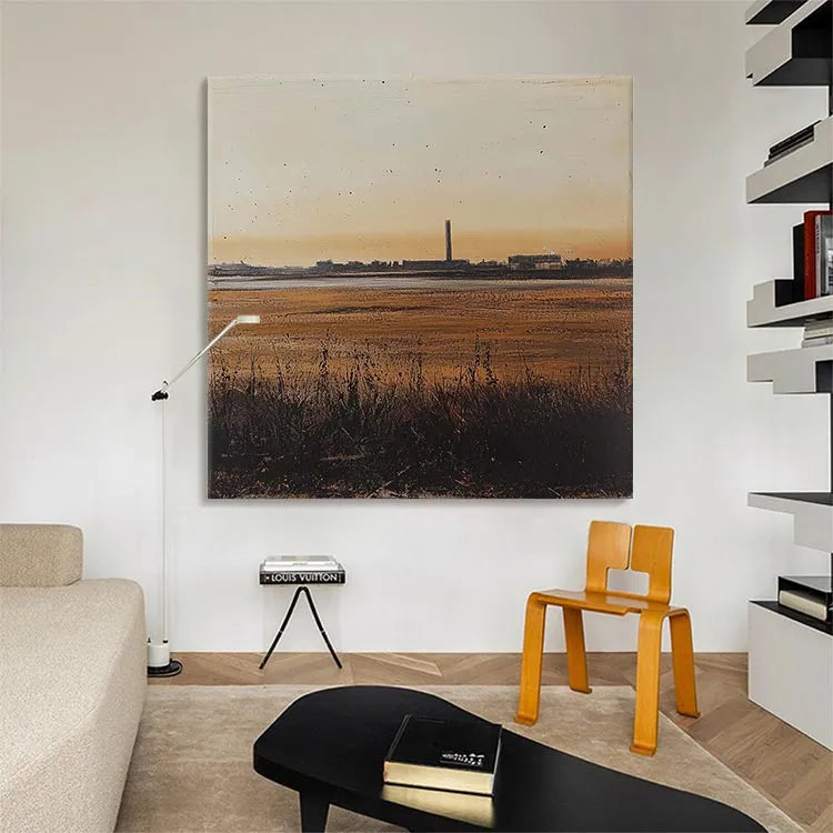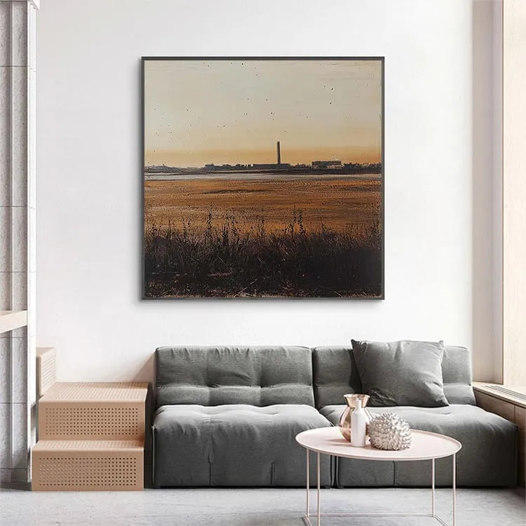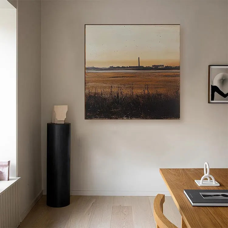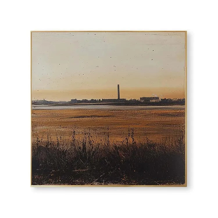 This painting presents a serene yet industrial landscape at sunset, characterized by a minimalist composition and a subtle use of color. The warm, golden hues of the sky transition into cooler tones of the wetlands, creating a balanced yet dynamic color palette. The tall, central industrial chimney stands as a stark contrast to the natural foreground, symbolizing the intersection of nature and industry. The texture is smooth yet detailed, with visible brushstrokes in the grass and water, adding depth. The light source, the setting sun, casts a gentle glow, enhancing the tranquil yet contemplative mood. This work aligns with the Realism movement, focusing on the accurate depiction of contemporary life and landscapes. The subtle use of light and shadow adds a three-dimensional quality, enhancing the painting's realism.