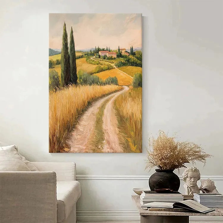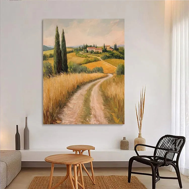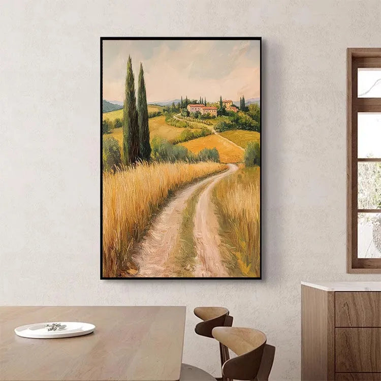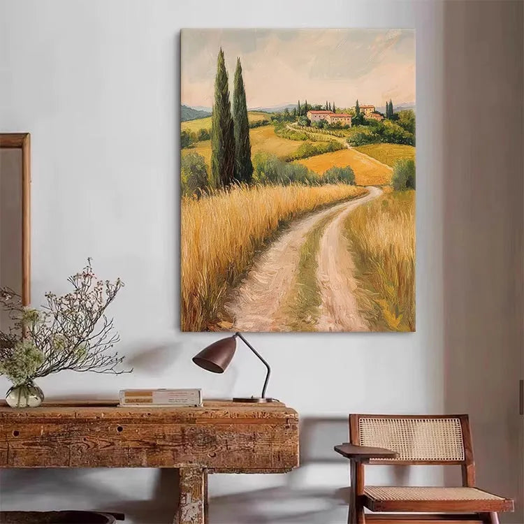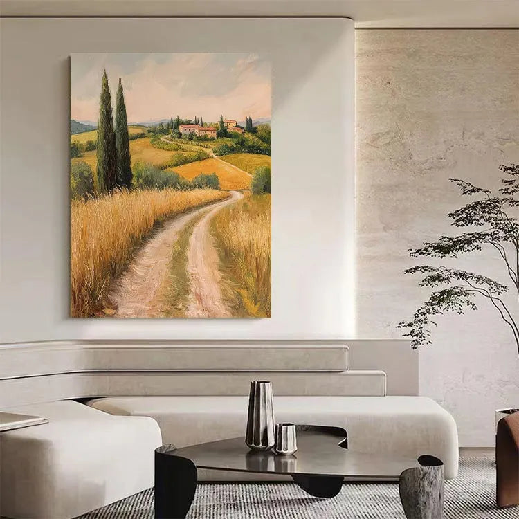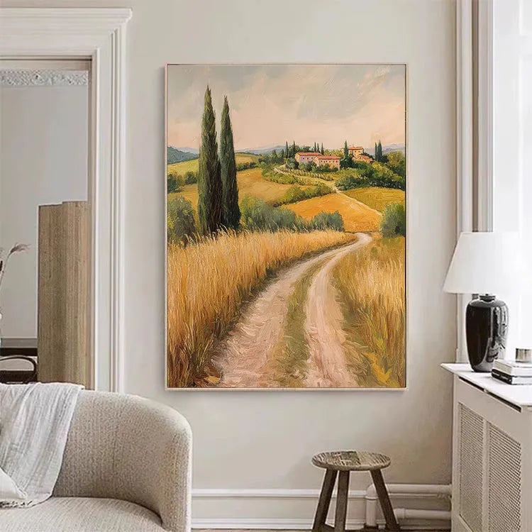 This painting, likely a work in the Impressionist style, employs a rich, warm color palette dominated by golden yellows and greens, evoking a serene rural landscape. The composition leads the viewer's eye along a winding dirt path into the distance, emphasizing depth and perspective. The brushstrokes are visible and textured, adding a sense of movement to the tall grasses and fields. The light source, suggested by the soft, diffused illumination, enhances the tranquil atmosphere. The tall, dark cypress trees provide a vertical contrast to the horizontal fields, symbolizing stability amidst the gentle undulations of nature. The subtle blending of colors and light suggests a late afternoon or early evening setting, characteristic of Impressionist paintings.