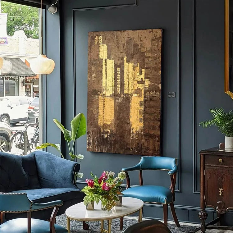 This painting, characterized by its abstract urban landscape, employs a textured, layered approach reminiscent of the Abstract Expressionist movement. The composition features a series of geometric, block-like structures in varying shades of yellow and brown, which evoke the silhouettes of city skyscrapers. The rough, almost grunge texture of the paint adds a sense of depth and tactile quality to the piece. The use of color is minimalist yet effective, with the yellow structures contrasting against the darker, earthy background. Light is suggested through the brighter yellow areas, implying the illumination of buildings. The brushstrokes are visible and varied, contributing to the overall textured effect. This work may symbolize the urban experience, capturing the essence of city life through its abstract representation.