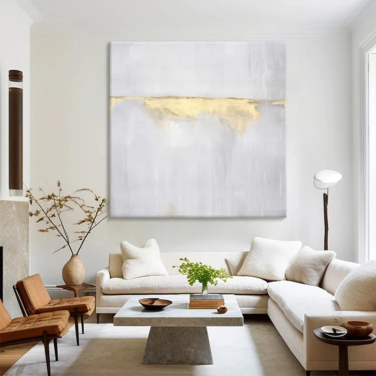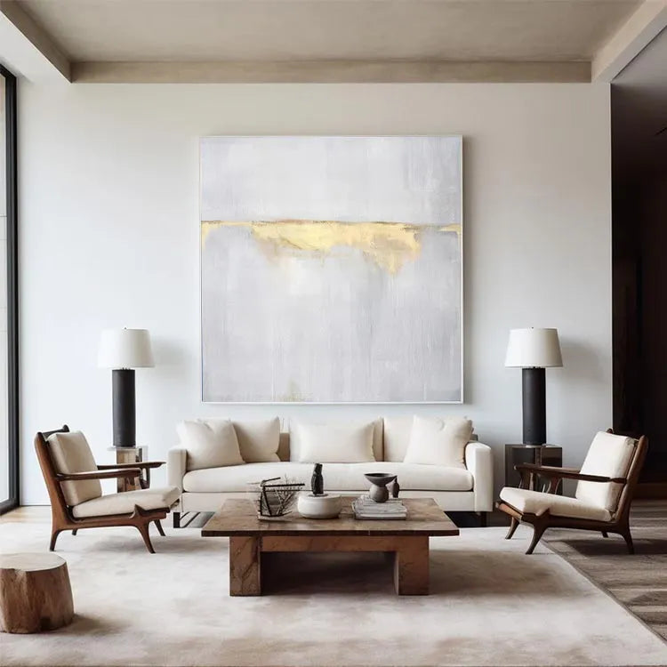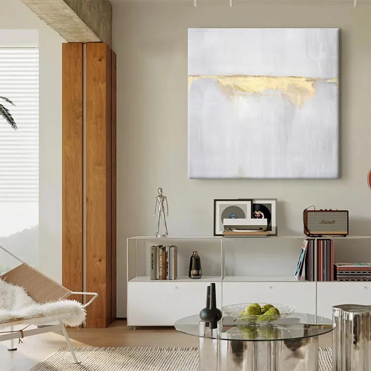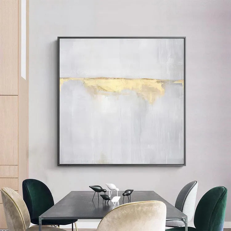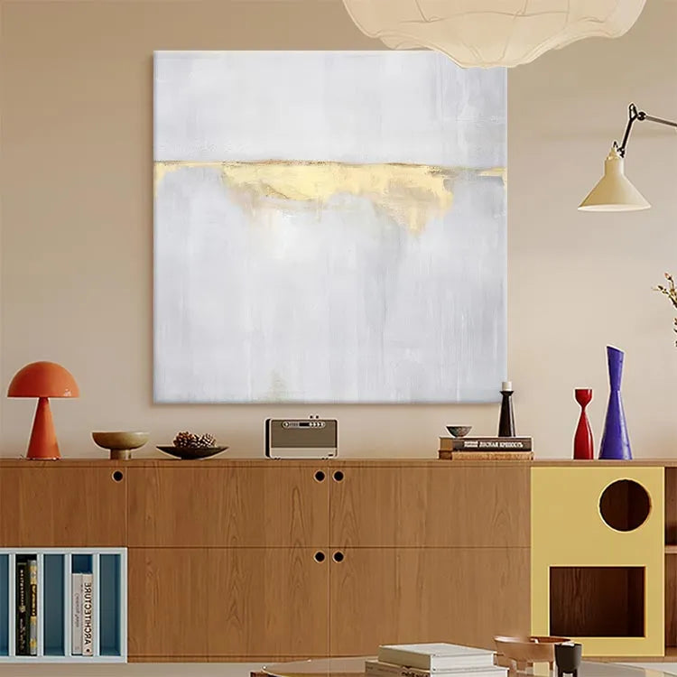 This oil painting exemplifies a minimalist and abstract style, characterized by its restrained color palette and subtle textures. The composition features a horizontal band of yellow, which appears to be a thin, uneven layer of paint, set against a predominantly white and light gray background. The yellow band, with its rough, brushstroke edges, suggests a sense of fragility and impermanence. The use of light and shadow is minimal, focusing instead on the texture of the brushstrokes, which adds a tactile quality to the otherwise smooth surface. The painting's simplicity and the delicate interplay between the yellow and white evoke a contemplative mood, aligning it with the principles of modern abstract art. The overall effect is one of quiet elegance and introspection.