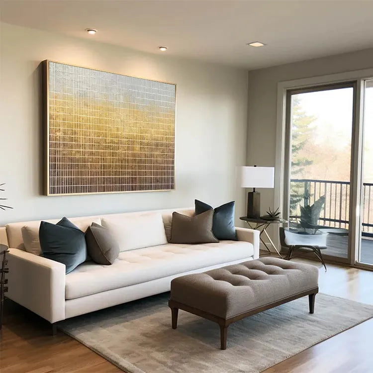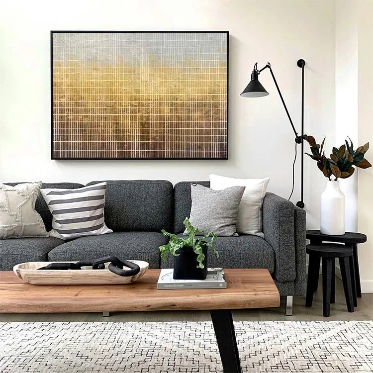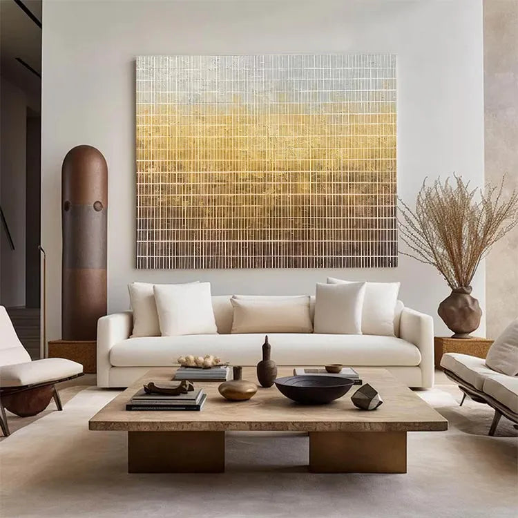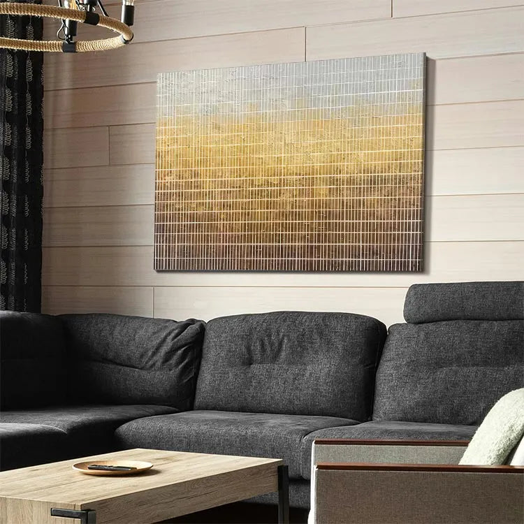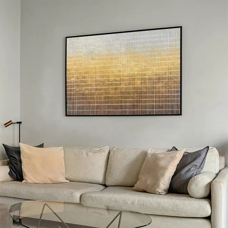 This oil painting presents a grid-like composition with vertical lines creating a repetitive, almost industrial pattern. The color gradient transitions from a pale gray at the top to a warm, golden brown at the bottom, suggesting a sunset or a natural light source. The texture appears slightly rough, with visible wear and tear, adding a sense of age and imperfection. The subtle blending of colors and the linear structure evoke Minimalism, emphasizing simplicity and form. The use of light and texture adds depth, while the grid pattern introduces a sense of order and repetition. The overall effect is both serene and contemplative.