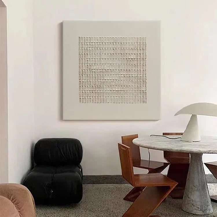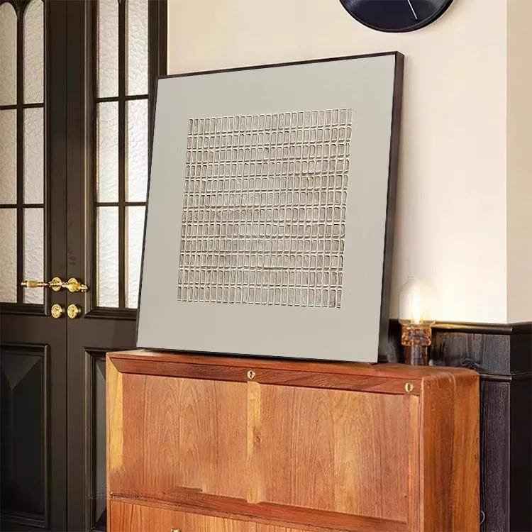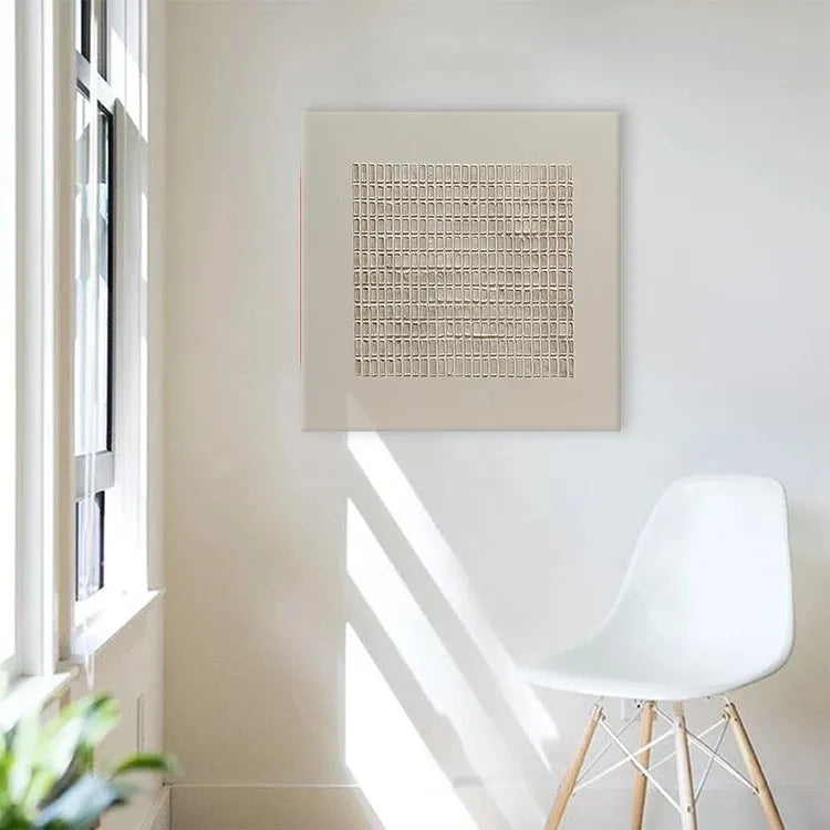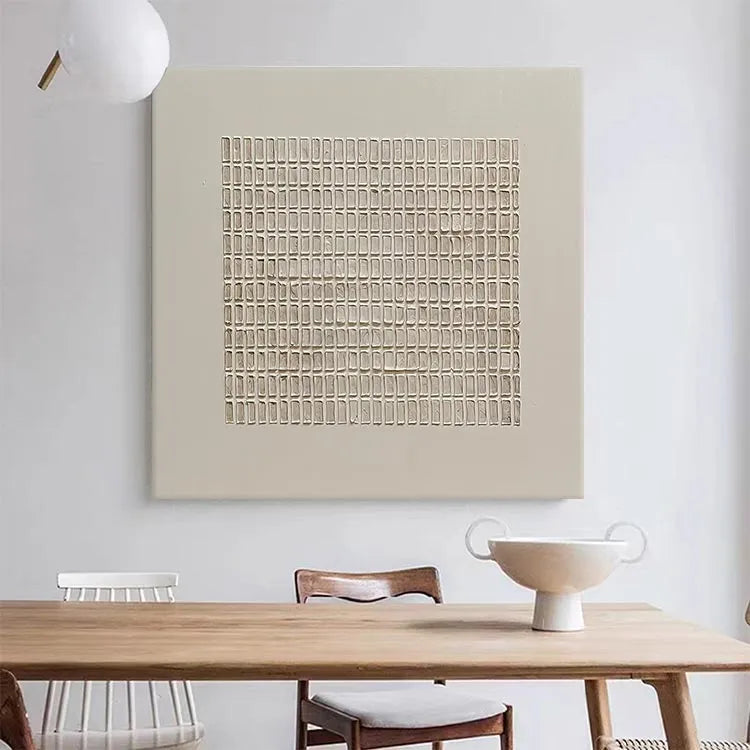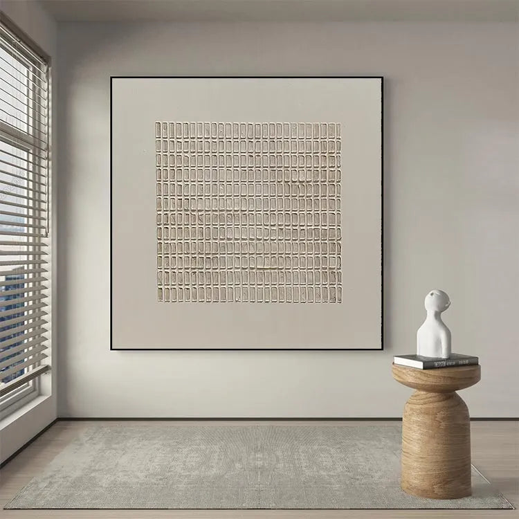 This artwork presents a minimalist, grid-like composition characterized by its uniformity and repetitive pattern. The use of a beige, textured surface creates a subtle contrast with the smooth, white background, emphasizing the grid's three-dimensional quality. The grid itself consists of small, rectangular recesses, each with slightly raised edges, suggesting a tactile, almost architectural form. This piece aligns with the principles of Minimalism, focusing on simplicity and the inherent beauty of geometric forms. The uniform color palette and repetitive pattern evoke a sense of order and precision, while the texture adds depth and a sense of physicality. The overall effect is one of calm, controlled elegance, inviting the viewer to contemplate the intersection of form and space.