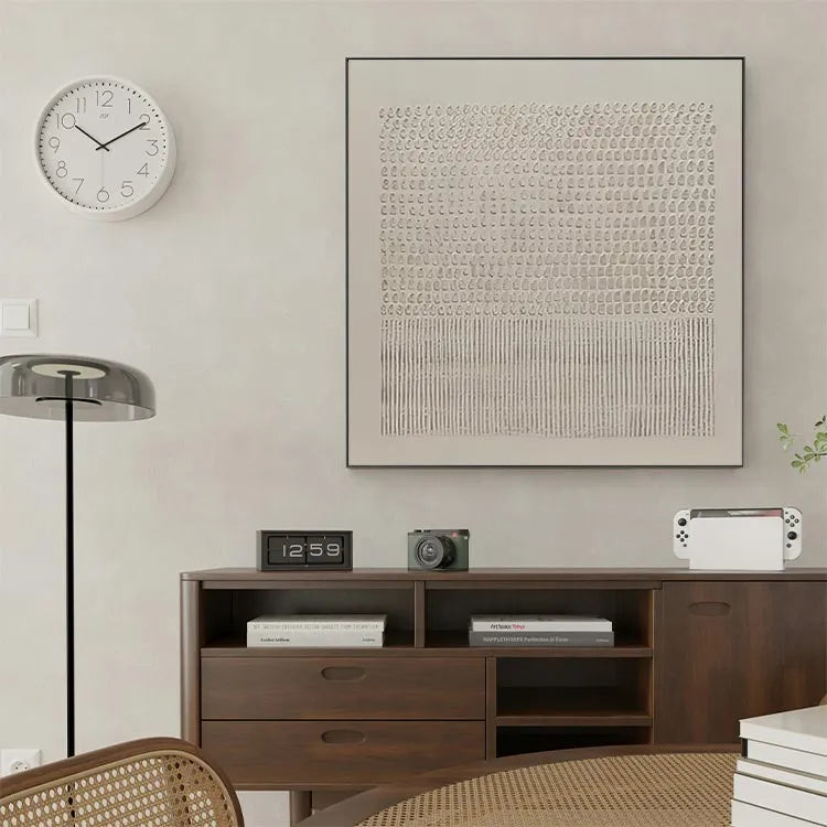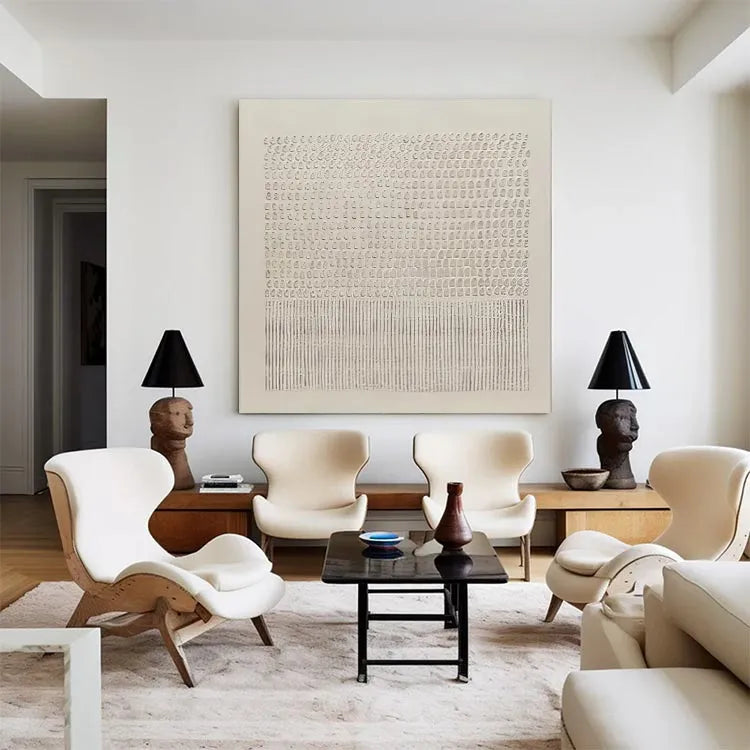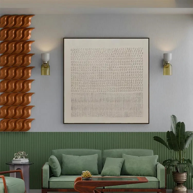 This artwork, characterized by its minimalist and abstract style, features a repetitive pattern of circular and linear shapes, creating a textured, three-dimensional effect. The use of a monochromatic beige palette enhances the subtle, almost tactile quality of the composition. The upper section's circular motifs resemble a delicate, lace-like overlay, while the lower section's vertical lines introduce a sense of rhythm and movement. The artist employs a restrained, yet precise technique, reminiscent of the minimalist movement, focusing on form and texture rather than color or emotion. The interplay between the soft circular patterns and the more pronounced linear elements suggests a balance between stability and fluidity, inviting the viewer to explore the intricacies of the design.