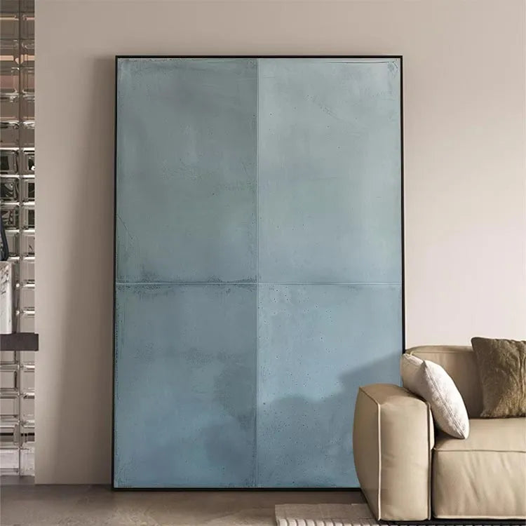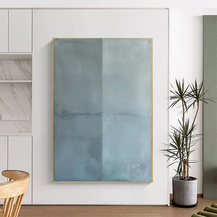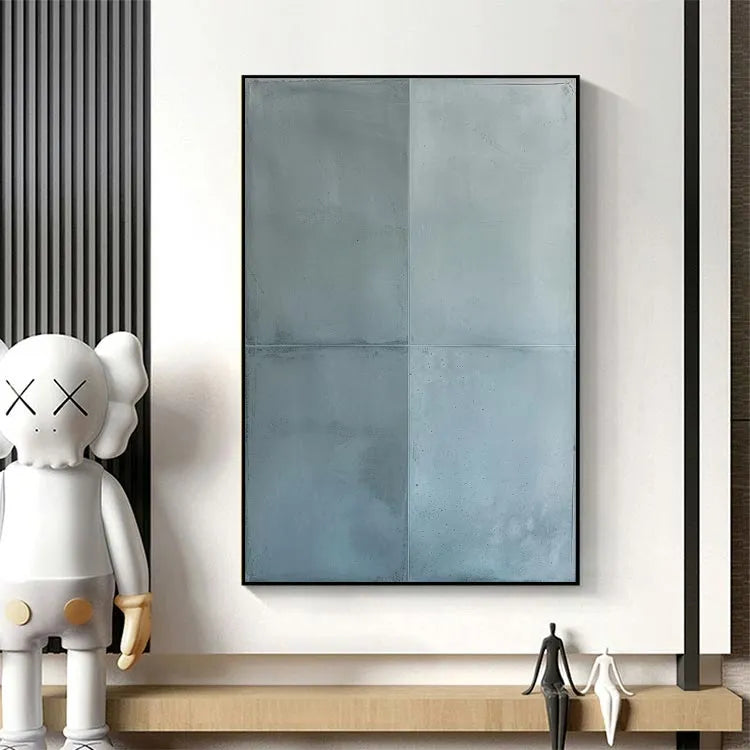 This painting features a minimalist, abstract composition characterized by a muted, monochromatic palette of blues and grays. The four quadrants, separated by subtle, horizontal and vertical lines, create a grid-like structure, evoking a sense of geometric order. The texture appears smooth yet subtly weathered, with gentle, diffuse light enhancing the soft gradients. The artist employs a restrained, almost ethereal color range, emphasizing calmness and introspection. The subtle variations in hue and the faint, almost imperceptible brushstrokes suggest a contemporary, abstract style, aligning with movements such as Minimalism and Abstract Expressionism. The overall effect is one of serene, meditative simplicity, inviting the viewer to contemplate the interplay between form and space.