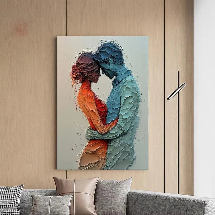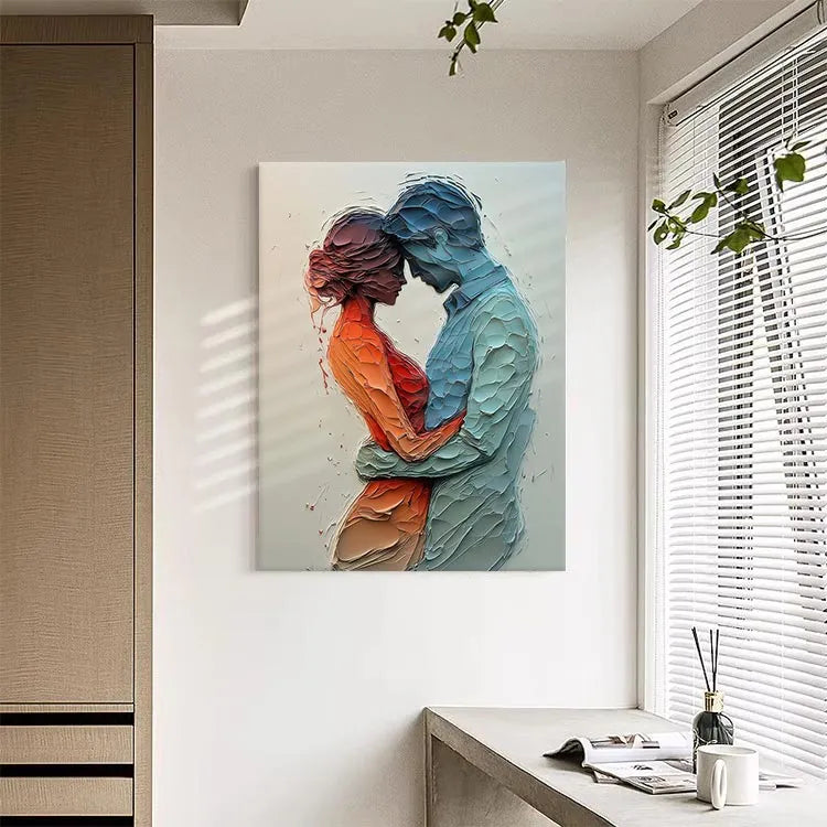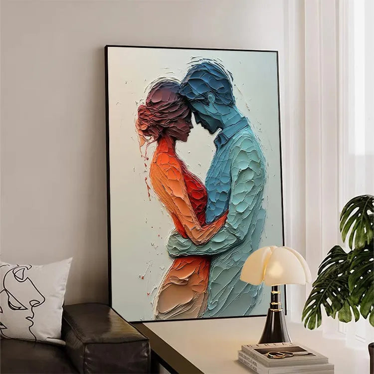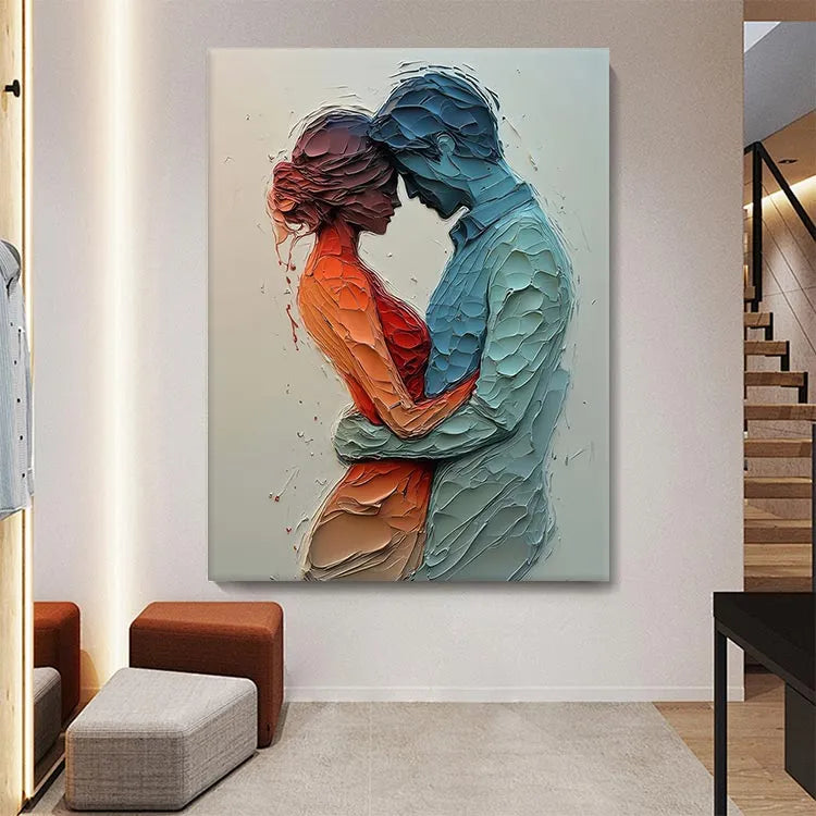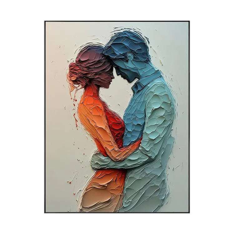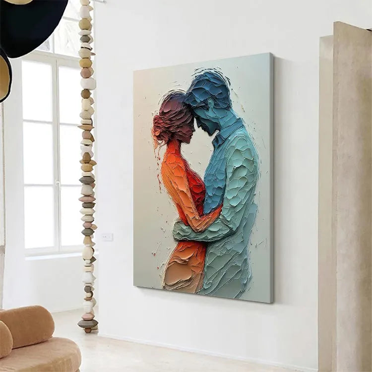 This painting employs a highly textured, three-dimensional style, reminiscent of contemporary mixed media art. The use of layered, pebble-like textures creates a tactile, almost sculptural effect. The color palette contrasts warm, orange-reds with cool, blue tones, symbolizing the emotional intimacy between the two figures. The figures are rendered in profile, emphasizing their connection through a gentle, almost tender embrace. The light source is subtle, with soft gradients enhancing the depth and texture. The abstract, organic forms and the interplay of color and texture suggest influences from both modern and abstract expressionism movements. The overall composition evokes a sense of vulnerability and mutual support.