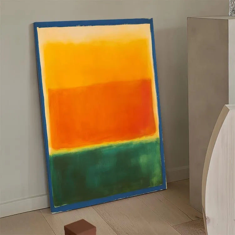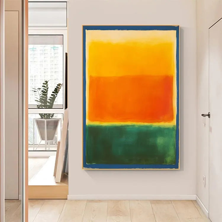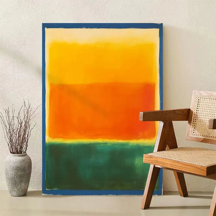 This painting exemplifies the characteristics of Abstract Expressionism, with its bold, flat color fields and lack of detailed representation. The composition is a horizontal band of yellow, orange, and green, separated by subtle gradients that create a sense of depth and movement. The thick, textured brushstrokes add a tactile quality to the painting, enhancing its expressive nature. The use of color is symbolic, evoking the warmth of sunlight and the tranquility of nature. The blue border contrasts sharply with the warm hues, drawing the viewer's eye inward. The simplicity and focus on color and texture align with the emotional and spontaneous ideals of Abstract Expressionism.