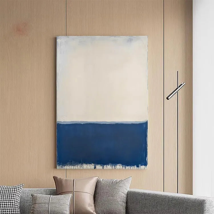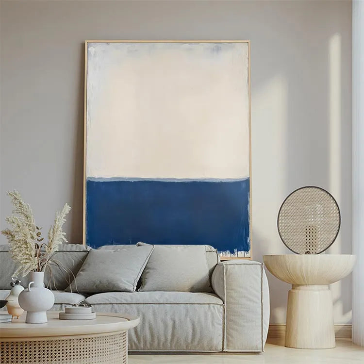 This painting exhibits a minimalist style, characterized by its restrained color palette and simplicity. The composition is divided horizontally into two distinct sections: an upper, pale beige area and a lower, deep blue band. The transition between the colors is subtle, with the blue band appearing almost as a thick, opaque brushstroke. The texture is smooth, with visible brushstrokes adding a sense of depth and movement to the lower blue area. The use of color suggests a contemplative mood, with the beige representing calmness and the blue evoking a sense of depth or mystery. This work aligns with the principles of modern abstract art, emphasizing the emotional and conceptual over the representational.