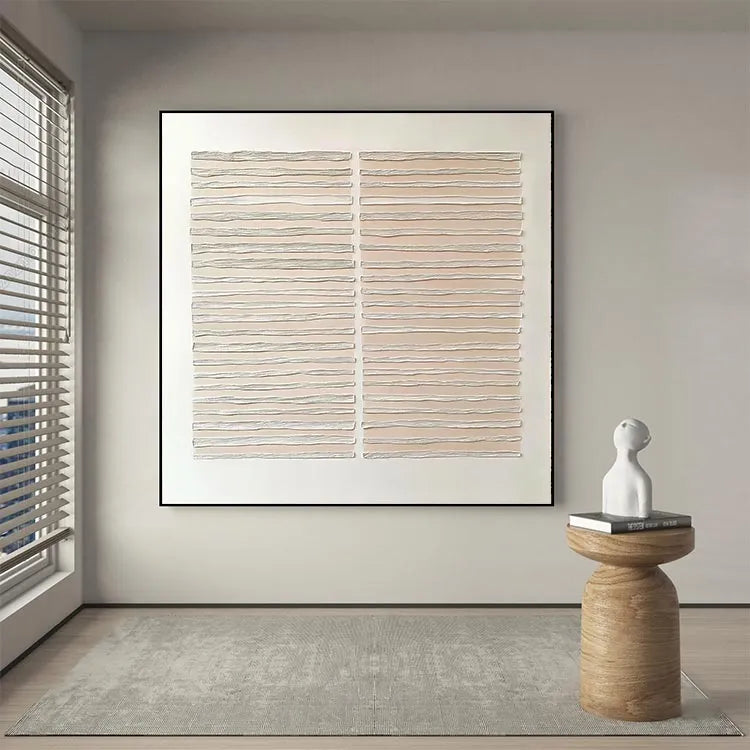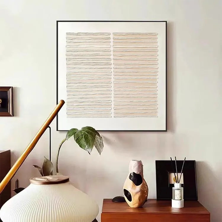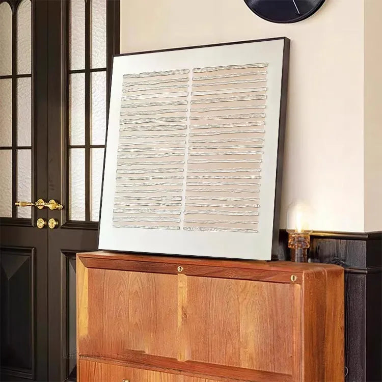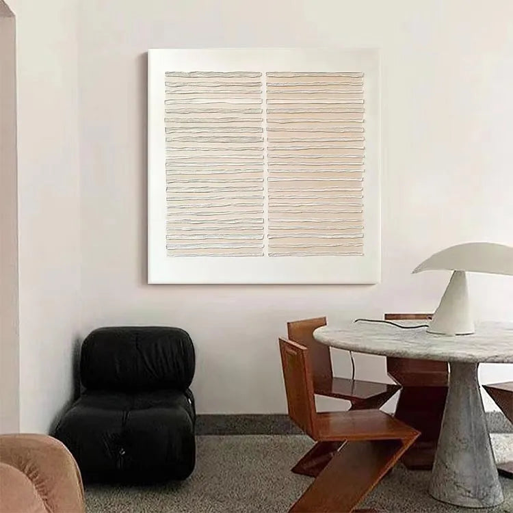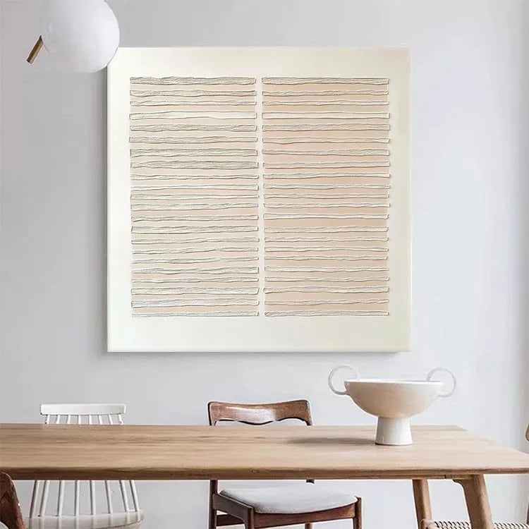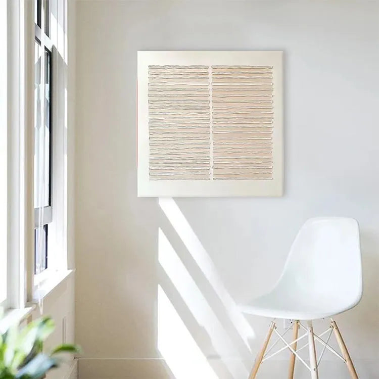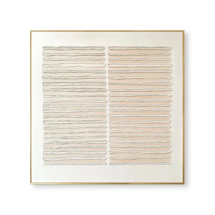 This minimalist artwork features two rectangular panels, each composed of horizontally layered, wavy lines. The use of a muted beige color palette against a stark white background creates a sense of calm and simplicity. The wavy lines, with their subtle variations in texture and thickness, evoke a sense of movement and fluidity, reminiscent of the wavy patterns found in nature or water. The composition is balanced and symmetrical, with the two panels mirroring each other, enhancing the overall harmony. This piece aligns with the principles of minimalism, focusing on form, texture, and subtle color contrasts. The texture appears to be created through a combination of relief printing and hand-carving techniques, adding a tactile quality to the visual experience.