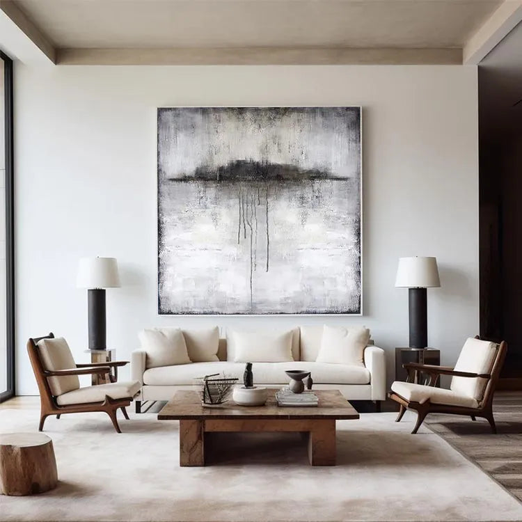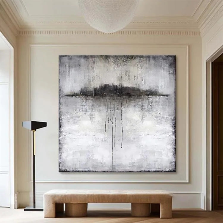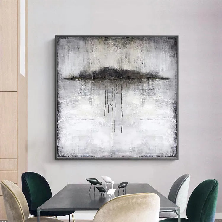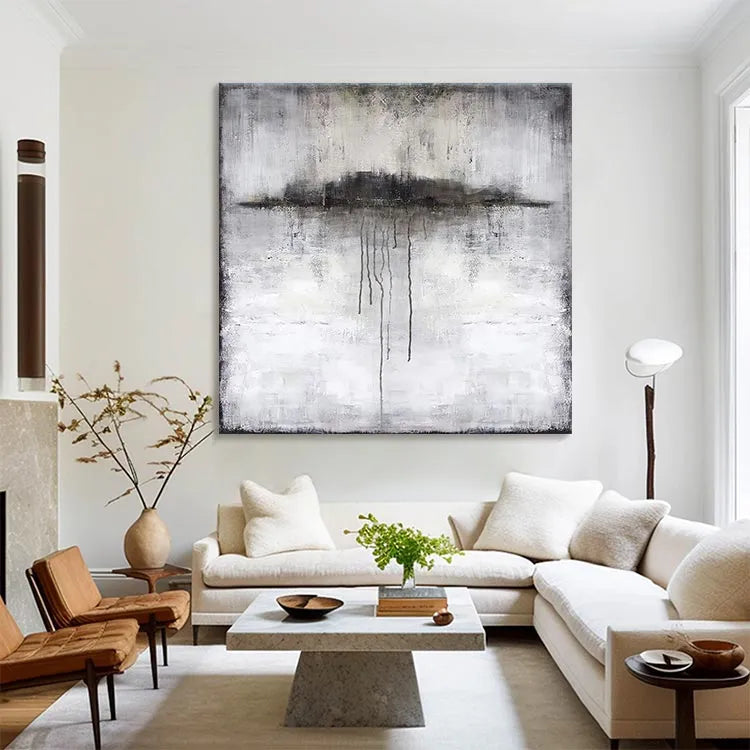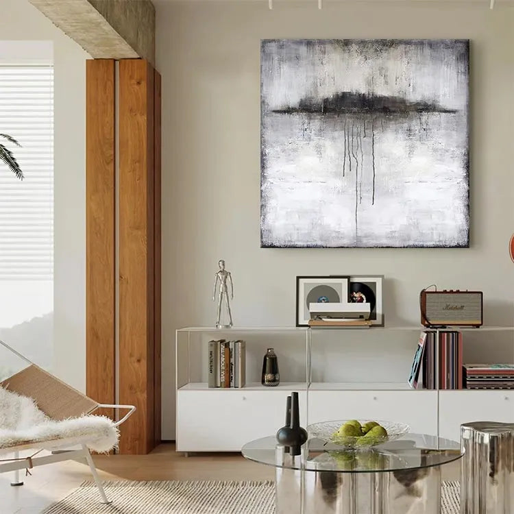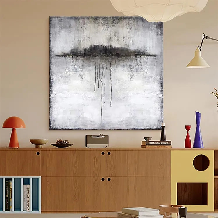 This oil painting exhibits a minimalist and abstract style, reminiscent of the Expressionist movement. The composition features a central, dark, cloud-like shape with elongated, dripping lines that suggest movement and decay. The artist employs a muted color palette dominated by grays, whites, and blacks, creating a somber and introspective mood. The texture is rough and textured, with visible brushstrokes adding a sense of depth and urgency. The use of light is subtle, with the darker elements drawing the viewer's eye toward the center. The painting's symbolism may explore themes of melancholy, impermanence, or the passage of time. The overall effect is haunting and contemplative, inviting the viewer to ponder its deeper meanings.