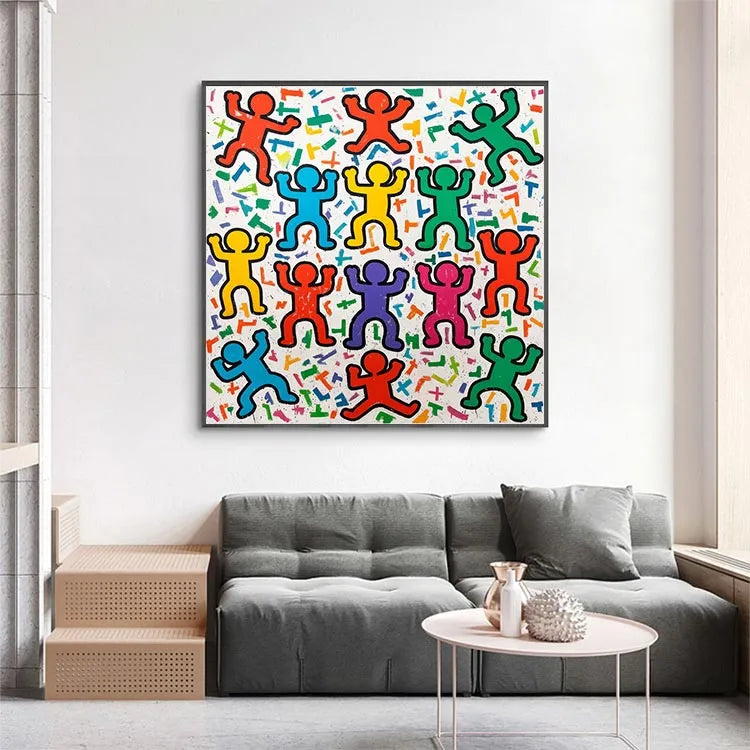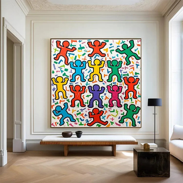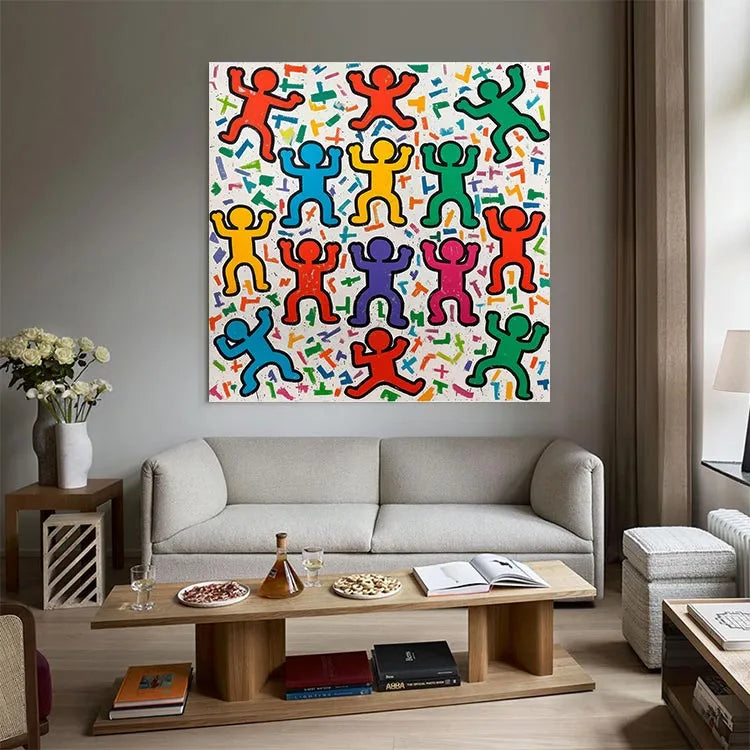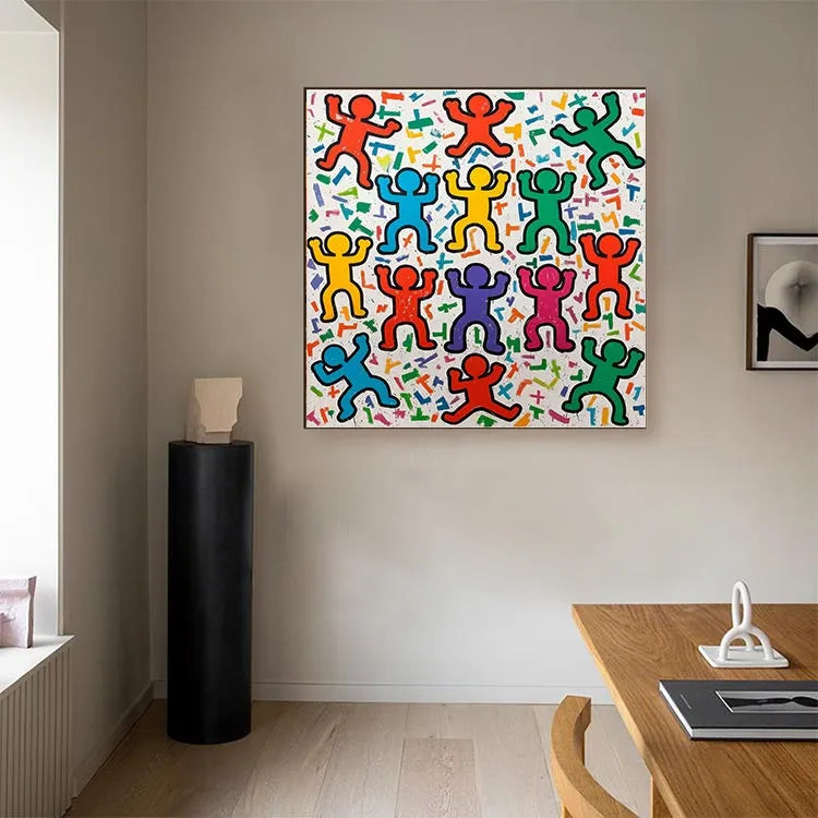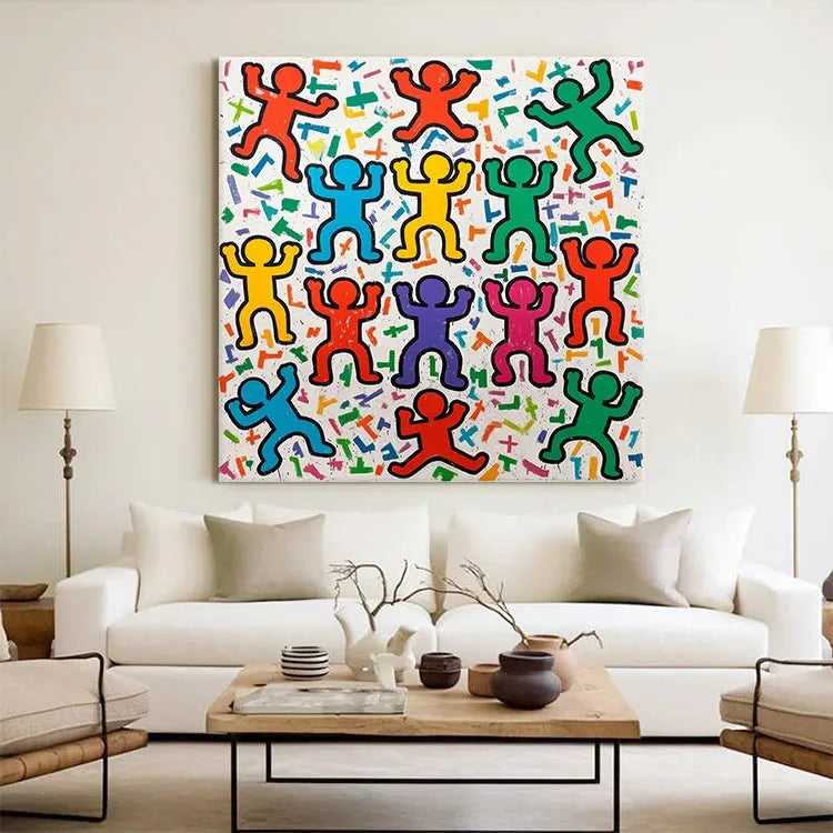 This vibrant painting features a grid-like arrangement of stylized, abstract human figures with raised arms, reminiscent of Pop Art. The use of bold, primary colors—red, yellow, blue, green, purple, and pink—creates a dynamic, celebratory atmosphere. The figures are outlined in black, emphasizing their form against a white background scattered with colorful, geometric shapes. The texture appears smooth, with a slightly grainy finish. The repetitive, uniform pattern and the use of bright, flat colors suggest influences from both Pop Art and Abstract Expressionism. The composition's symmetry and the figures' uniformity evoke a sense of unity and collective joy. The playful, energetic style is both nostalgic and contemporary.