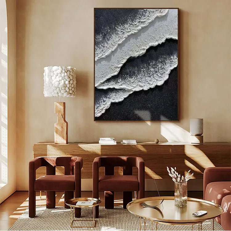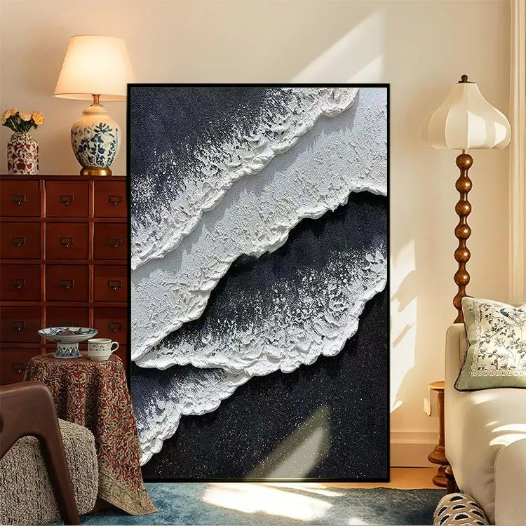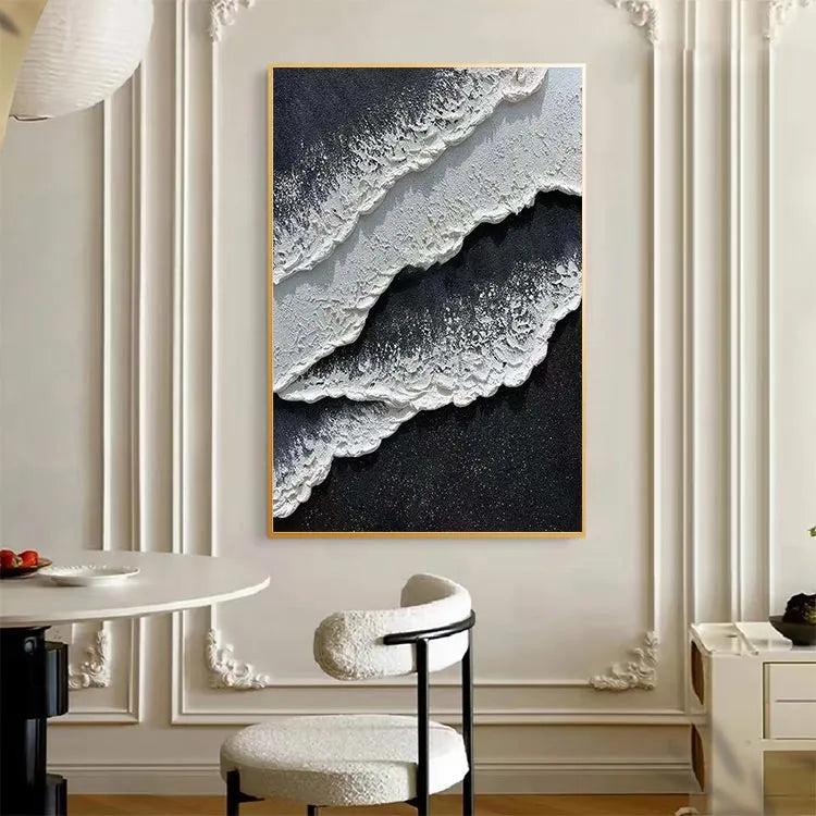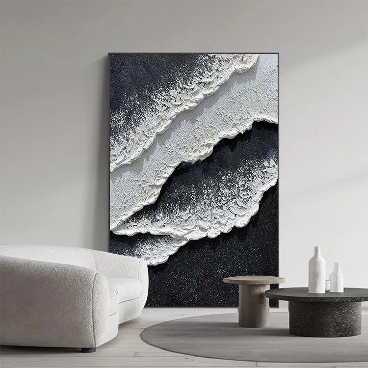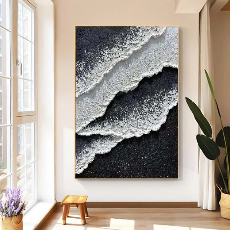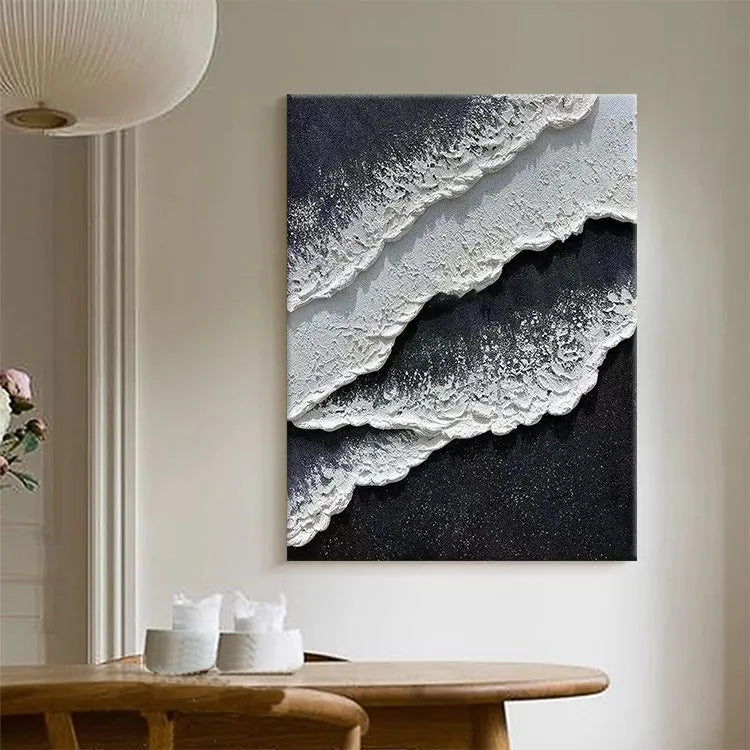 This oil painting presents a dynamic, abstract composition characterized by overlapping waves of textured white and dark gray layers. The use of color is minimal yet effective, with the stark contrast between the white and dark gray creating a sense of depth and movement. The textured brushstrokes evoke the natural patterns of ocean waves, adding a tactile quality to the piece. The light source is subtle, with the white layers reflecting a gentle luminosity, suggesting the interplay of sunlight on water. The style is reminiscent of Abstract Expressionism, with its emphasis on texture and form over realistic representation. The overall effect is both calming and dynamic, inviting viewers to contemplate the ephemeral beauty of natural phenomena.