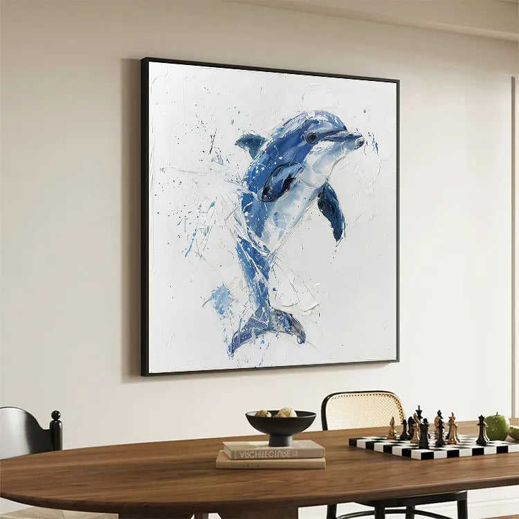 This oil painting of a dolphin features a dynamic, abstract style with visible brushstrokes and splatters, creating a sense of movement and fluidity. The artist uses a limited color palette of blues and whites, emphasizing the dolphin's aquatic nature. The textured, layered application of paint adds depth and a sense of realism, while the splatters suggest the dolphin's energetic leap. The composition is balanced, with the dolphin's body forming a diagonal line across the canvas, guiding the viewer's eye through the piece. This work may belong to the Abstract Expressionism movement, with its emphasis on spontaneity and emotional expression. The use of light and color effectively conveys the dolphin's graceful and lively nature.