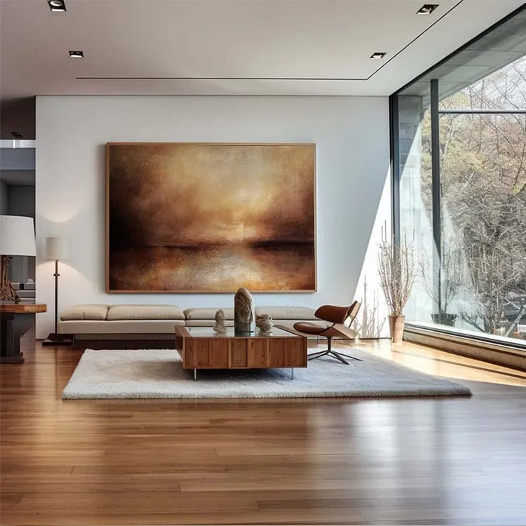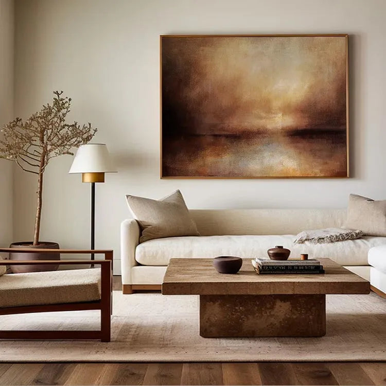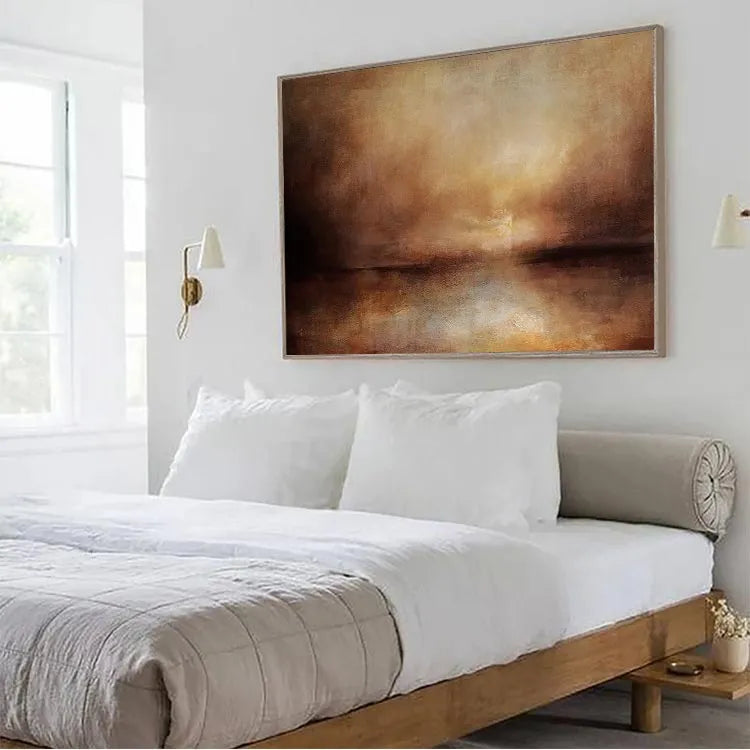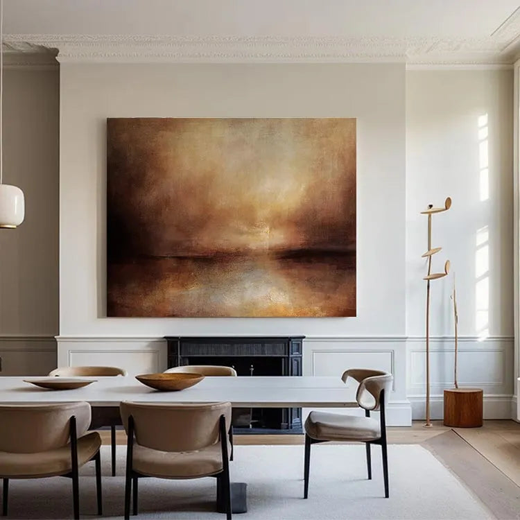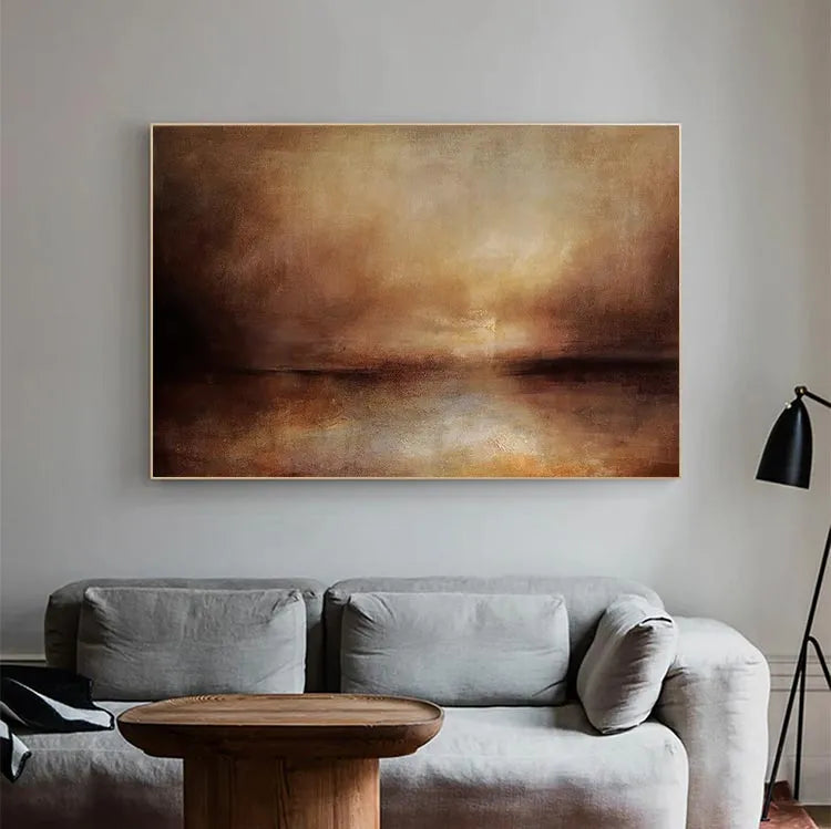 This oil painting exemplifies the characteristics of the Romantic movement, with its emphasis on emotion and the sublime. The composition employs a gradient of warm, earthy tones—browns, oranges, and yellows—creating a sense of depth and mystery. The use of light is subtle, with a central, diffuse glow suggesting a distant, ethereal source, possibly the sun or moon. The texture is rich and layered, with visible brushstrokes adding a tactile quality to the surface. The blending of colors and the soft, almost misty edges evoke a dreamlike, introspective mood. The lack of distinct forms or figures allows the viewer to project their own interpretations, enhancing the painting's symbolic and emotional resonance.