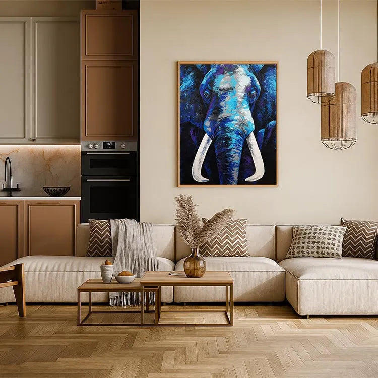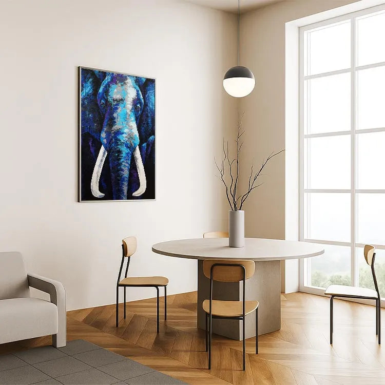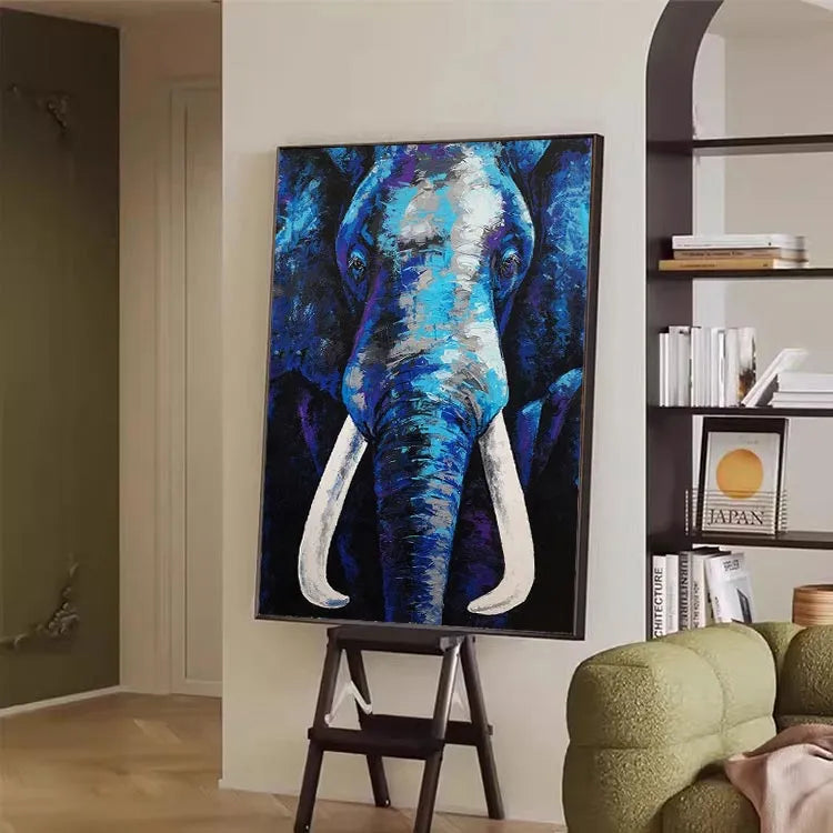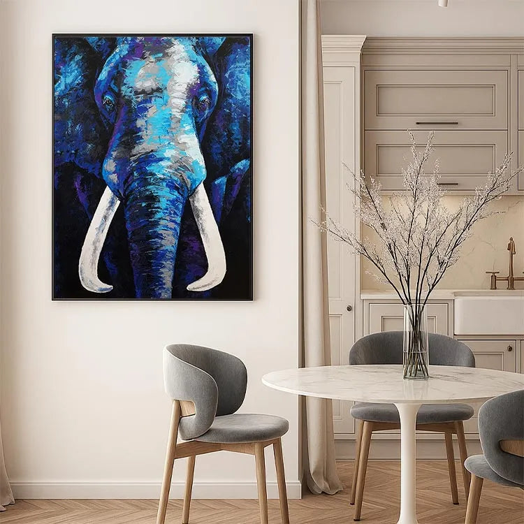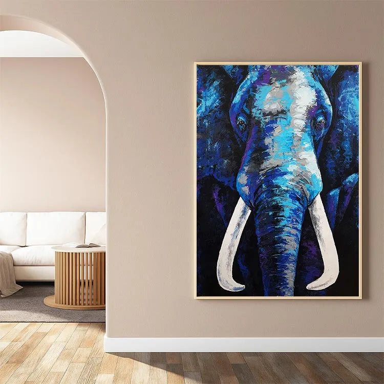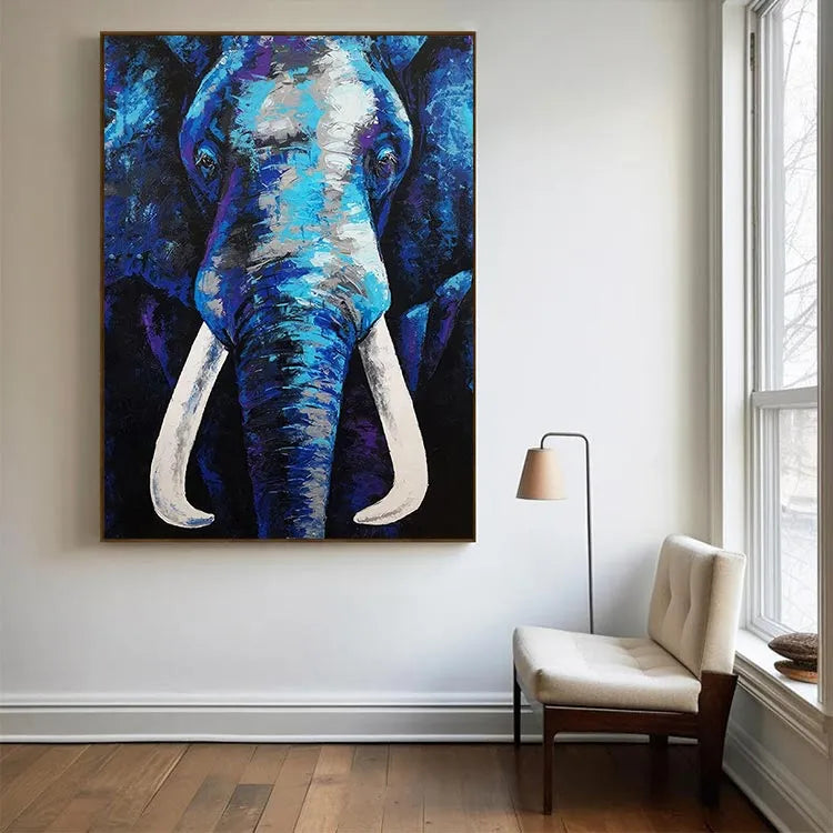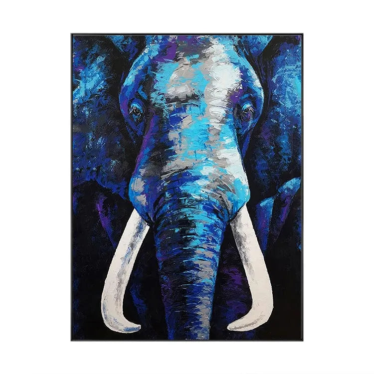 This oil painting of an elephant, characterized by its vibrant use of blue, purple, and white hues, exhibits a modern, abstract style. The textured brushstrokes create a dynamic, almost chaotic visual effect, while the elephant's prominent white tusks serve as a focal point. The artist employs a limited but intense color palette, emphasizing the cool tones of blue and purple against the stark white of the tusks, suggesting a contrast between the natural and the surreal. The elephant's eyes, rendered with dark, subtle tones, draw the viewer's attention, adding a sense of mystery. The painting's composition, with its centered, symmetrical focus, suggests influence from both realism and abstract expressionism. The textured brushwork adds a tactile quality, enhancing the painting's emotional depth and visual interest.