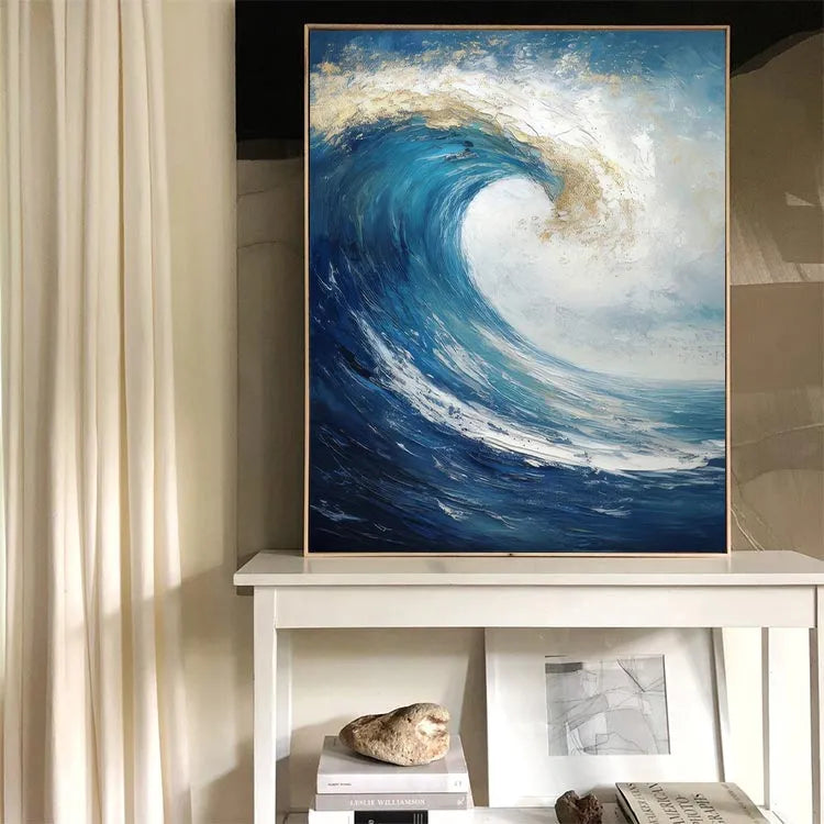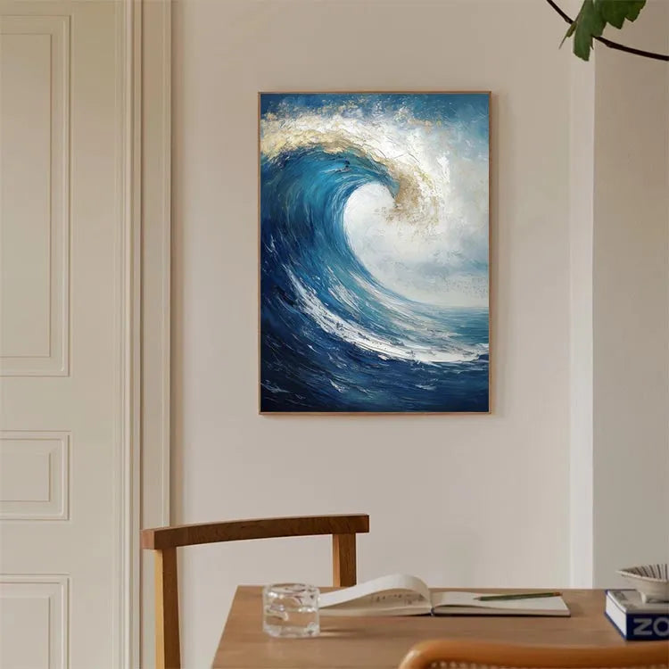 This painting captures the dynamic movement of a powerful ocean wave, employing a blend of realism and impressionism. The artist uses a vibrant color palette dominated by deep blues and whites, with golden accents that suggest the sun's reflection on the wave's crest. The brushstrokes are fluid and expressive, creating a sense of motion and energy. The composition centers on the wave's curl, drawing the viewer's eye into its swirling form. The use of light and color effectively conveys the wave's intensity and the ocean's vastness. The texture of the brushstrokes adds a tactile quality, enhancing the painting's realism while maintaining an impressionistic style. This work may be associated with modern realism, emphasizing natural phenomena's beauty and power.