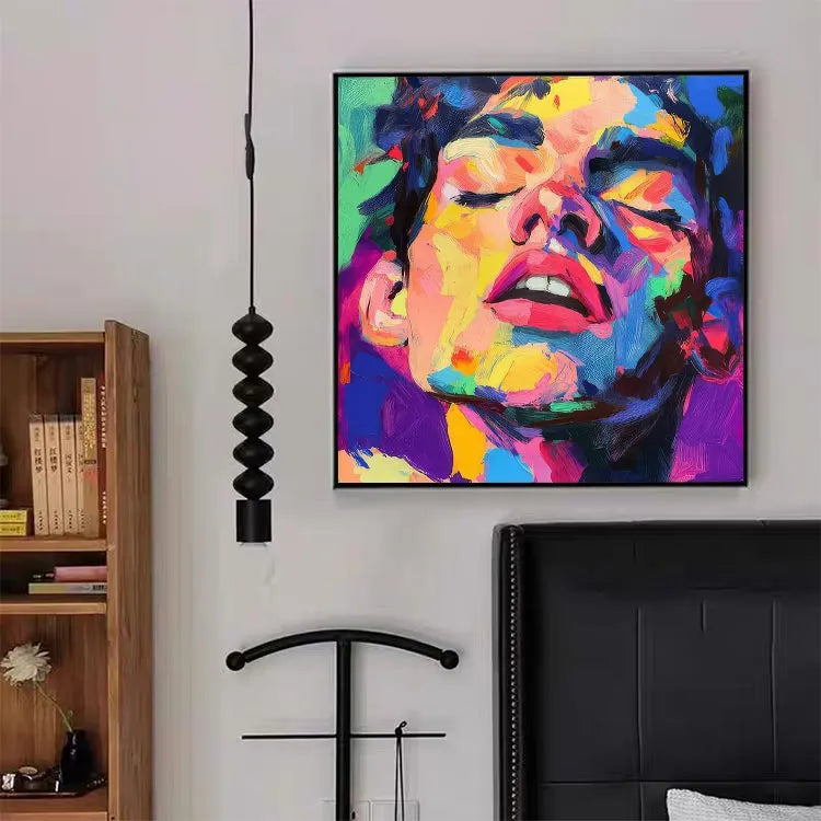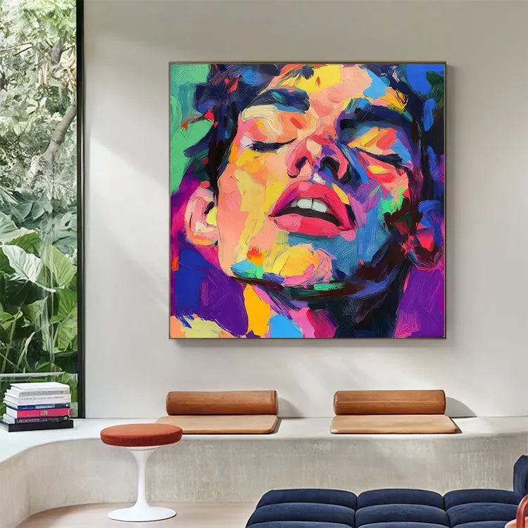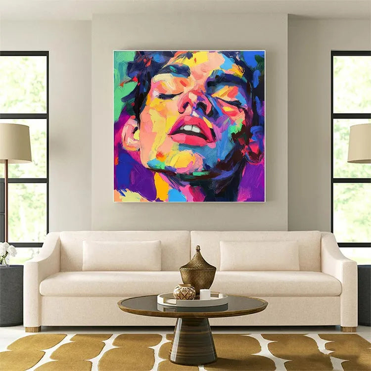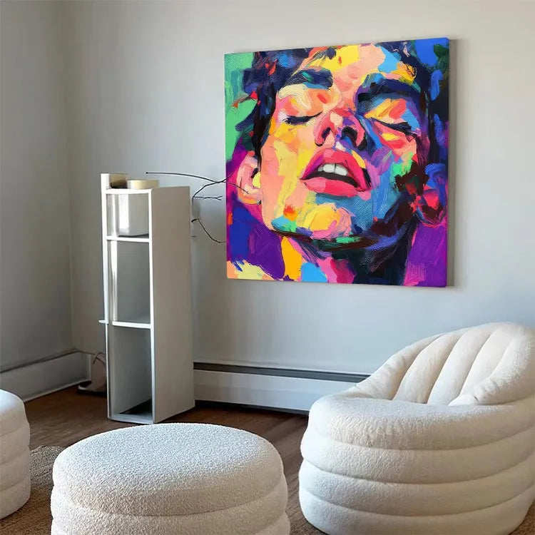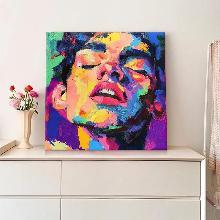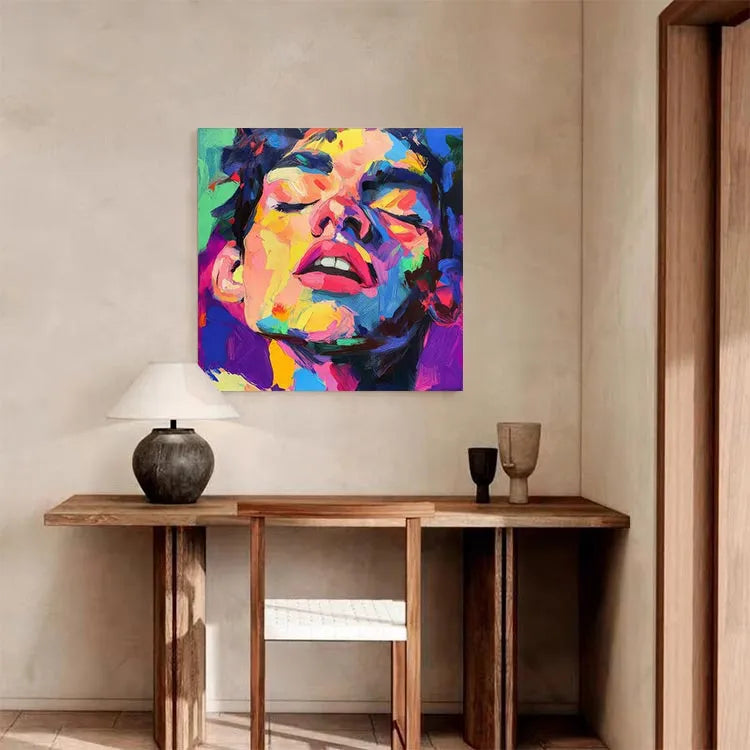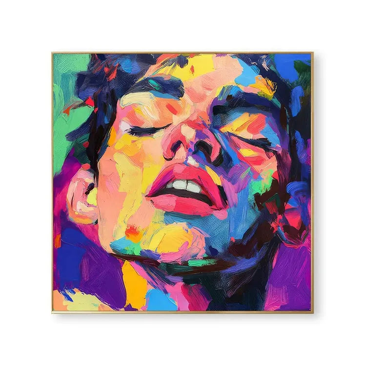 This vibrant painting, likely influenced by the Abstract Expressionism movement, employs a bold, expressive style with thick, dynamic brushstrokes. The use of vivid, contrasting colors—primarily pinks, blues, yellows, and purples—creates a sense of emotional intensity and complexity. The face, rendered with a mix of realism and abstraction, is characterized by closed eyes and slightly parted lips, suggesting a state of introspection or ecstasy. The texture of the brushstrokes adds a tactile quality, enhancing the painting's emotional depth. The lack of defined outlines and the chaotic yet harmonious color palette evoke a sense of inner turmoil and multifaceted emotion, aligning with the expressive goals of Abstract Expressionism.