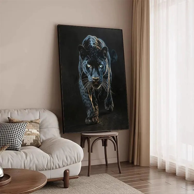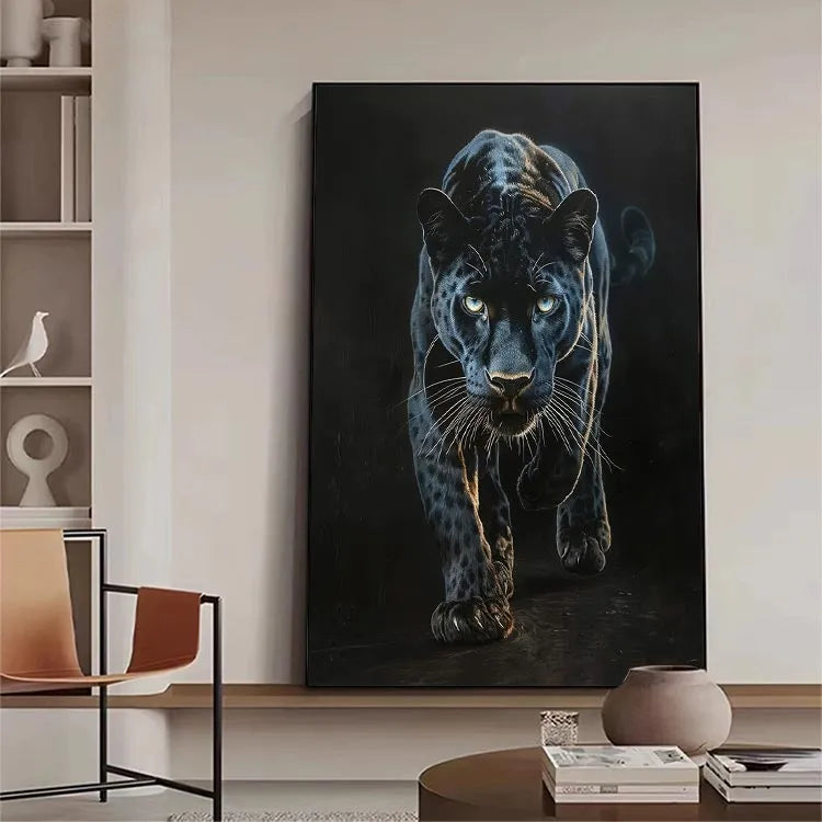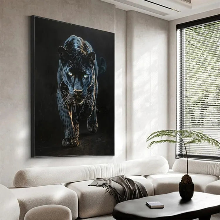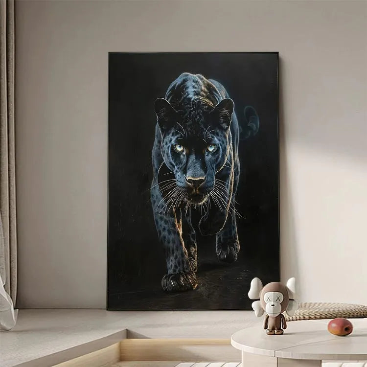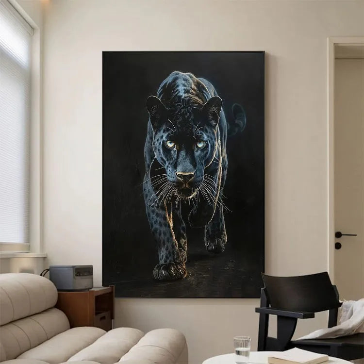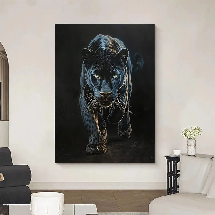 This oil painting of a black panther captures the animal's intense, predatory gaze and muscular form with striking realism. The artist employs a dark, almost monochromatic palette, emphasizing the panther's sleek, spotted coat with subtle highlights that suggest the play of light and shadow. The use of chiaroscuro enhances the panther's three-dimensional presence, drawing the viewer's eye to its piercing, luminous eyes. The texture of the brushstrokes is smooth yet visible, adding a tactile quality to the fur. This work aligns with the realism movement, focusing on detailed, lifelike representations. The panther's forward motion and focused expression evoke a sense of power and danger, symbolizing the untamed wilderness.