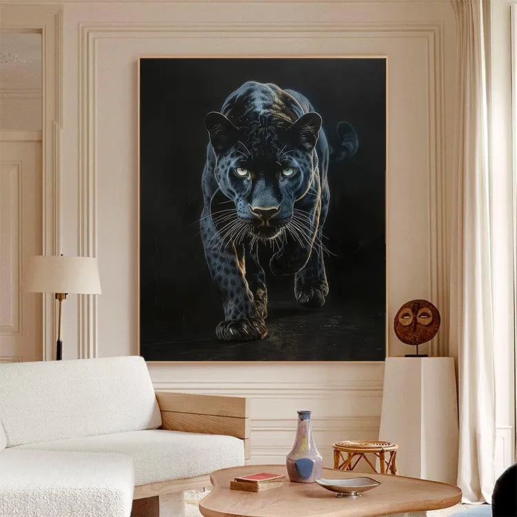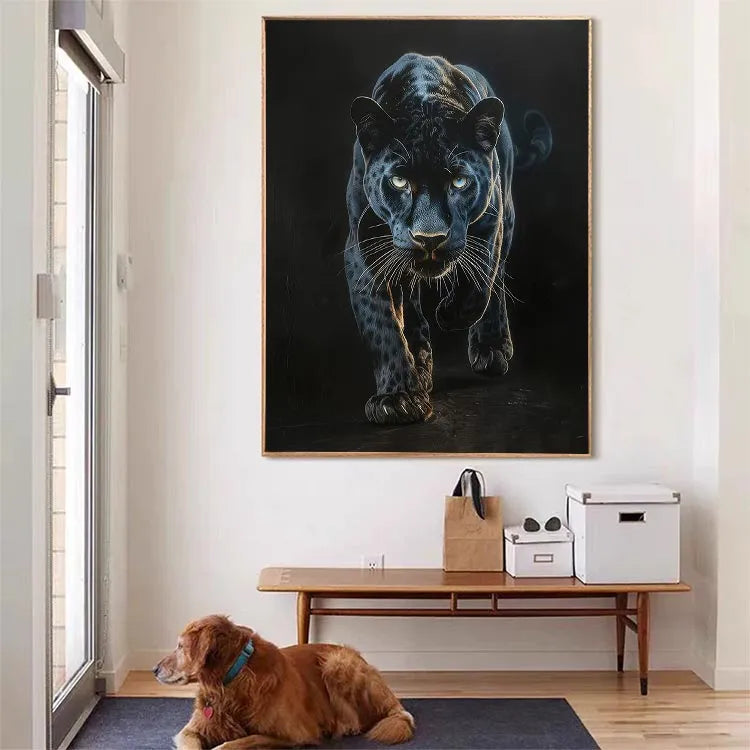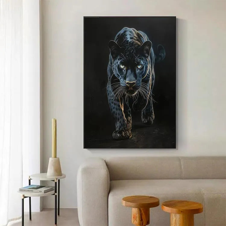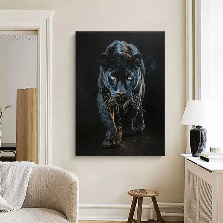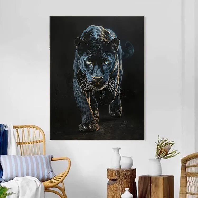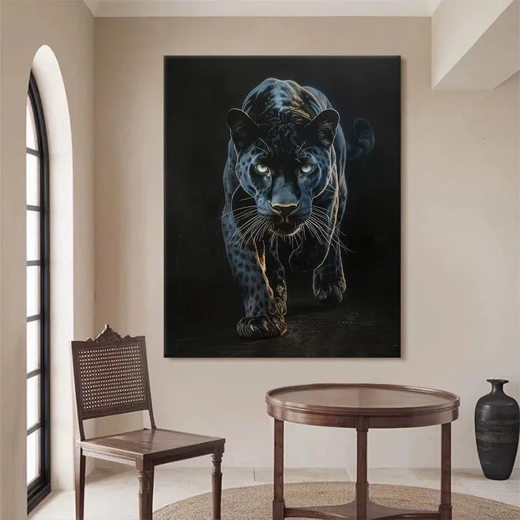 This digital painting of a black panther exudes a realistic yet stylized approach, blending photorealism with a touch of fantasy. The artist employs a striking use of light and shadow, creating a dramatic, almost luminescent effect on the panther's fur, which is meticulously detailed with dark, intricate spots. The panther's intense, glowing eyes draw the viewer's focus, symbolizing power and vigilance. The dark, nearly black background enhances the subject's prominence, emphasizing the creature's predatory nature. The use of digital effects, particularly the glowing edges and subtle highlights, suggests influence from contemporary digital art movements. The texture of the fur is rendered with precision, showcasing the artist's skill in digital brushwork. Overall, the composition is dynamic and compelling, with a strong sense of movement and intensity.