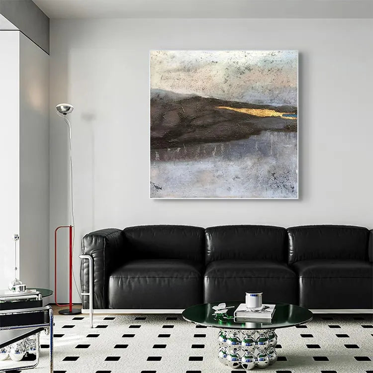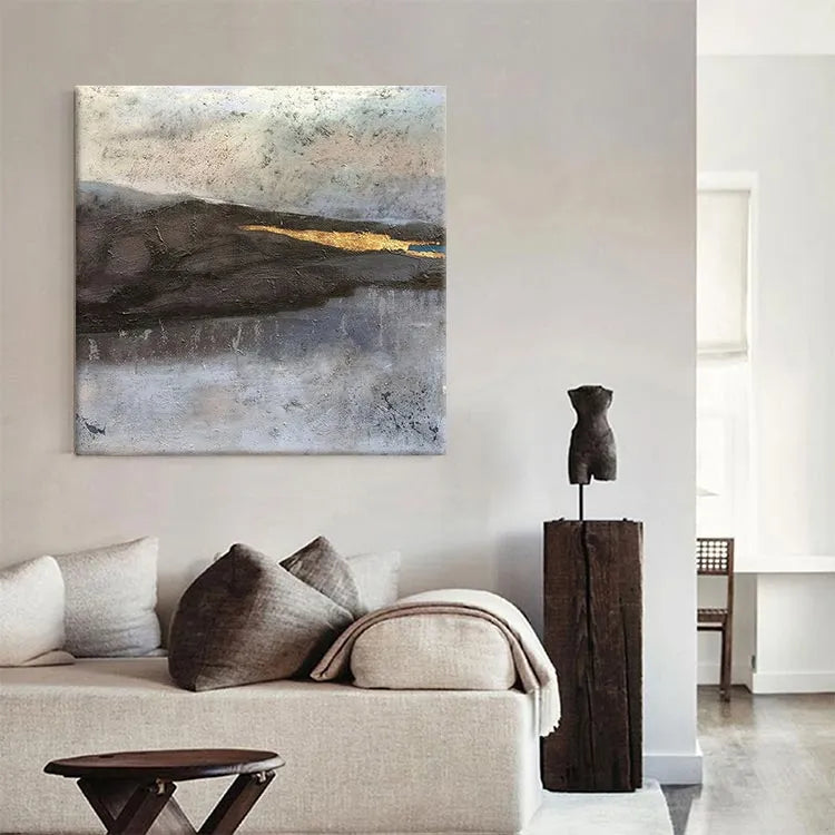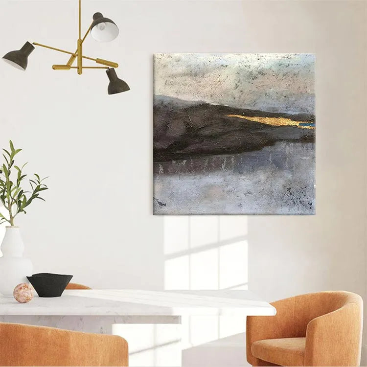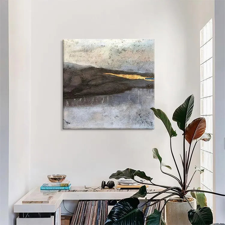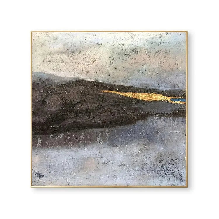 This oil painting exhibits a minimalist yet evocative style, reminiscent of the Abstract Expressionism movement. The composition is characterized by its horizontal division, with a dark, textured mountain range occupying the middle ground, contrasting against a lighter, textured sky above and a reflective water surface below. The use of color is subtle, with muted earth tones in the mountain and sky, punctuated by a striking, golden light that suggests either sunrise or sunset. This light creates a dynamic diagonal across the composition, adding depth and movement. The rough, textured brushstrokes enhance the tactile quality of the painting, while the reflective water surface introduces a sense of calm and symmetry. The overall effect is a balance between the ruggedness of nature and the tranquility of its reflection.
