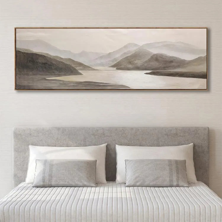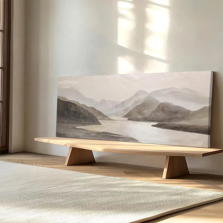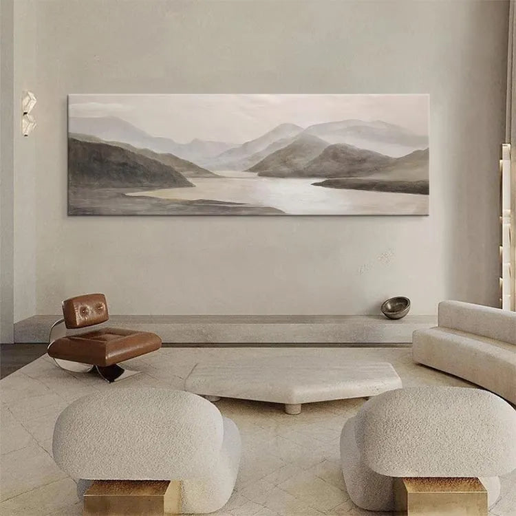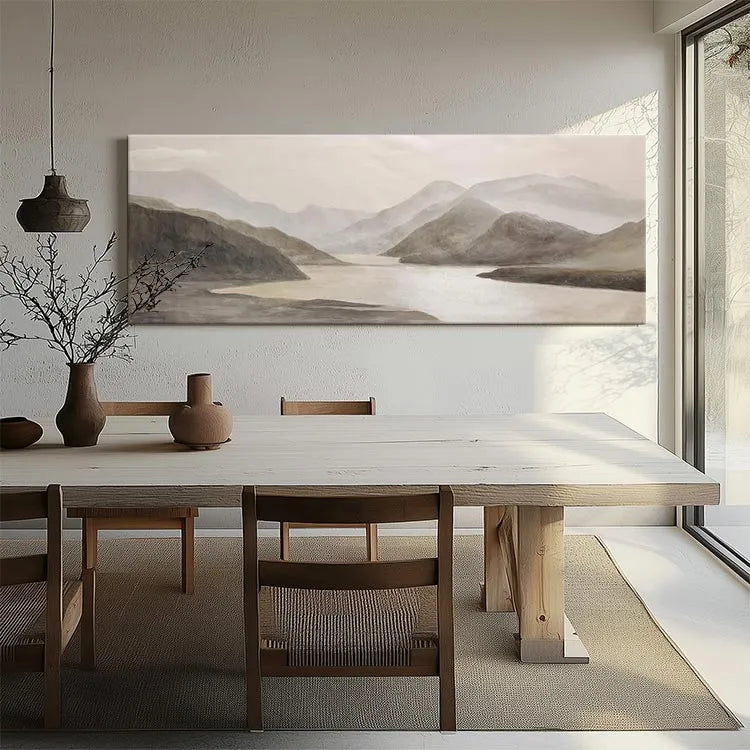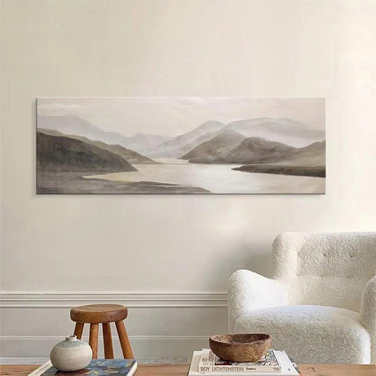 This landscape painting, likely from the Romantic or Realist movements, employs a muted, monochromatic palette dominated by shades of gray, brown, and beige. The soft, diffused light creates a hazy, ethereal atmosphere, emphasizing the misty, almost ghostly mountains that recede into the background. The gentle, smooth brushstrokes suggest a serene, tranquil mood, while the reflective, calm water in the foreground adds a sense of stillness. The composition leads the viewer's eye along the curving river, drawing attention to the central, vanishing point. The subtle gradations of color and light enhance the depth and dimensionality of the landscape, evoking a sense of quiet solitude and natural beauty. The overall effect is one of serene, contemplative beauty.